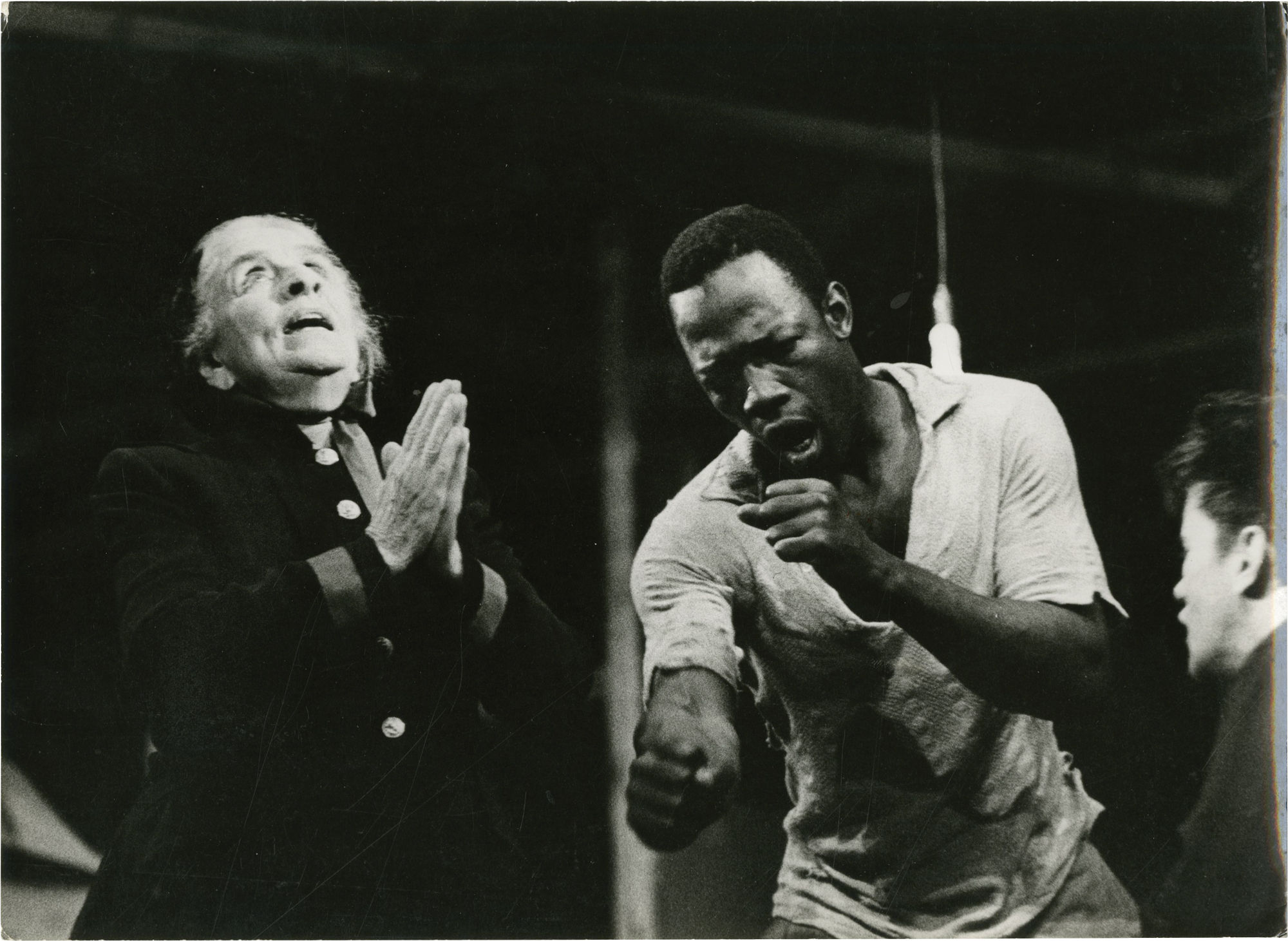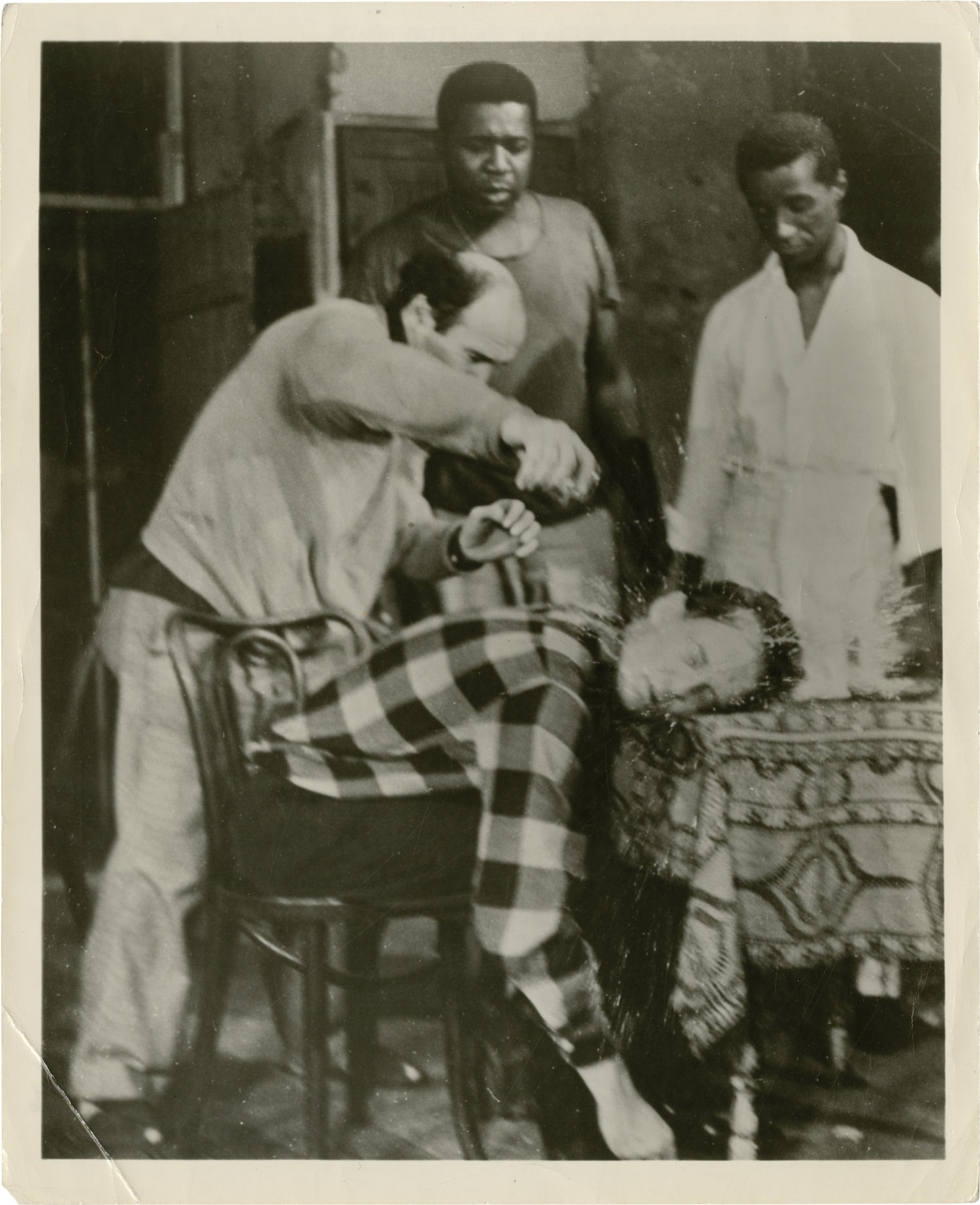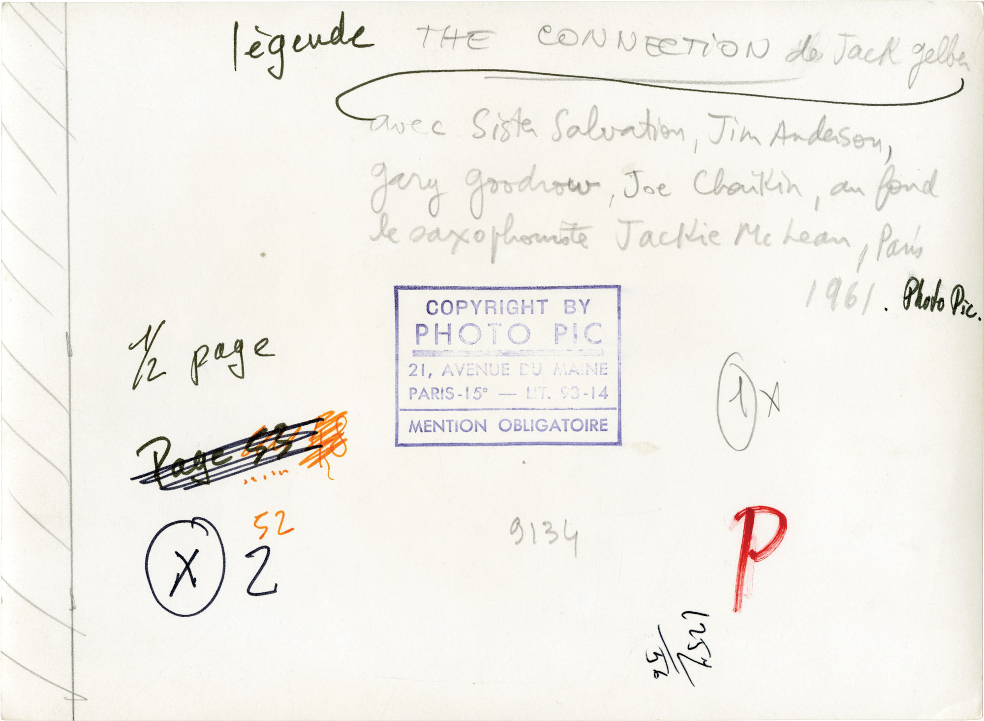 N.p.: N.p., 1959. Three vintage photographs from performances of The Living Theatre's 1959 play. One photograph from the original 1959 production, with a printed caption in English on the verso. The other two photographs from a 1961 production in Paris, with the stamp of photographer Roger Pic on the versos. All three photographs with manuscript annotations in French on the verso regarding layout and identifying the subjects of the photographs.