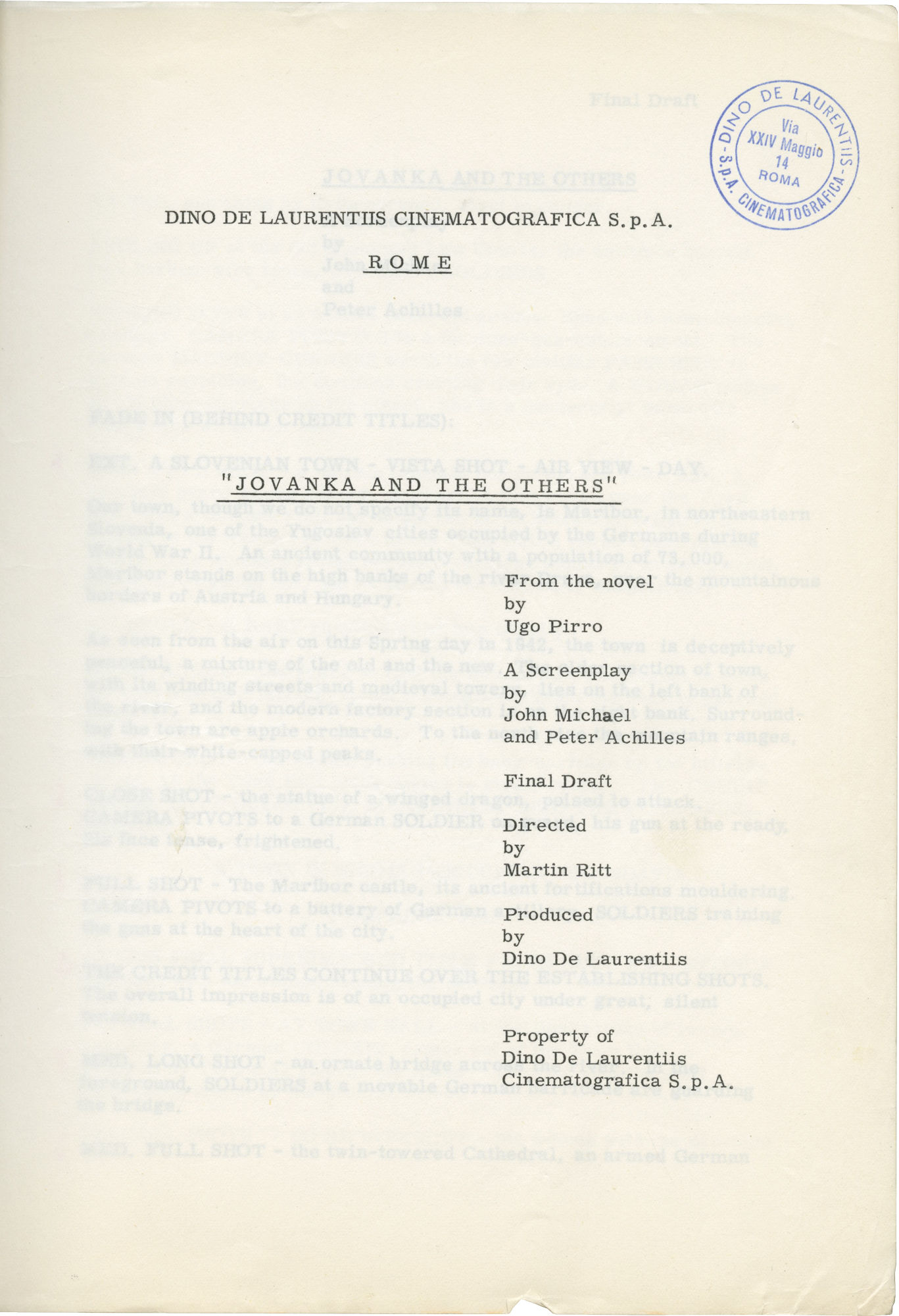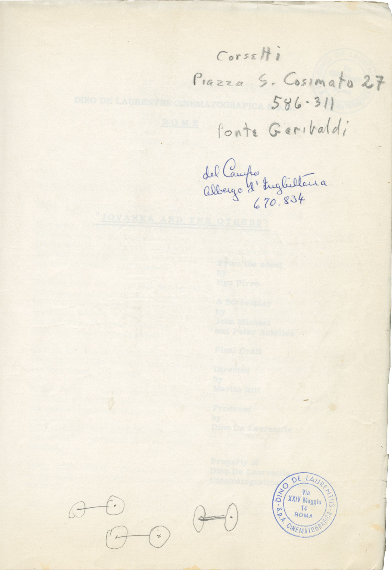Orange untitled wrappers, with the Dino De Laurentiis stamp and numerous annotations. Title page present, noted as Final Draft, with credits for screenwriters Michael and Achilles, for screenwriter Pirro, and for director Ritt. 153 leaves, mimeograph duplication, with annotations throughout. Pages Near Fine, wrapper Near Fine, internally bound with two gold brads.