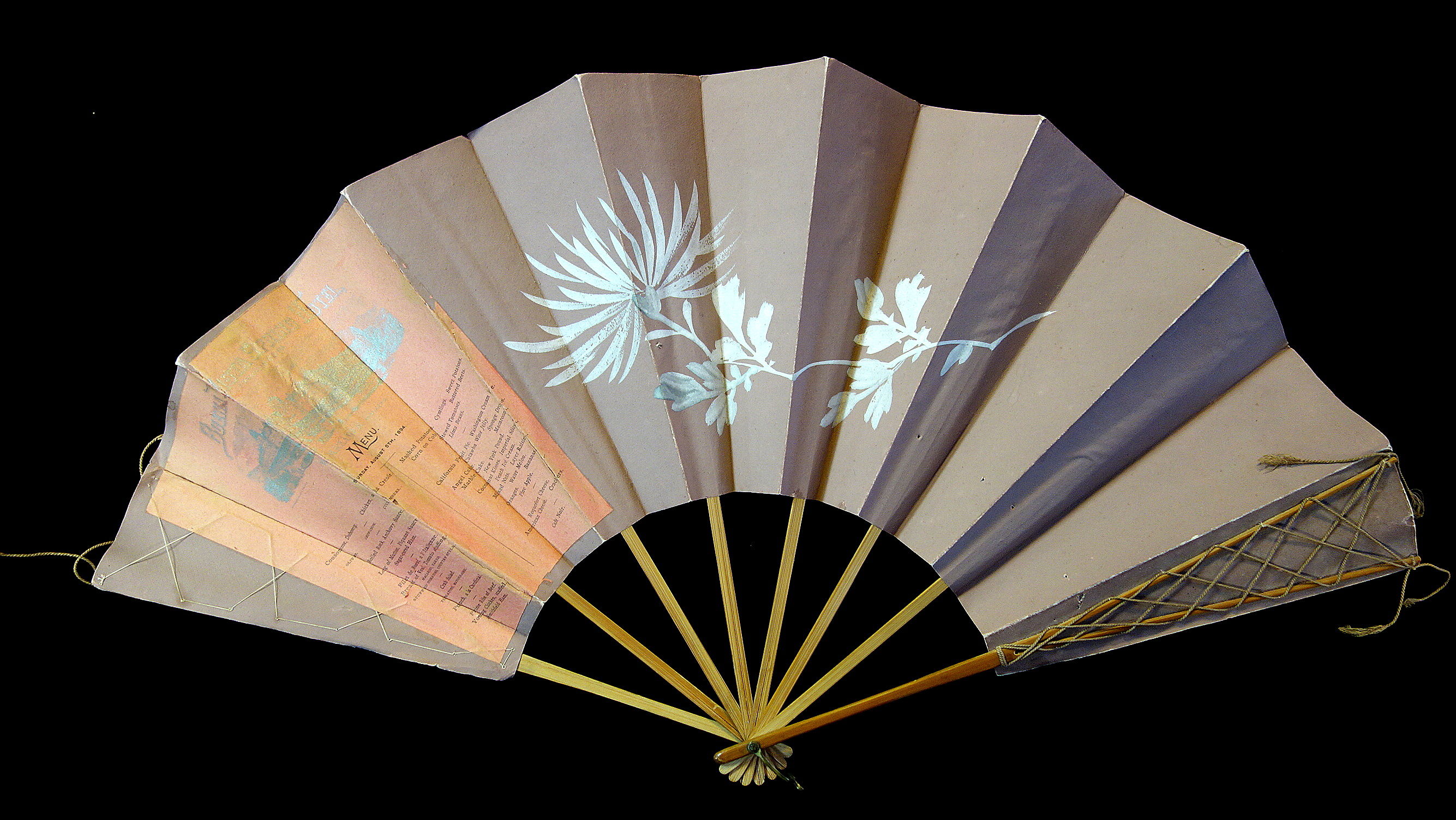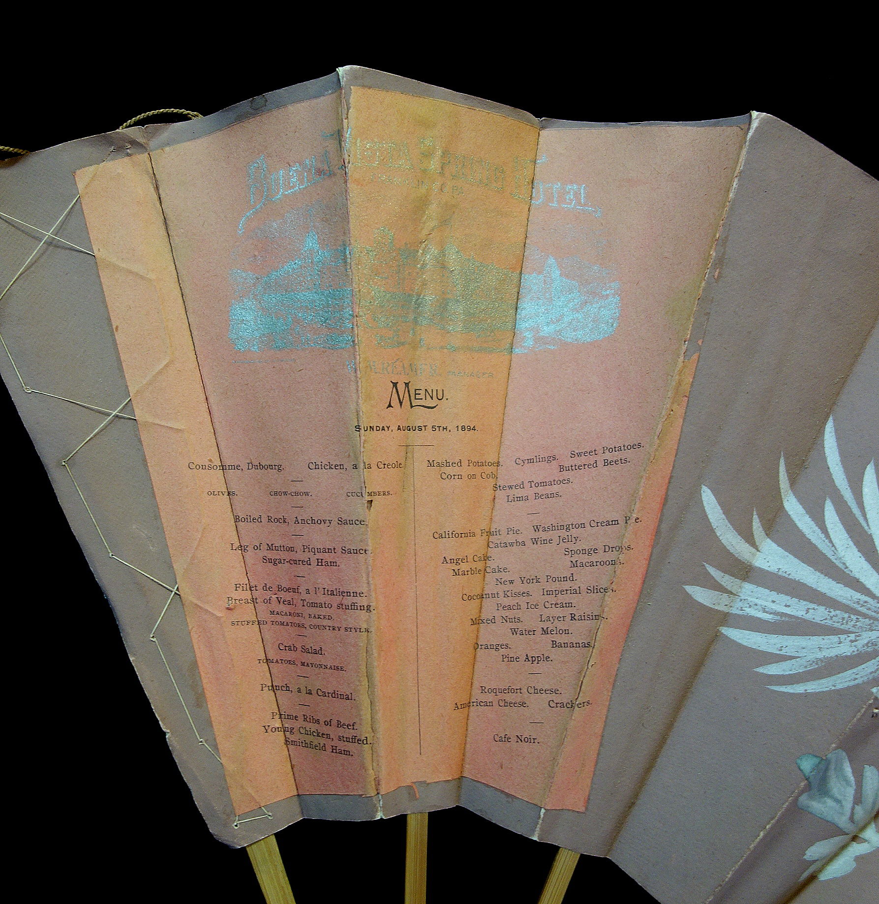 Blue Ridge Mountains, 1894. An 8 bamboo blade paper covered fan with a watercolor Asian inspired chrysanthemum motif. On the left 1/3 of one side of the fan is an applied menu for the Buena Vista Spring Hotel, Franklin Co., PA. It is for Dinner on Sunday, August 5, 1894. Fare includes leg of mutton with piquant sauce, Filet of Boeuf a l'Italienne, Breast of Veal with tomato stuffing, Cymlings (pattypan squash), California Fruit Pie and much more. Measures 13 1/2" x 24" when open. The Buena Vista Spring Hotel was an elegant resort hotel of it's day. It was located 70 miles from Baltimore, elevated 1500 ft above sea level and overlooks the Cumberland Valley on one side and the Historic Battlefields of Gettysburg on the other. An 1891 advertisement promotes the hotel as "A dry atmosphere, pure water, perfect sanitize. All modern improvements, Elevators, etc.
