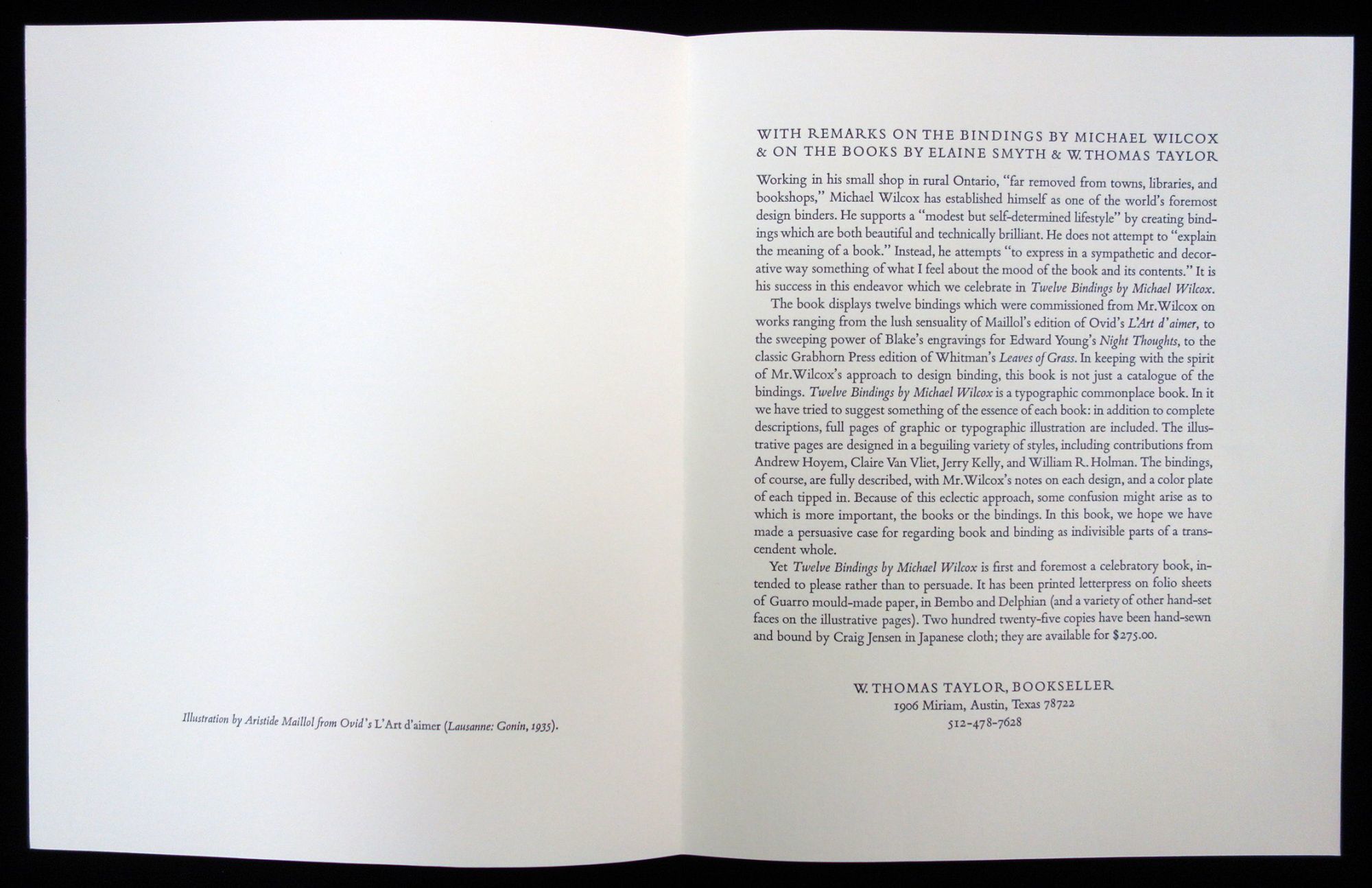 1985. Austin, Texas: W. Thomas Taylor, Bookseller, no date. Single-fold sheet measures 10 1/2" x 8 1/2". Front cover has title and author with a 1935 illustration by Astride Maillol from Ovid's L'Art d'aimer. A brief summary on the books written by Elaine Smyth and W. Thomas Taylor along with remarks by Wilcox on the bindings. As new.