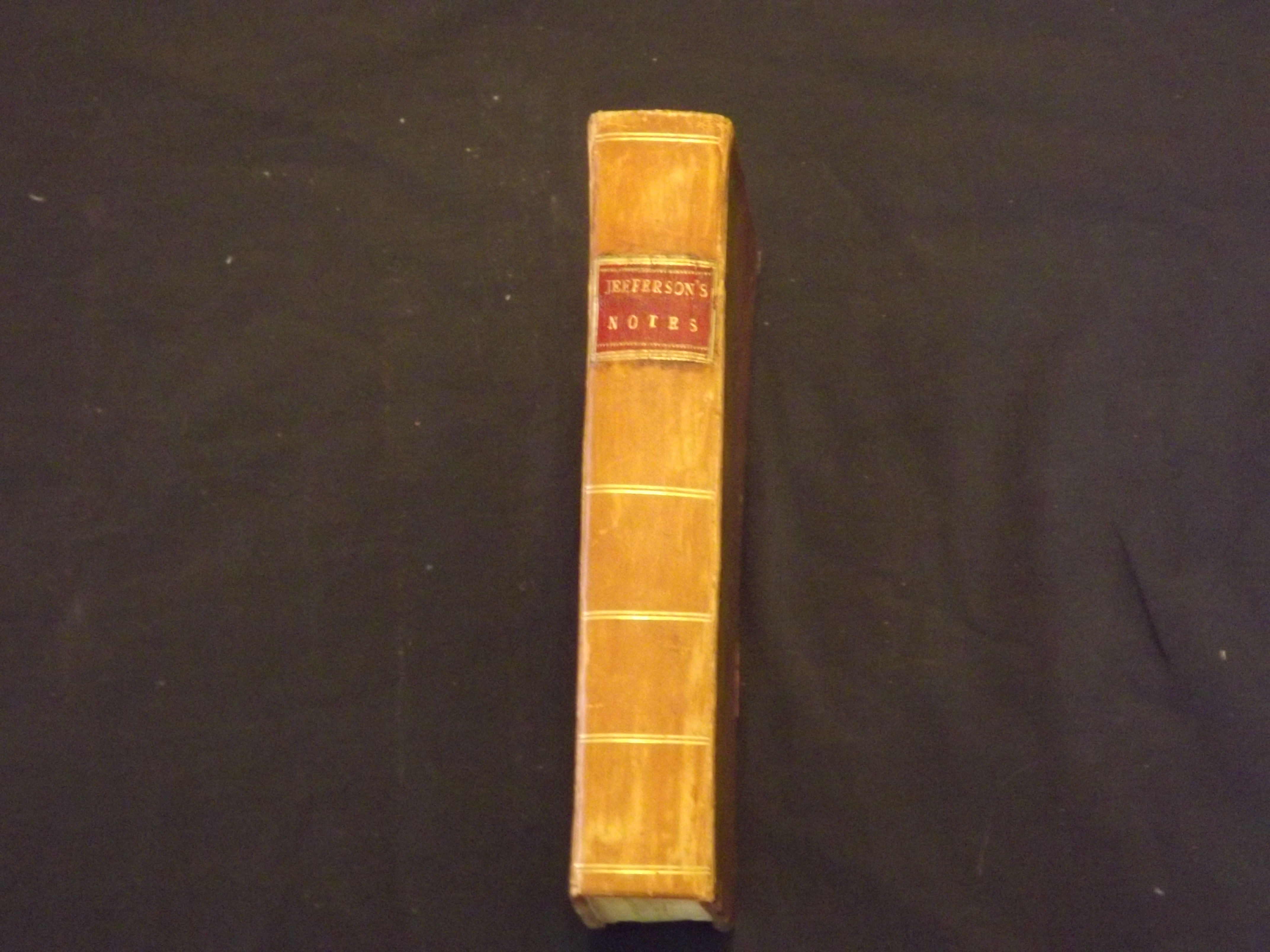 8vo, period tree sheep, rebacked with tan calf, early morocco spine label, folding table of the Indians in Virginia; map of the Ohio River near Pittsburgh, [4], 436, [blank], 56 pp. Wear to corners; some foxing and soiling within, tape repair to front free endpaper, rear free endpaper detached, crease and tear on page 42, and tear on page 94, library plate and stamps on front pastedown and endpapers hinges a little weak, but firm; overall about very good. Early American edition of Thomas Jefferson's most important book published during his lifetime and considered one of America's first permanent literary and intellectual landmarks. The work appears to have its origins in a request from the French delegation in Philadelphia looking for information on Virginia. This edition includes the appendix on the murder of Logan's family. Lacks the frontispiece portrait and the large engraved folding map of Virginia. Formerly in the public library of Beverley, Mass., with bookplate dated 1856, old ink stamps, removal from rear pastedown. Howes J78. Sabin 35906. monticello website.
