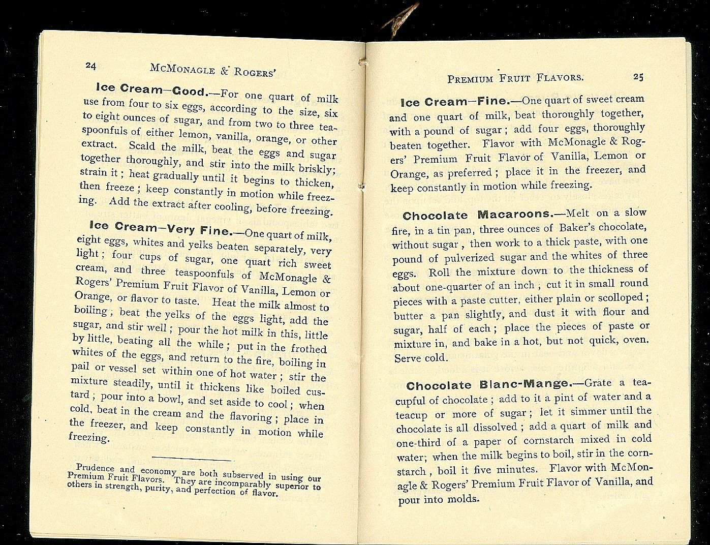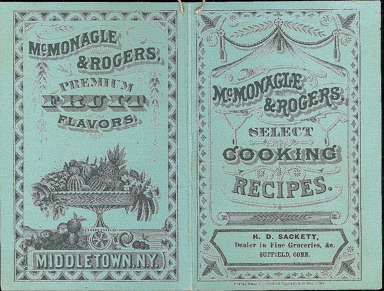 New York: C. A. Coffin & Rogers, 1880. A 32 pp booklet. wraps. Middletown, NY. Artistic printing - covers with numerous decorative devices. McMonagle and Rogers produced premium fruit flavors and was founded in 1868 Recipes for cakes, creams, puddings and sauces and interestingly enough includes a veal loaf and lobster salad recipe. Presented by H. D. Sackett, Suffield, Conn. Measures 5" x 3 1/4