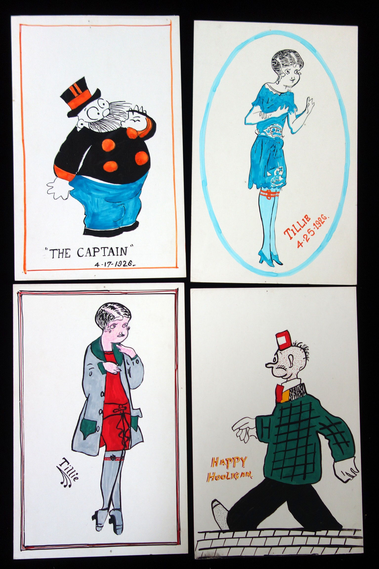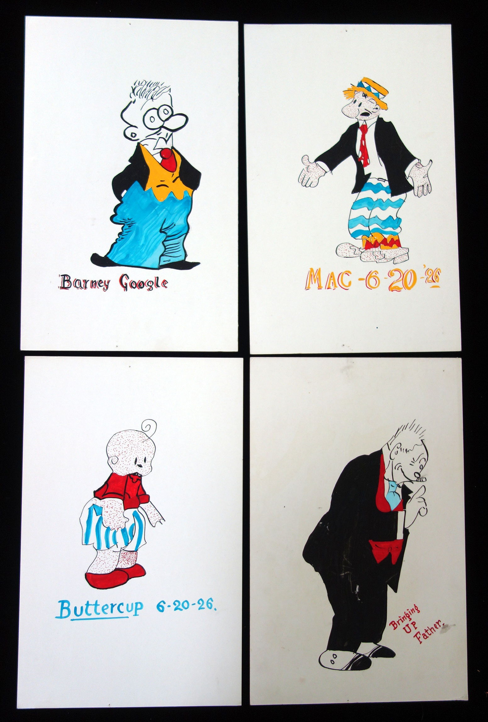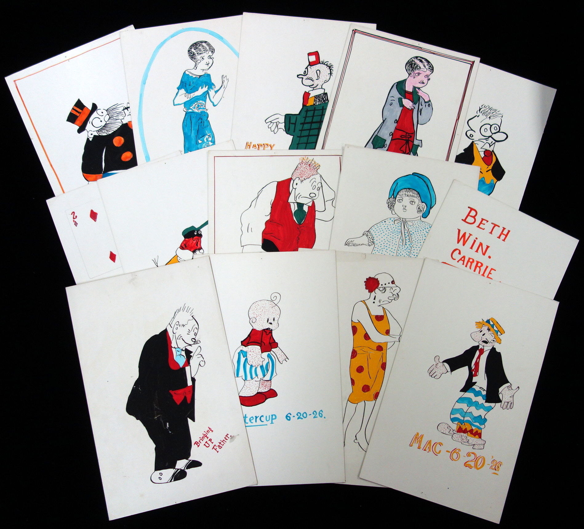 Done on heavy card stock and include characters from Bringing Up Father and others. Includes "Father, Maggie, Spar Plug, the Captain, Buttercup, Jiggs, Happy Hooligan, Barney Google, Mac (two different views of Tillie and Dolly Dimples. Dated in 1926. Vibrant color. Well executed.