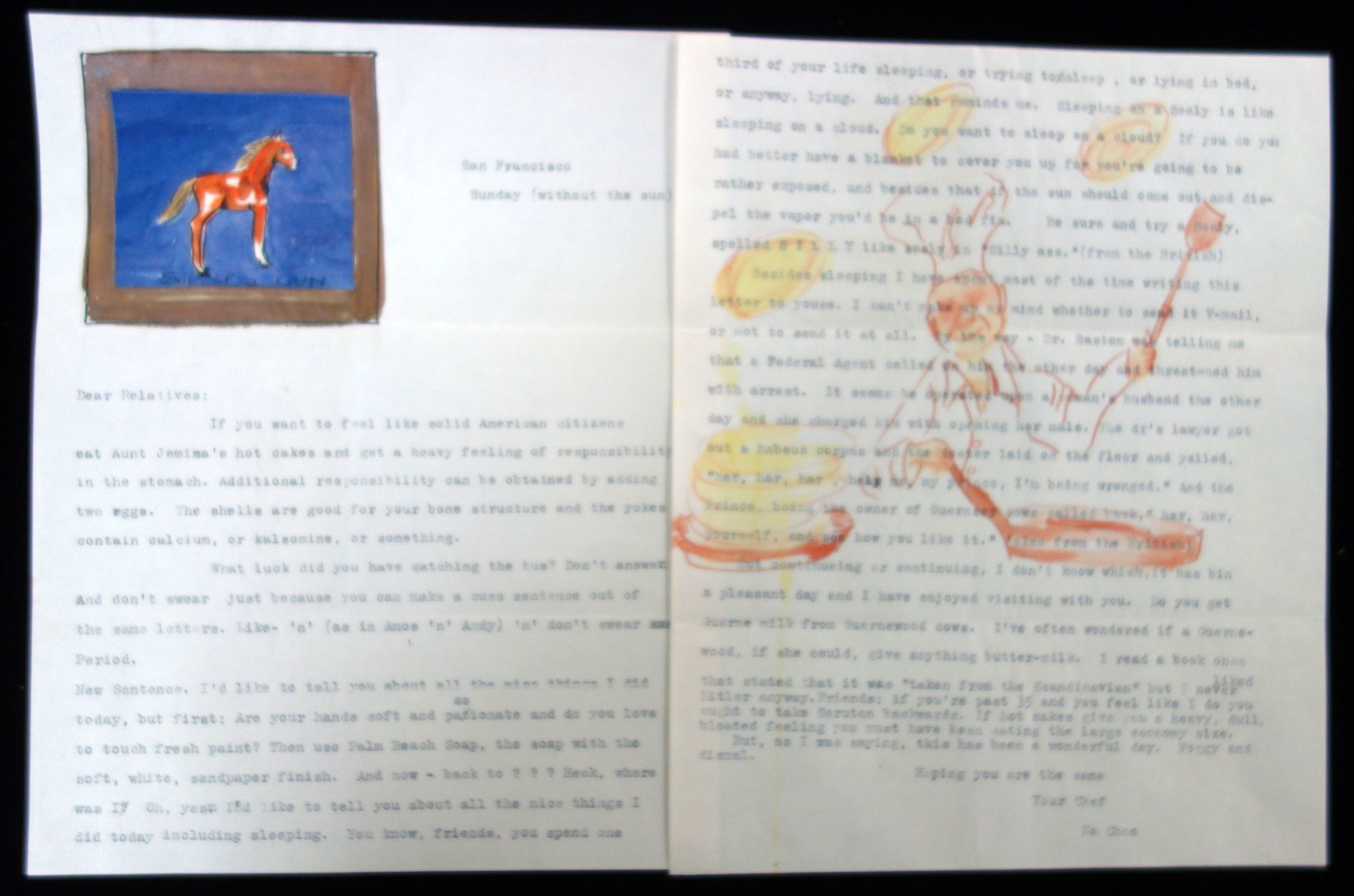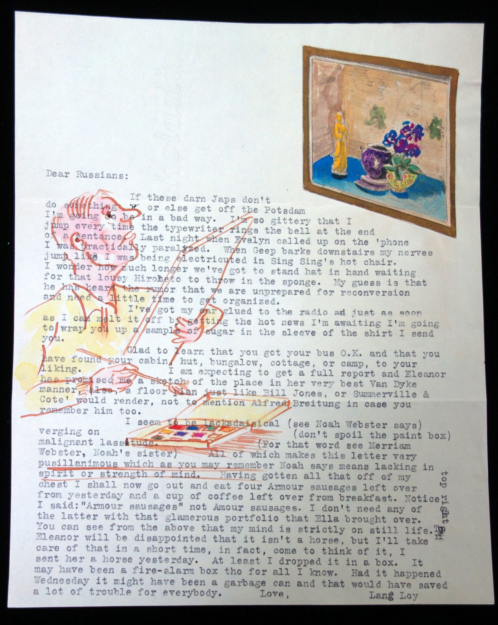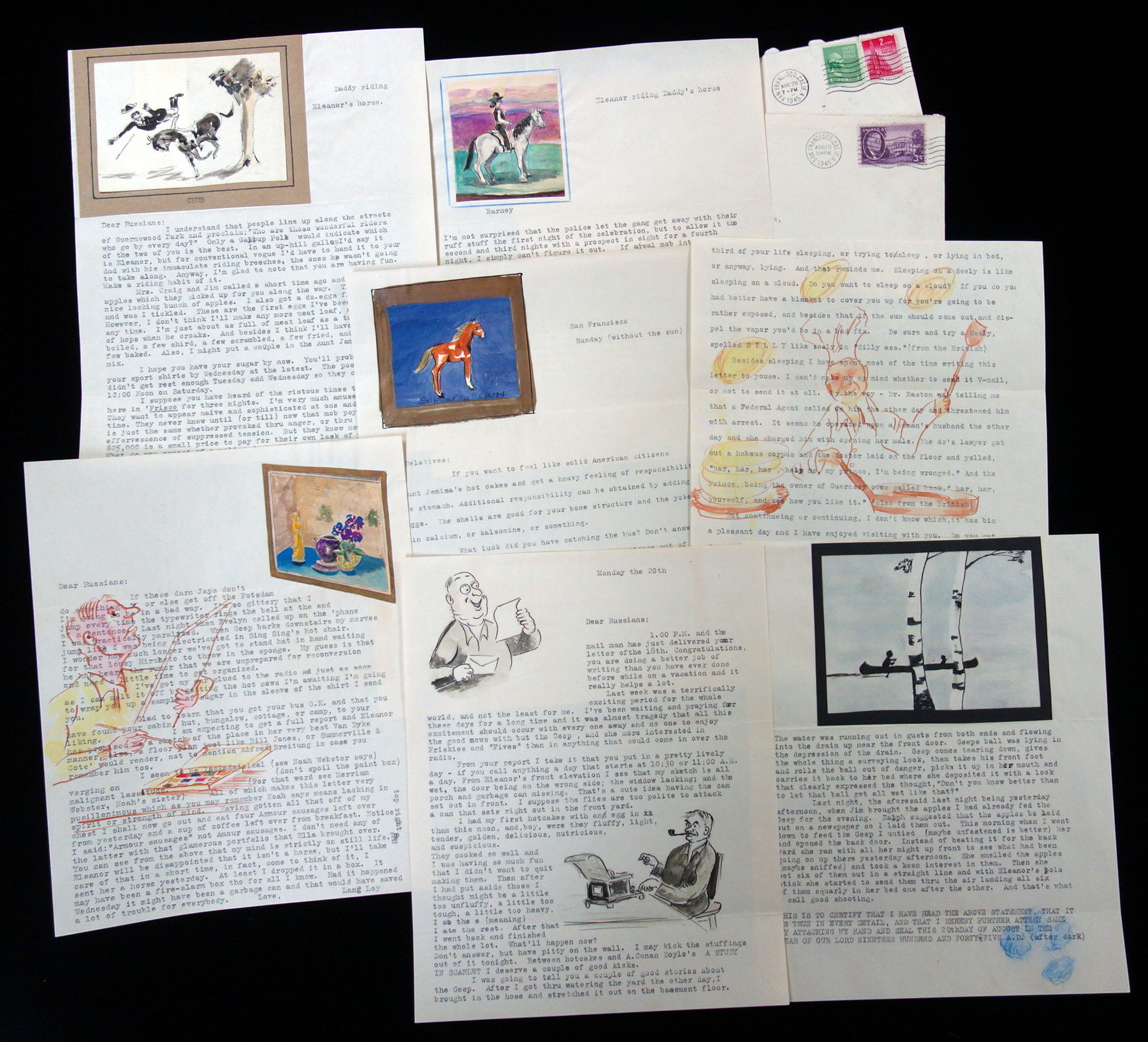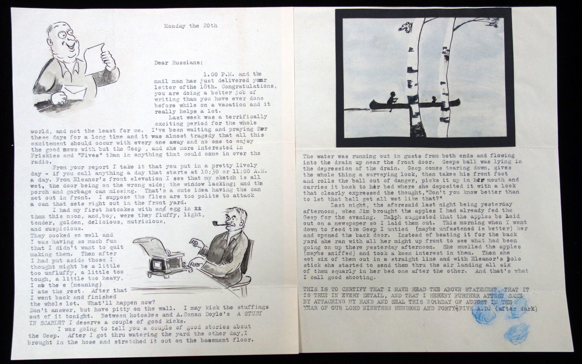 A collection of five (5) immediate post WWII typewritten letters embellished with watercolor illustrations superimposed on the letter sheets and/or applied at the top of the page