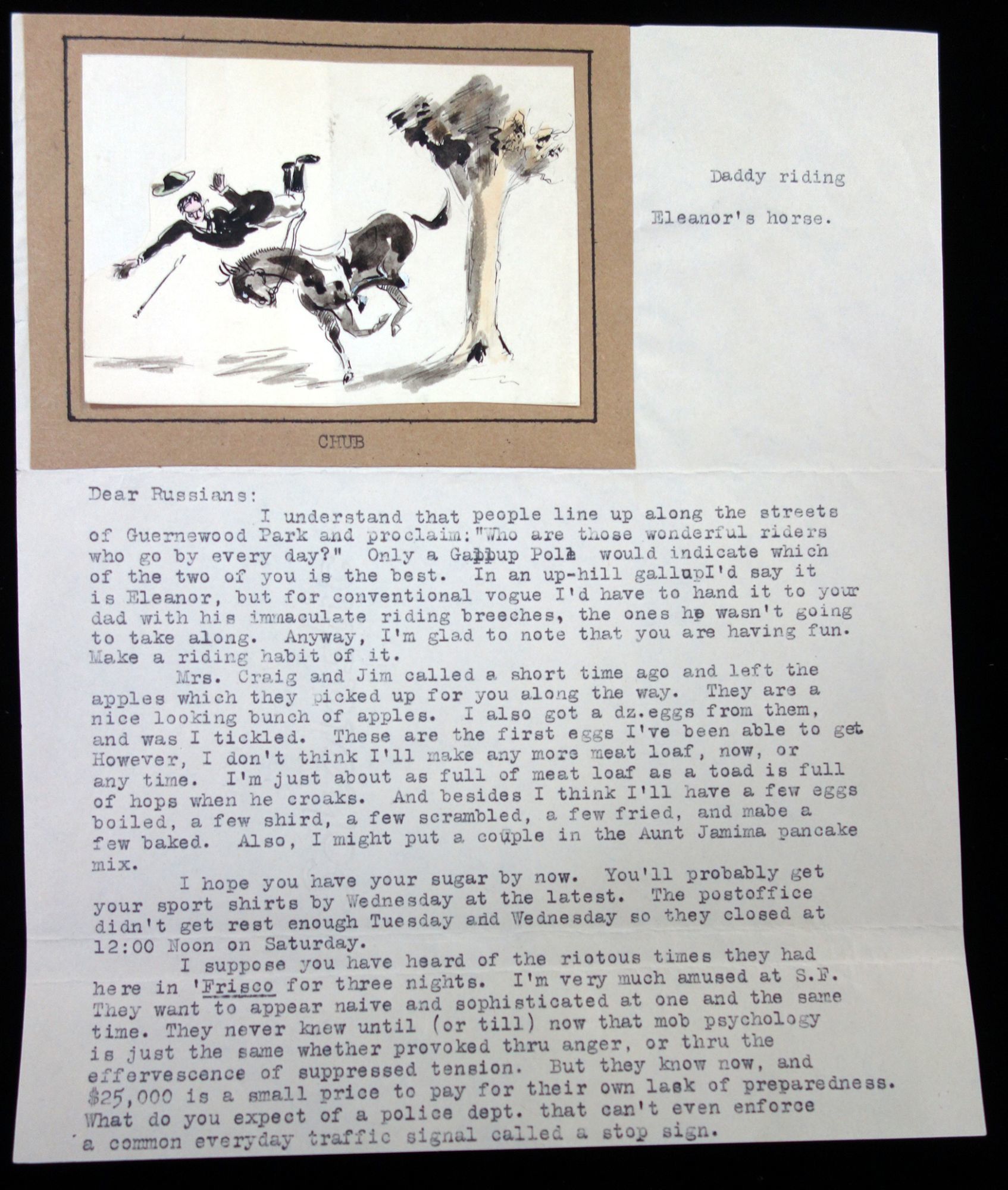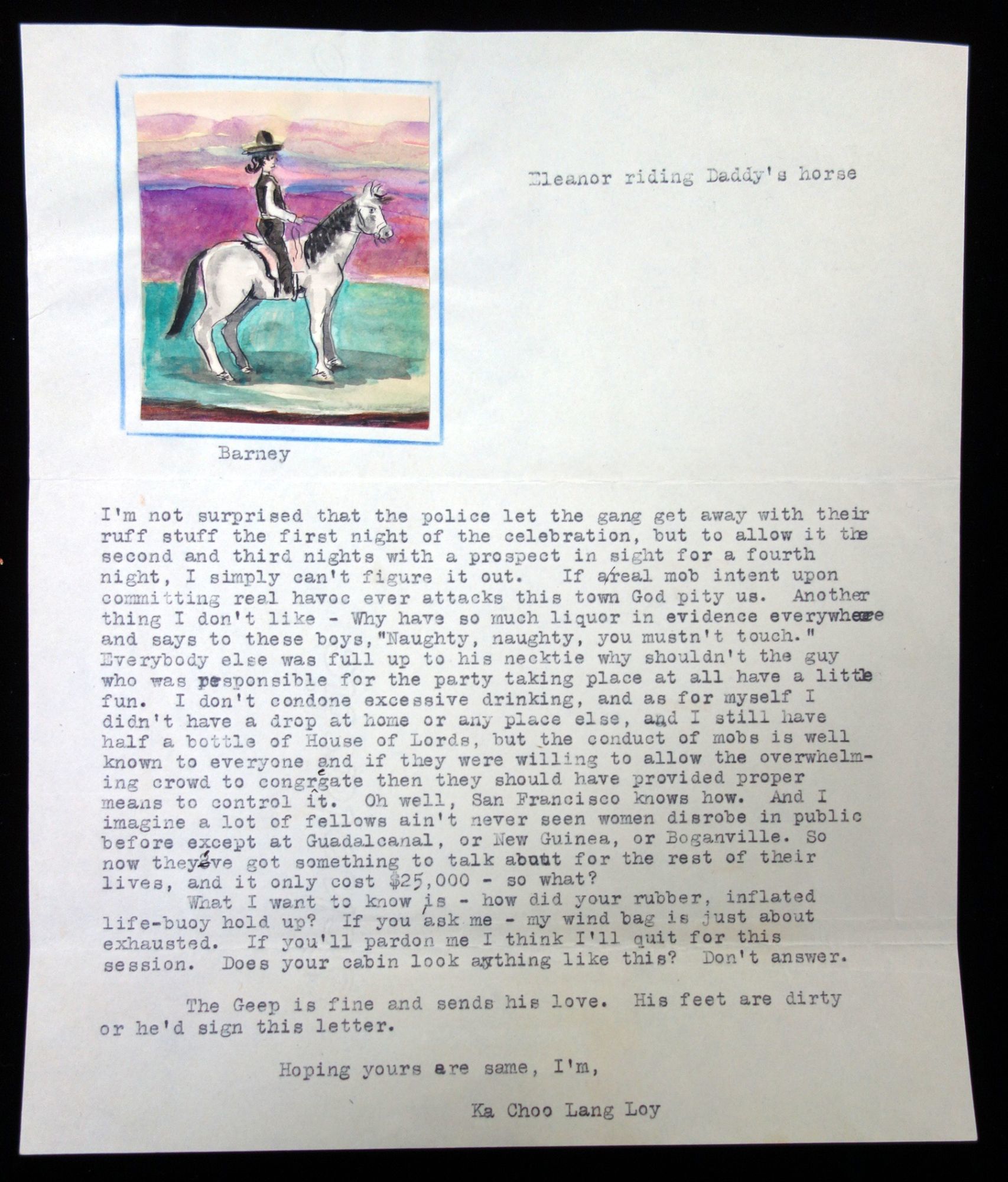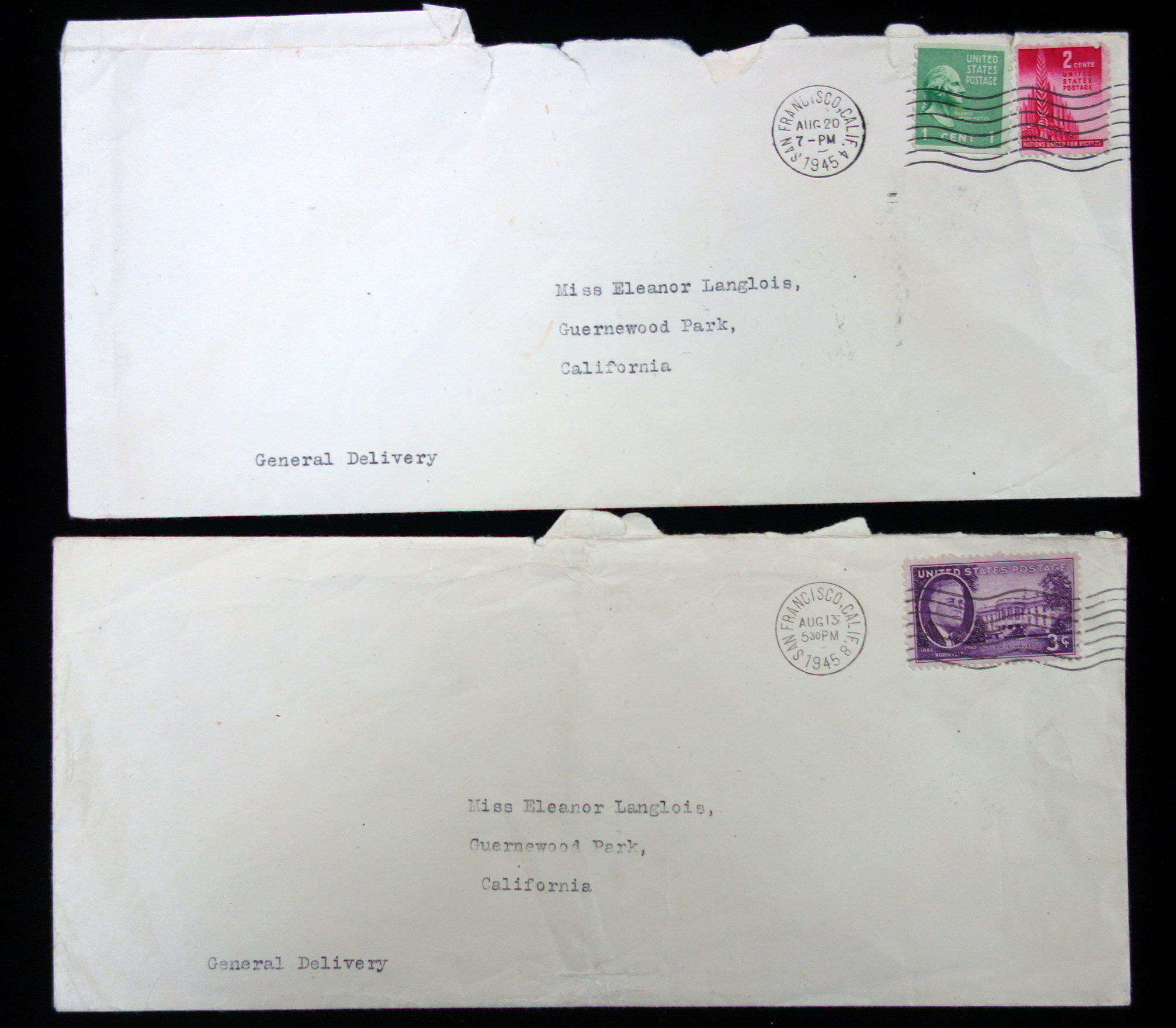 California, 1945. The content is politically oriented and tongue-in-cheek. The letters were addressed to Miss Eleanor Langlois of Guernewood Park, CA from J. E. Langlois and Oscar Smith, both of San Francisco. J.E. is Eleanor's father.