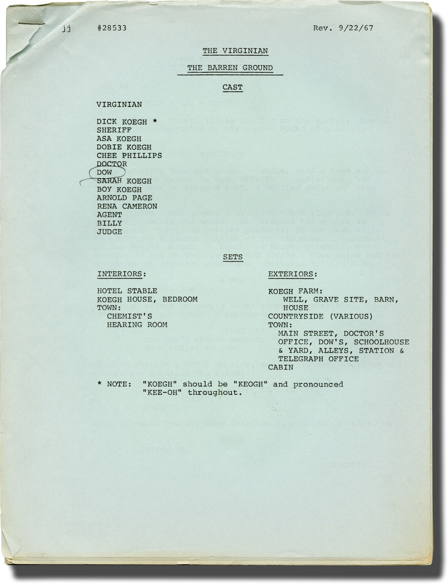 Burbank, CA: National Broadcasting Company [NBC], 1967. Two Draft scripts for "The Barren Ground," the 1967 episode of "The Virginian" television show. Loosely based on the 1902 novel by Owen Wister.