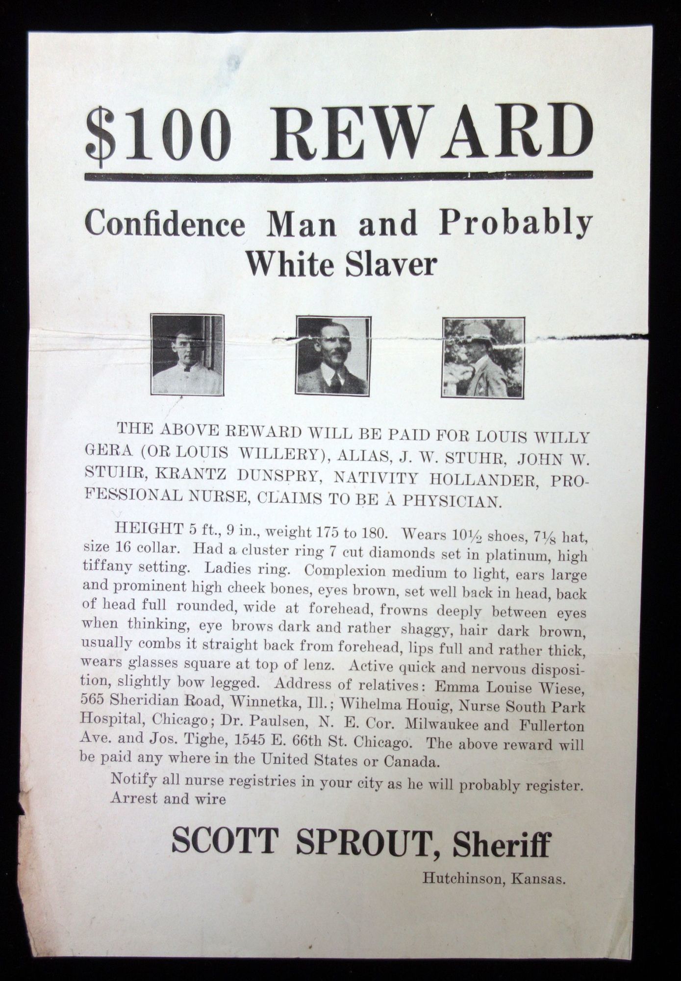 A poster with three different images from photographs of the individual, who is a professional nurse who claims to be a physician. Among his aliases "Nativity Hollander" Includes a comprehensive description including an active quick and nervous disposition, slightly bow legged. It also lists his relative with addresses. Issued by Scott Sprout, Sheriff, Hutchinson, Kansas.