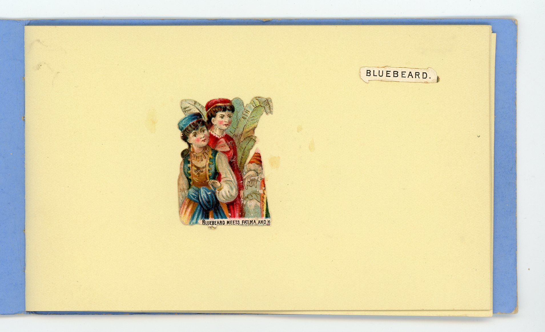 c. 1905. light edge wear. A heavy stock cover agents or salesmens sample book for embossed die-cut scraps. The title references Visiting Cards; the assumption is that applying storied theme scraps to ones visiting card may have been a marketing idea, that didnt take hold. This particular book includes eleven samples from the Bluebeard series of scraps. Each approximately 1 ½ x 1 ½ with a captioned picture. .n.d. (c1905).3 ½ x 5 ¾
