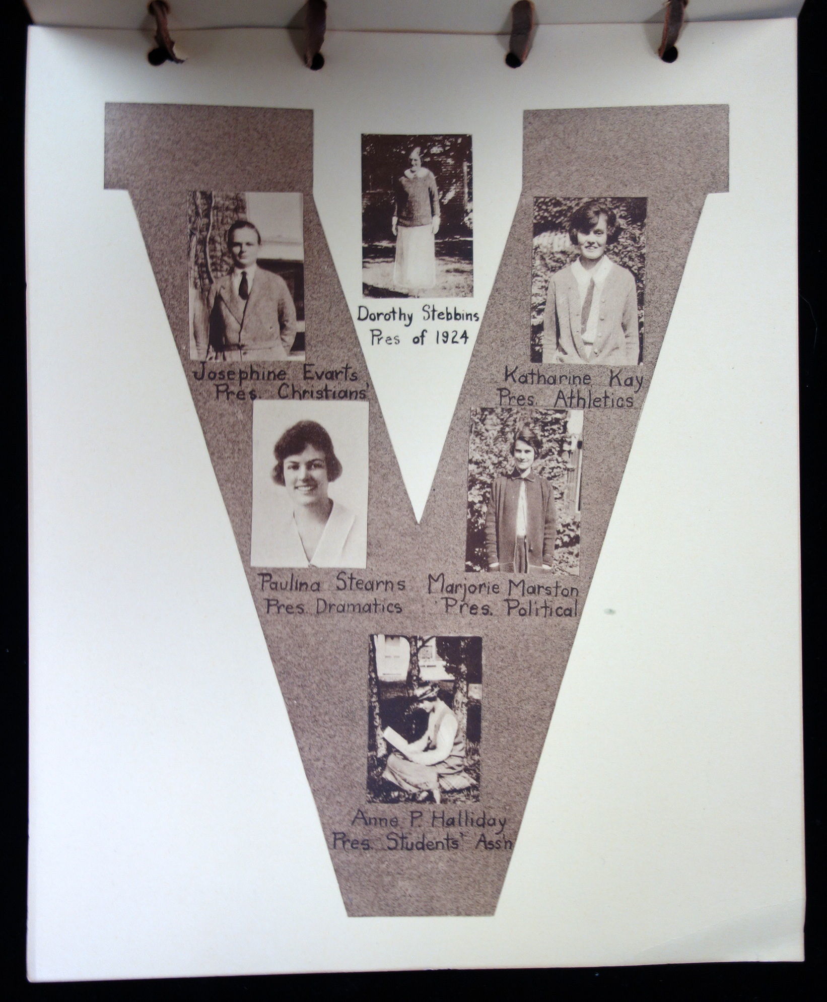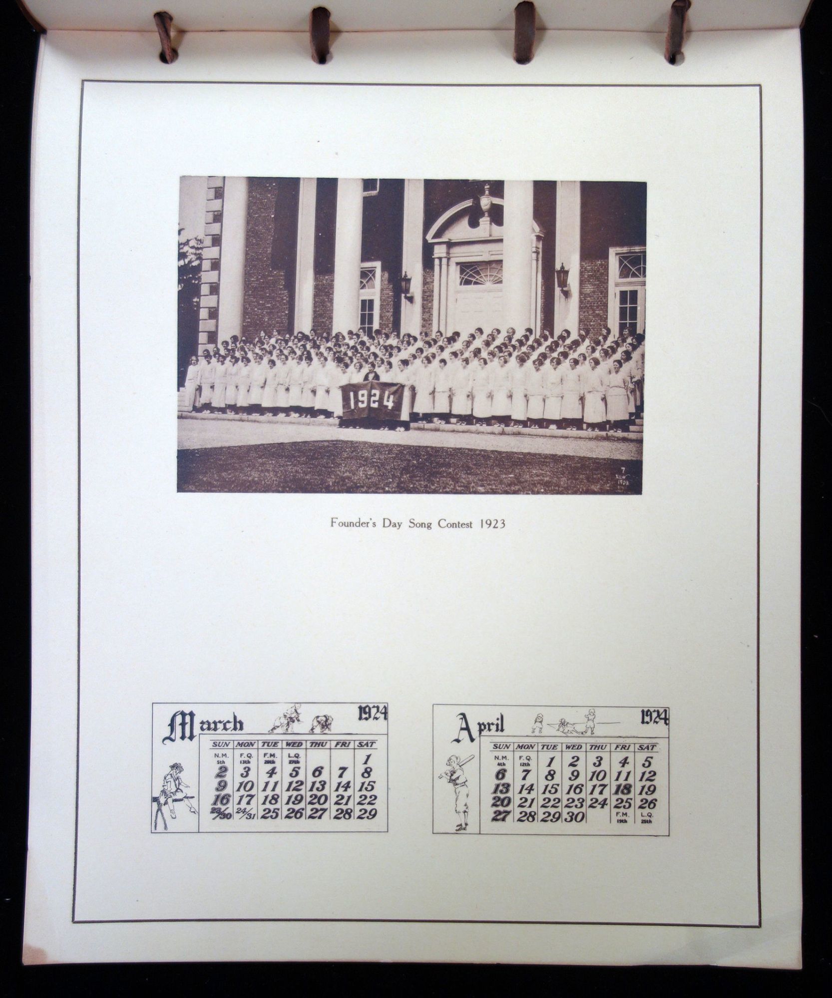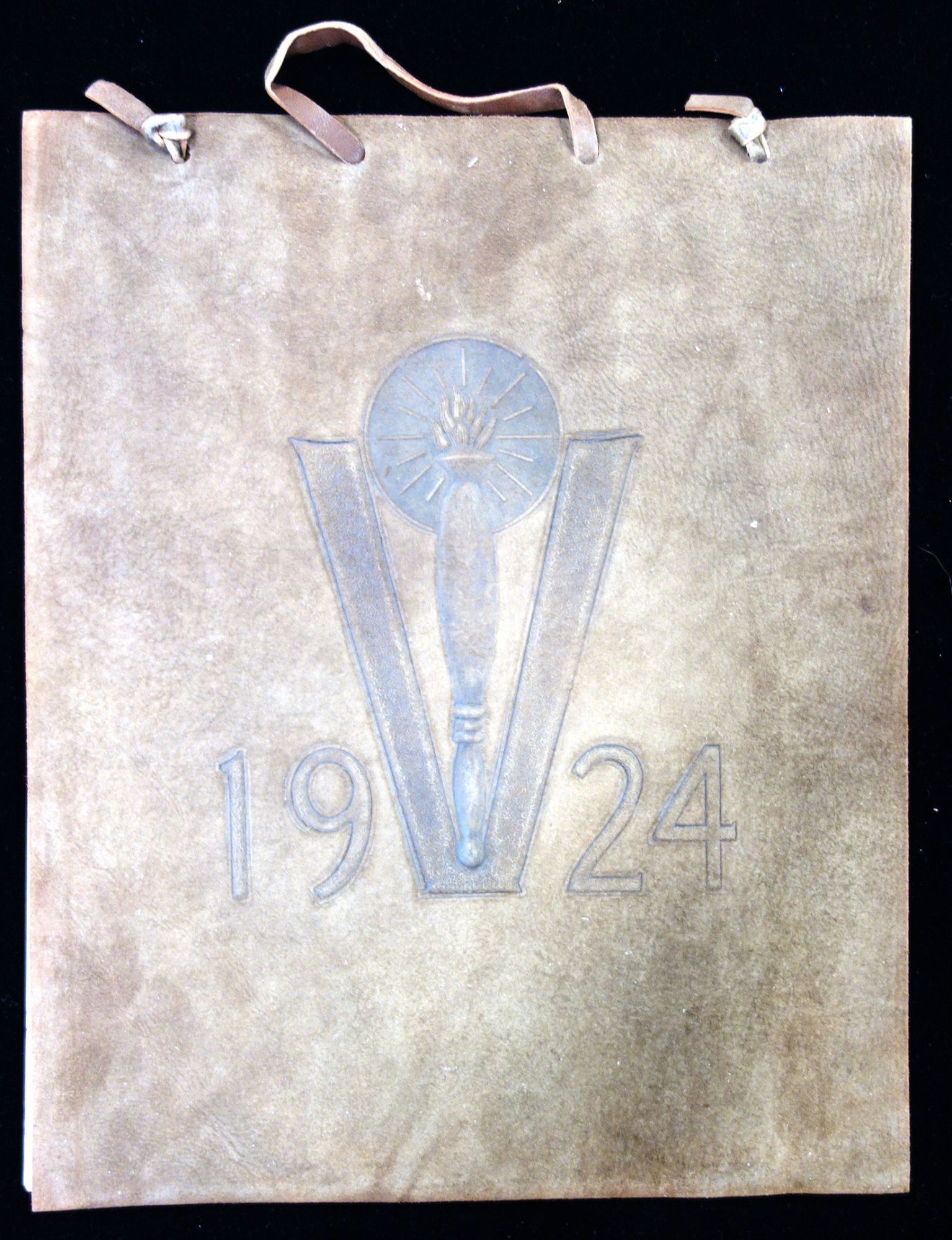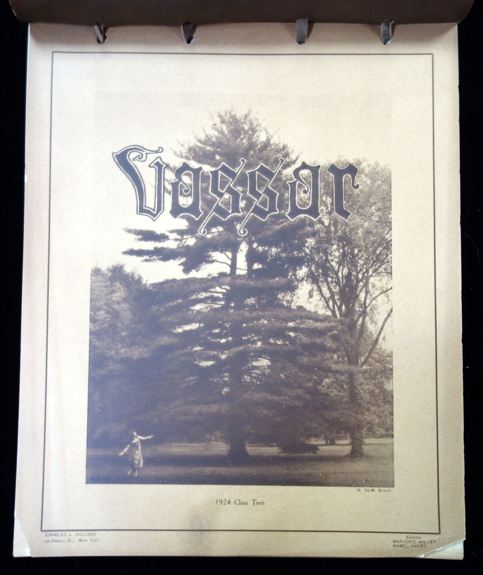 1924. An eleven (11) page calendar with an embossed leather cover with leather string tie for Vassar 1924. Images from photographs throughout by M. De M. Brown. The title page is the 1924 Class Tree with a dancer at base. Printed by Charles L. Willard, 150 Nassau St. New York. Editors - Marjorie Miller and Mabel Hayes. Subsequent pages have photo images of significant events throughout the year including the Founder's Day Song Contest, the 1924 Daisy Chain, Varsity Hockey from 1922, Varsity Basketball for 1923, and Track for 1923. Also includes places of interest including the Sunset Path, Thompson Memorial Library and Students' Building in a winter scene. Each page has two calendar months each with line drawn illustrations of a woman partaking in a seasonal sports activity. The final page includes the various student presidents for the year.