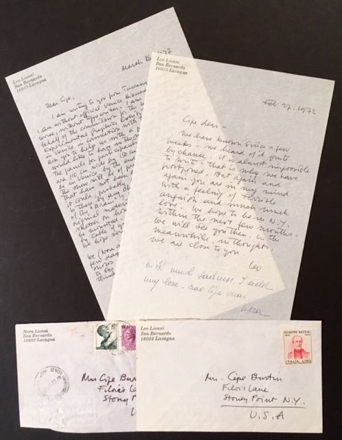 Lavagna, Italy, 1972. Near Fine. 2 warm, handwritten letters from the great Italian designer and children's author and illustrator Leo Lionni to pioneering graphic artist Cipe Pineles (former art director at Charm, Seventeen and Mademoiselle). Written from Lavagna, Italy in 1972 and commisserating over the loss of her husband graphic designer Will Burtin, both letters are bright and very legible in their strong ink and are clean and nicely-preserved, with very subtle folds running horizontally. Each letter measures 5 3/4" x 9 1/2" and each includes its original handwritten envelope.