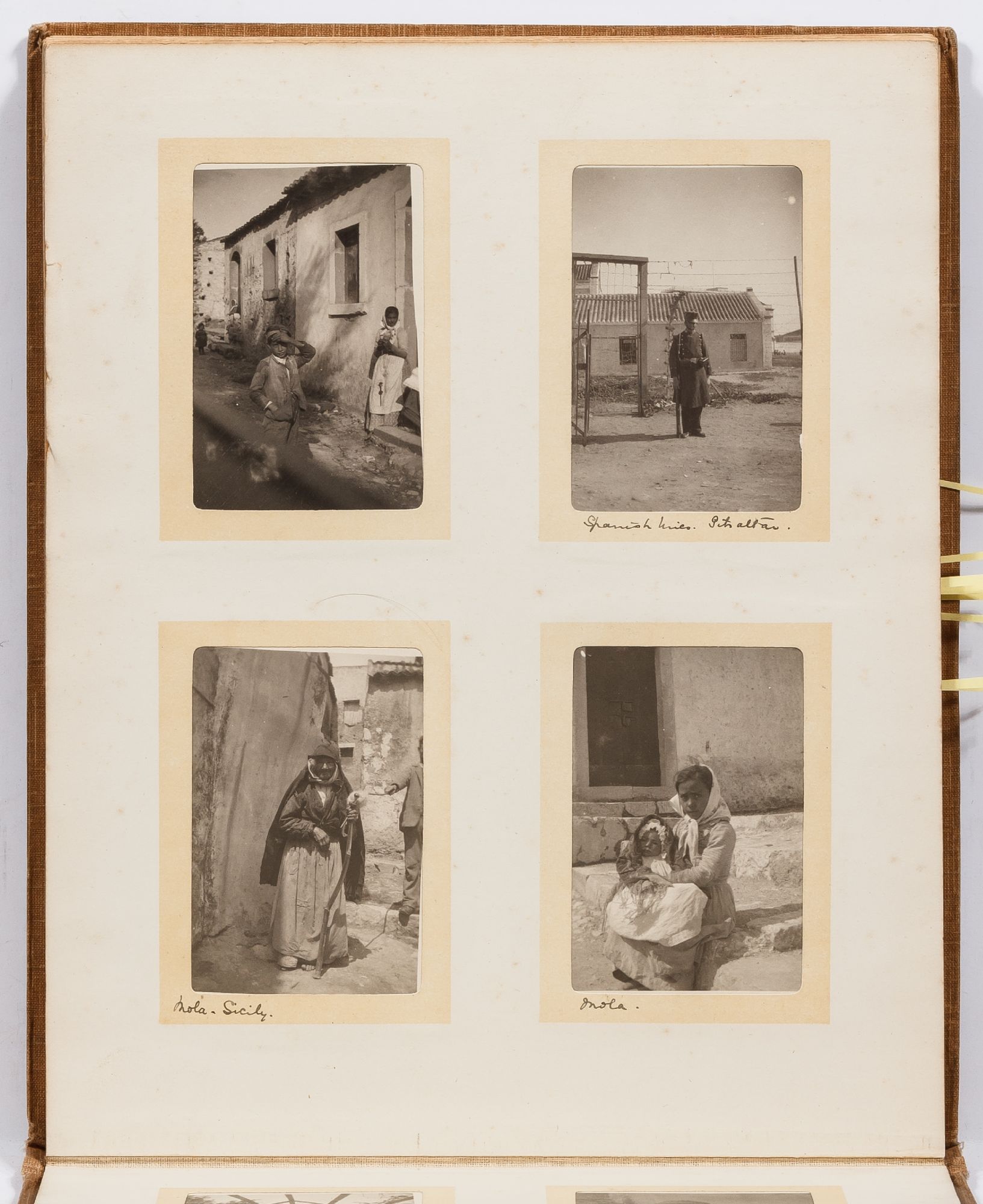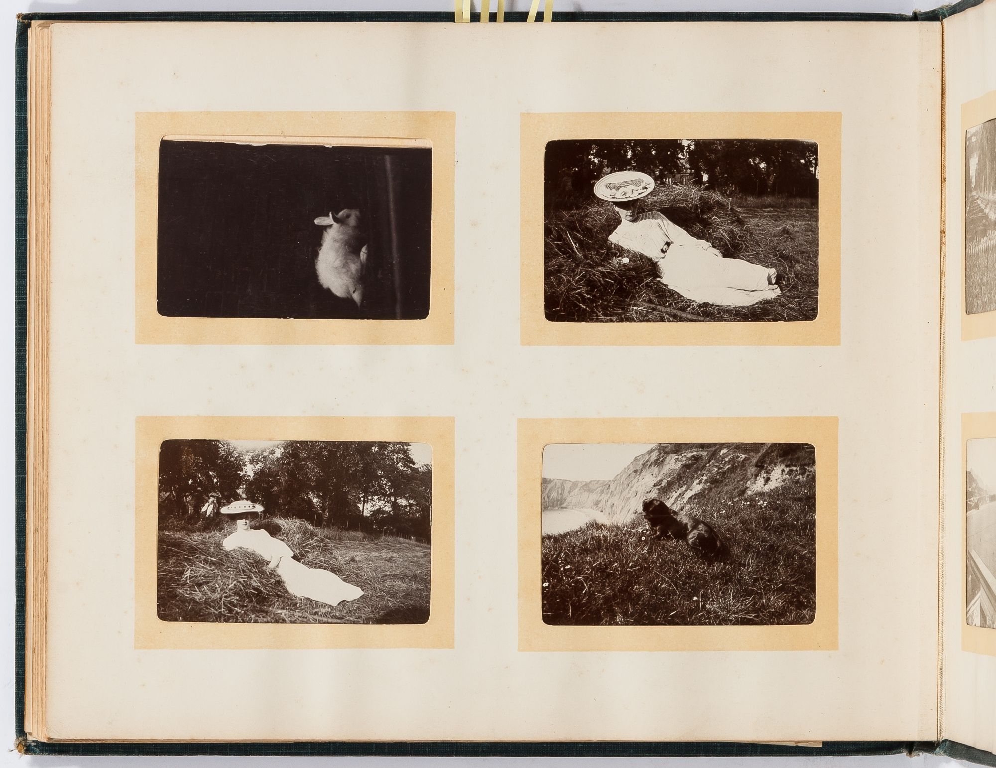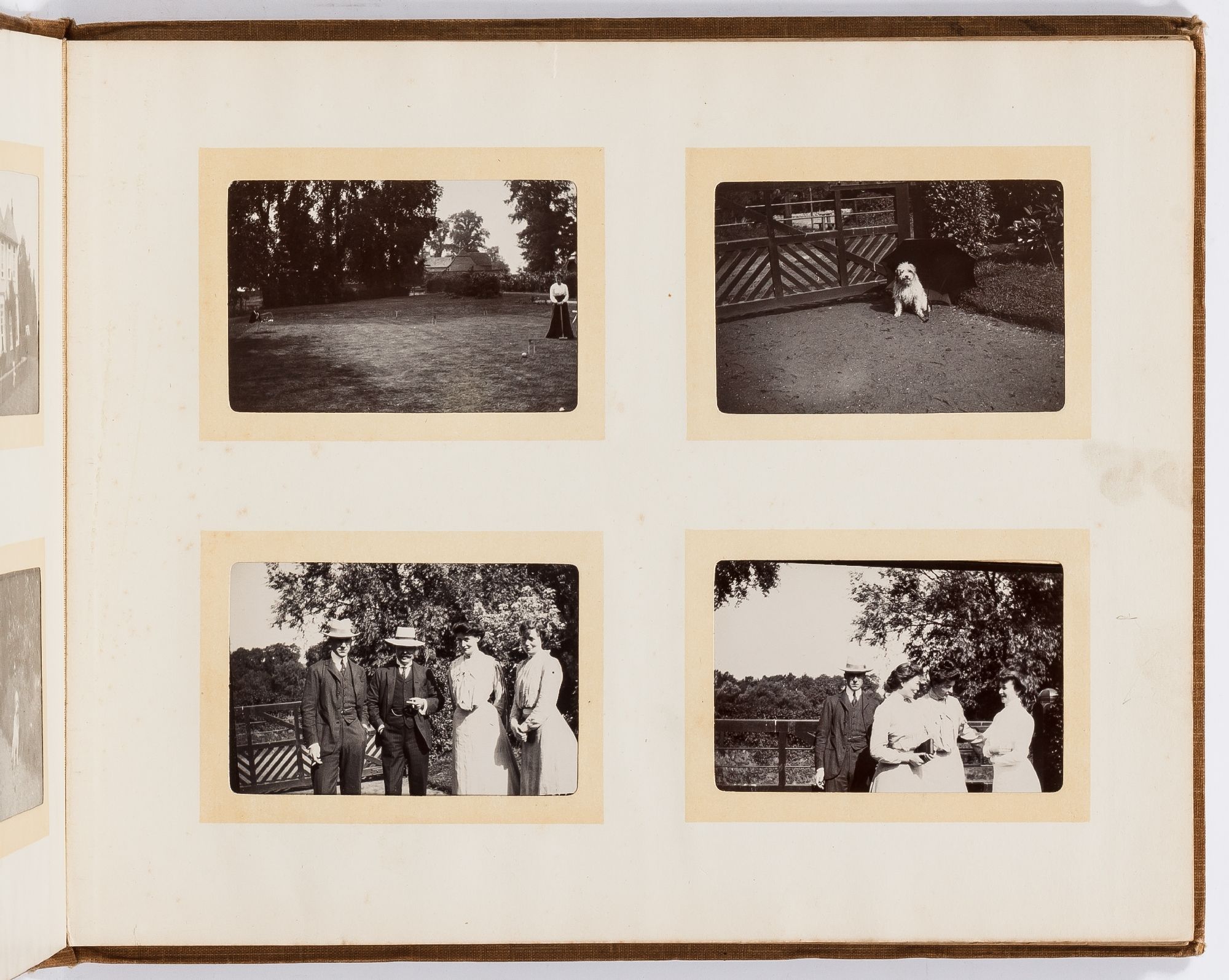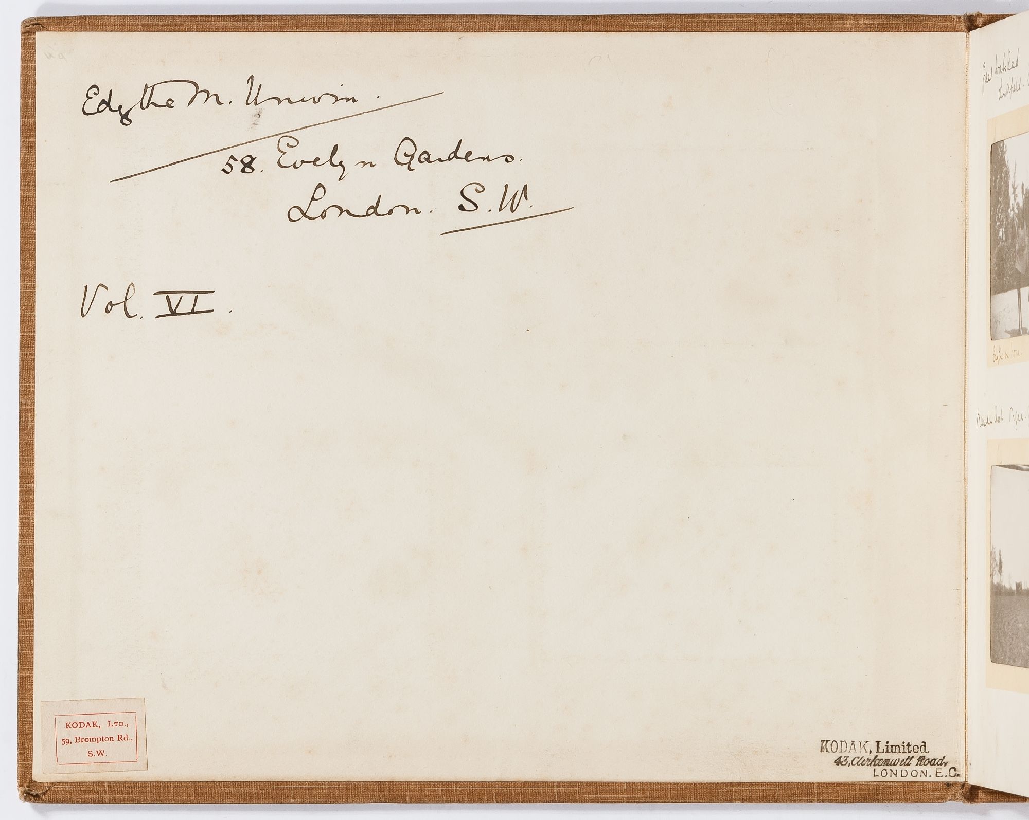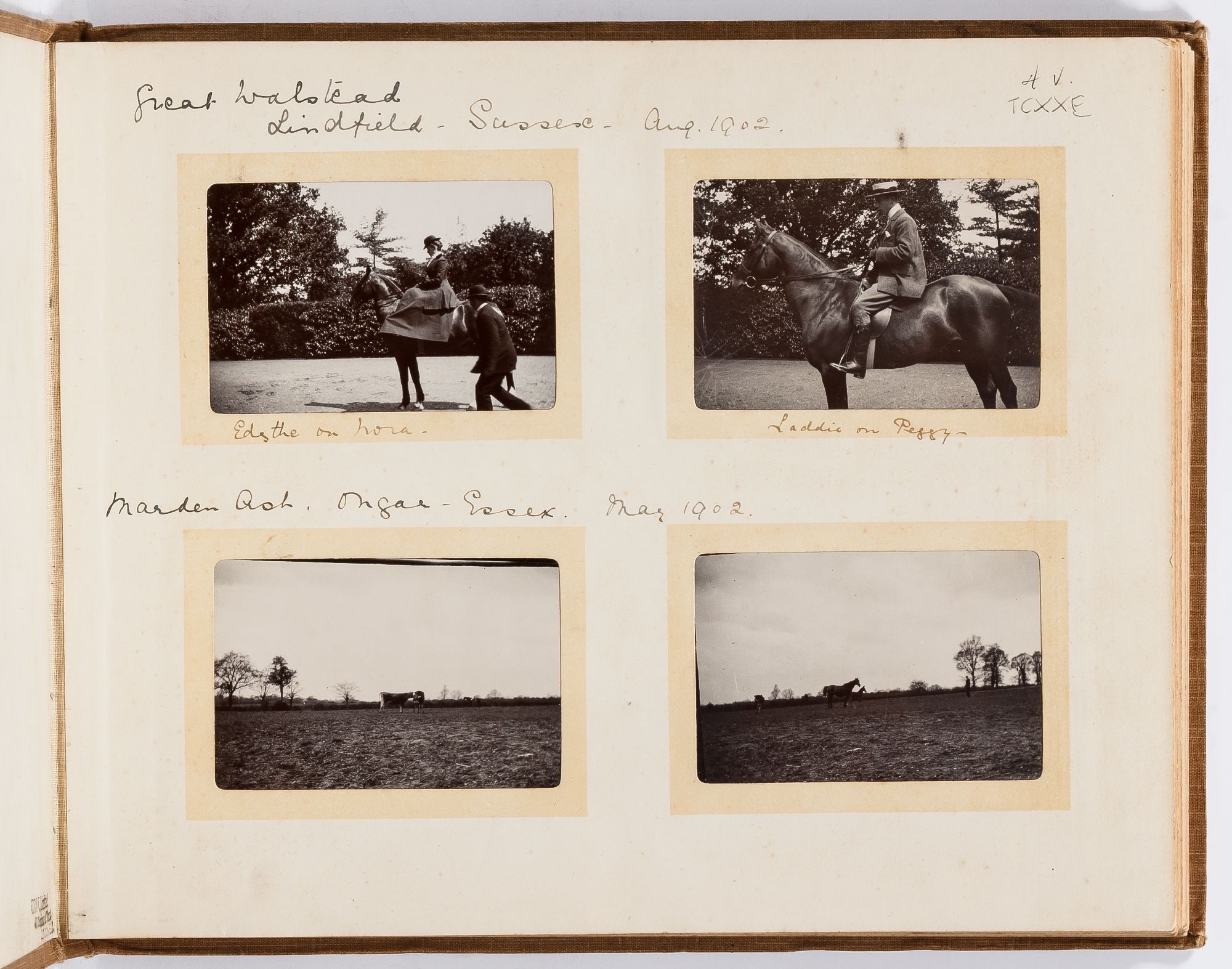 A collection of four Kodak Souvenir photo albums kept by a woman in an upper middleclass British family at the turn of the century. The albums all bear the name and address of Edythe M. Unwin who lived at Evelyn Gardens in London. The albums begin in 1900 and continue through 1903 and include Kodak snapshots of family and friends and the events and excursions they participated in. The first album takes place on a trip to Newcastle with photos of well-dressed women at a country estate, bathing in the sea, and a tea party with little girls in fashionable hats. The family also visited the 3rd Dragoon Guards and photographed the men on horseback and performing drills. One photo shows the matriarch of the family on her stomach shooting with one of the officers. The second album begins in 1902 with a trip to Lindfield, Sussex and begins with the family on horseback and later going to a horseshow. They also played a croquet tournament at an estate and posed with animals on a farm. Later in the album a trip to the continent in 1903 is depicted. They traveled by boat to Corsica and onward to Sicily where they photographed local people and landmarks. The third album is a continuation of 1903 and begins with a trip to Shepperton-on-Thames with a visit to Millbrook House. At Millbrook they are seen posed around the house as well as watching the Millbrook Polo Club match and later a cricket match. Later they visited Whitmoor cottage and went horseback riding and had dinner parties. The final album includes horseback riding and photos of the horses in their stables. Later in the album a family home is seen with photos showing the interior of the house and people posing around it.