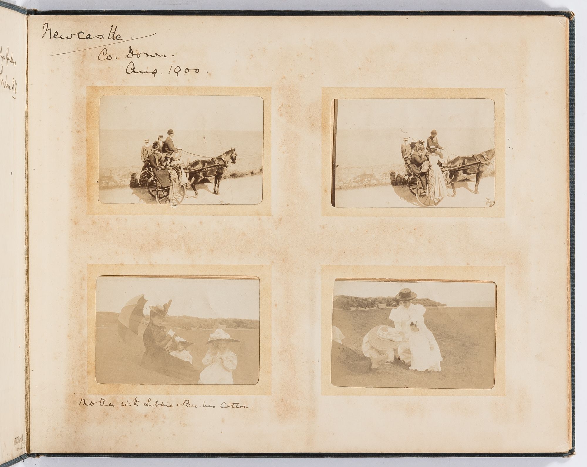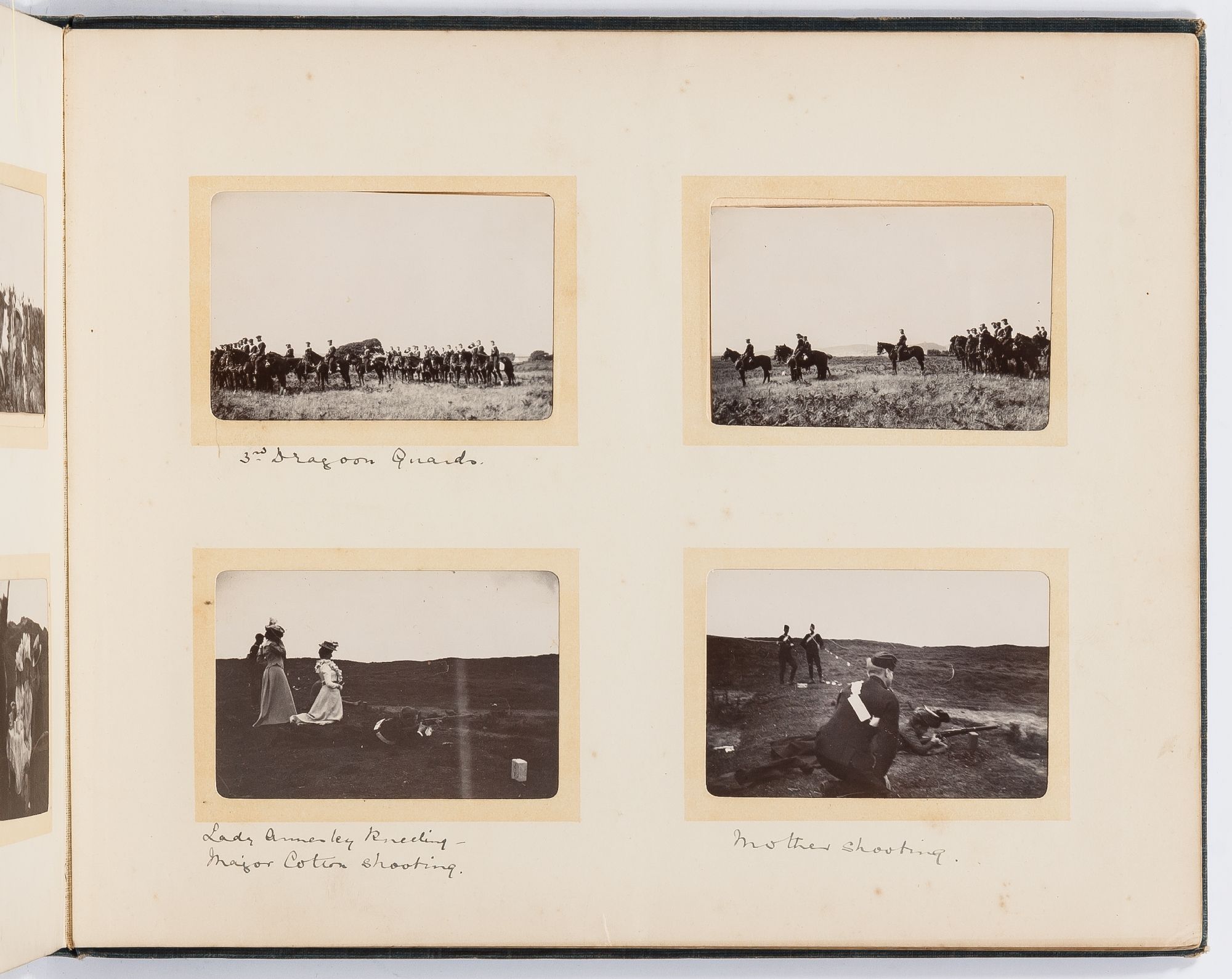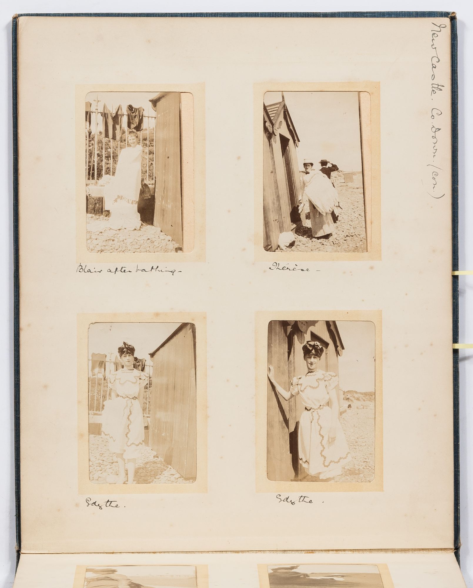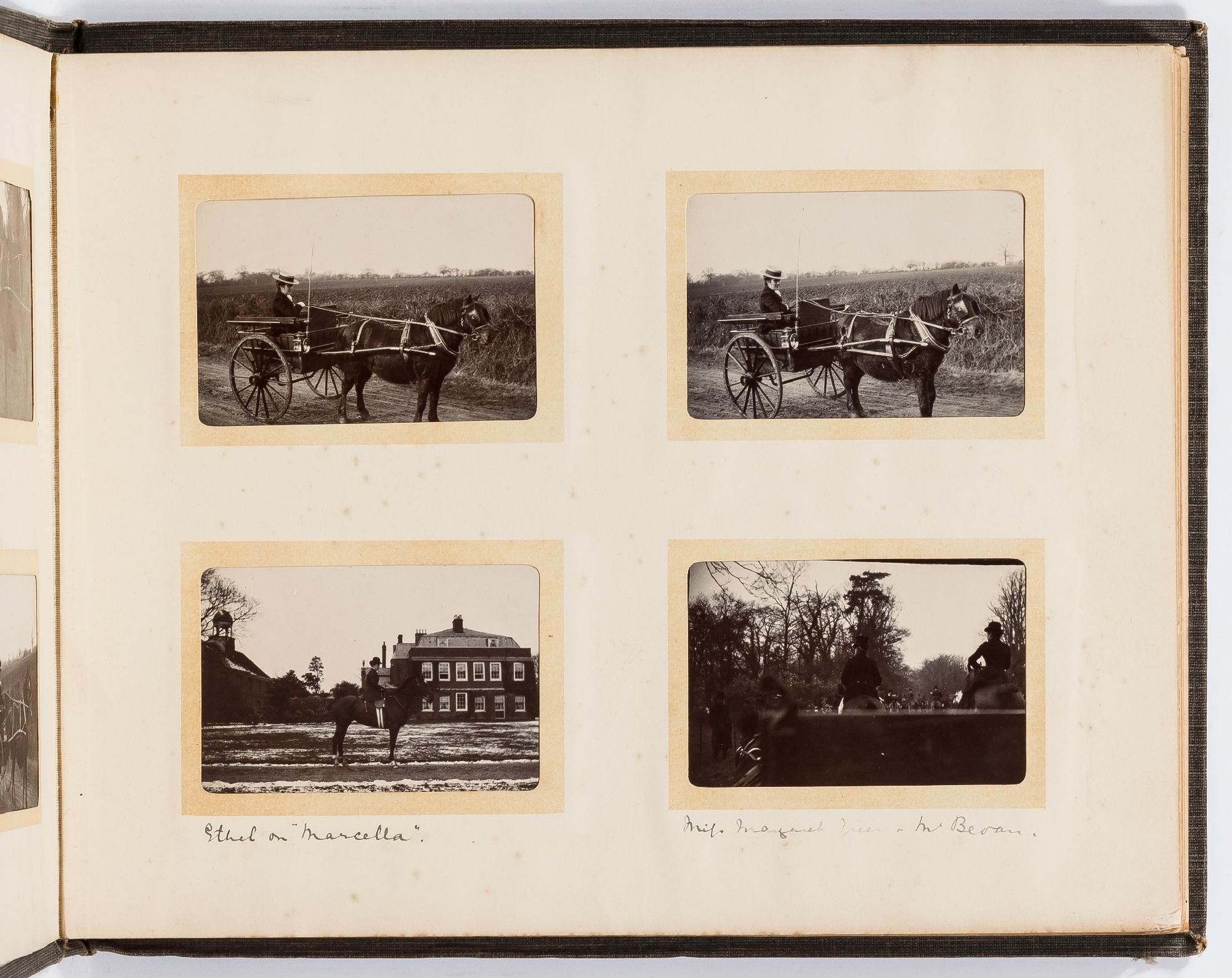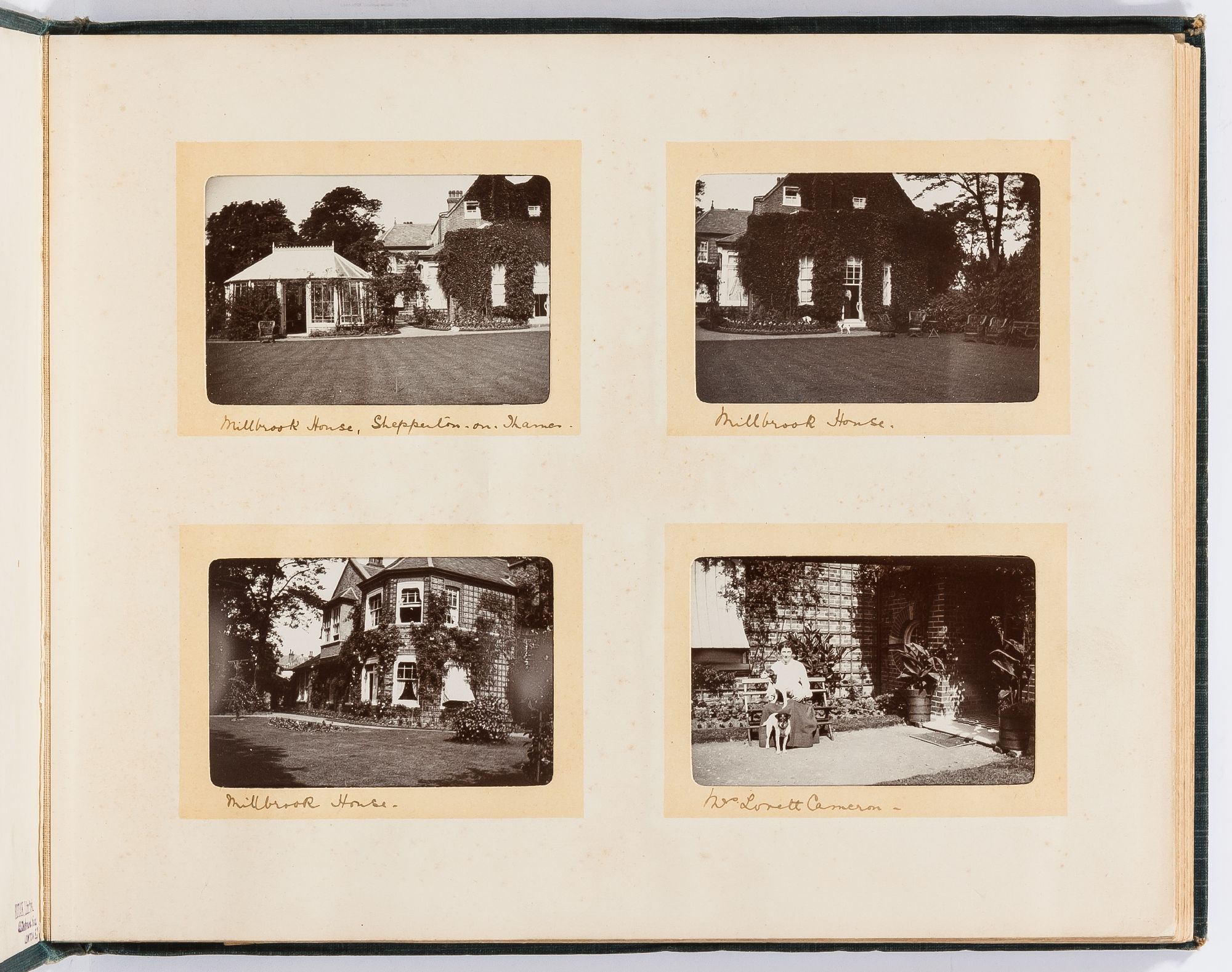 A collection of four Kodak Souvenir photo albums kept by a woman in an upper middleclass British family at the turn of the century. The albums all bear the name and address of Edythe M. Unwin who lived at Evelyn Gardens in London. The albums begin in 1900 and continue through 1903 and include Kodak snapshots of family and friends and the events and excursions they participated in. The first album takes place on a trip to Newcastle with photos of well-dressed women at a country estate, bathing in the sea, and a tea party with little girls in fashionable hats. The family also visited the 3rd Dragoon Guards and photographed the men on horseback and performing drills. One photo shows the matriarch of the family on her stomach shooting with one of the officers. The second album begins in 1902 with a trip to Lindfield, Sussex and begins with the family on horseback and later going to a horseshow. They also played a croquet tournament at an estate and posed with animals on a farm. Later in the album a trip to the continent in 1903 is depicted. They traveled by boat to Corsica and onward to Sicily where they photographed local people and landmarks. The third album is a continuation of 1903 and begins with a trip to Shepperton-on-Thames with a visit to Millbrook House. At Millbrook they are seen posed around the house as well as watching the Millbrook Polo Club match and later a cricket match. Later they visited Whitmoor cottage and went horseback riding and had dinner parties. The final album includes horseback riding and photos of the horses in their stables. Later in the album a family home is seen with photos showing the interior of the house and people posing around it.
