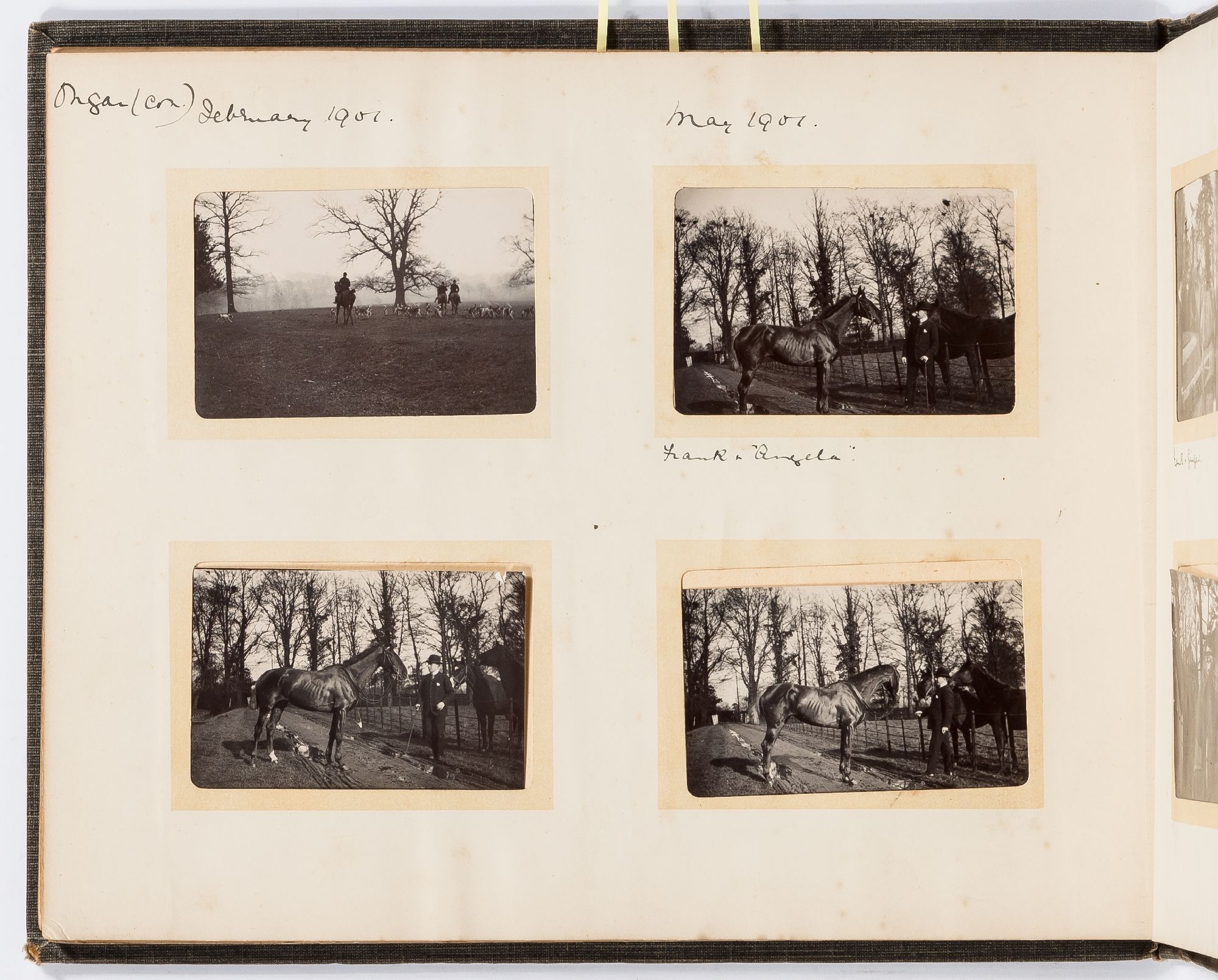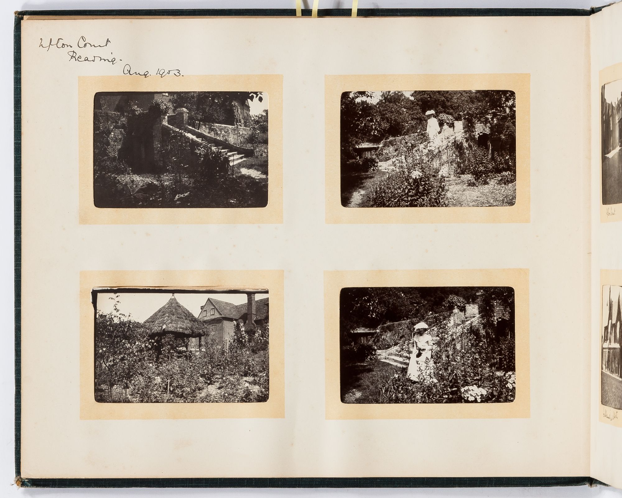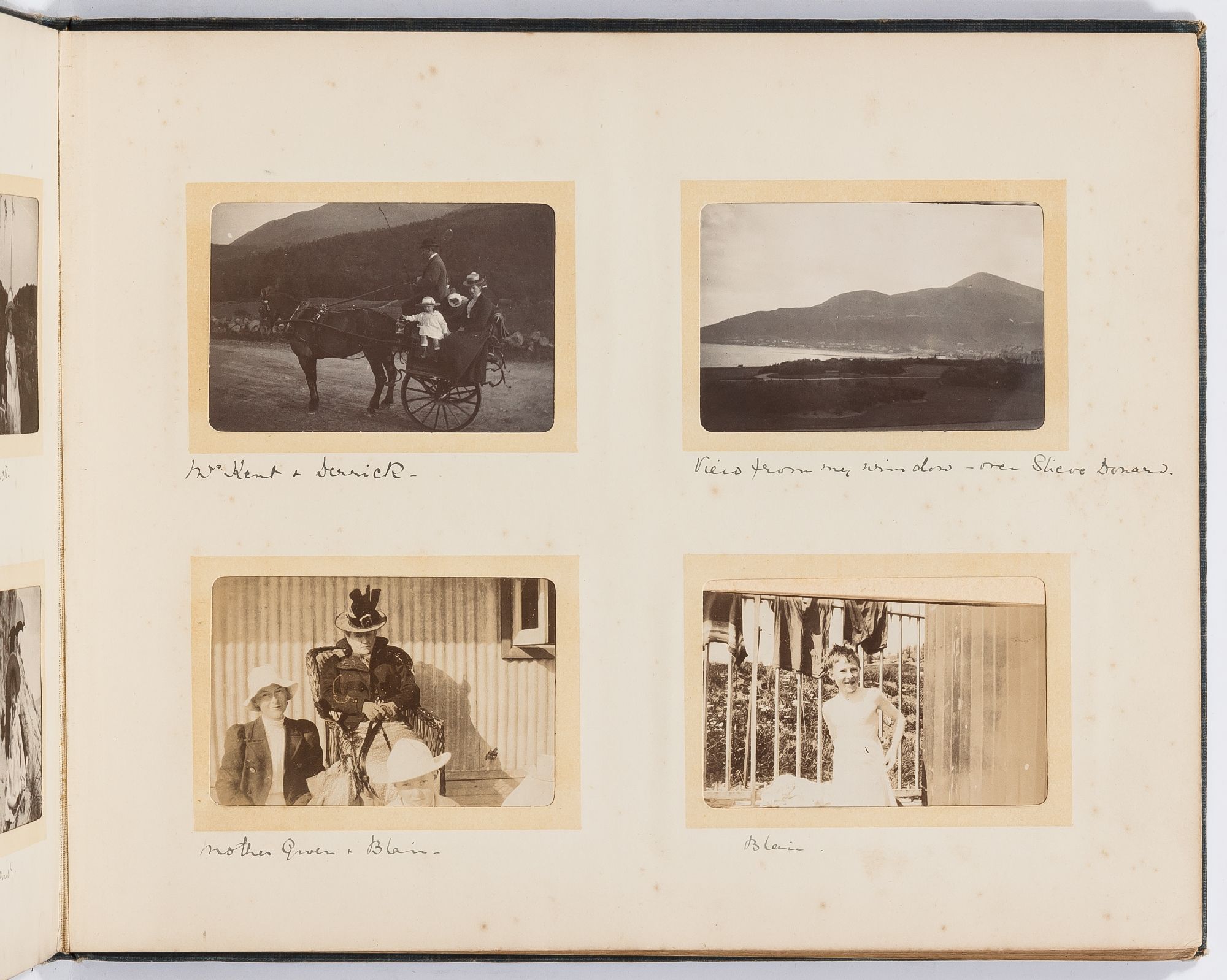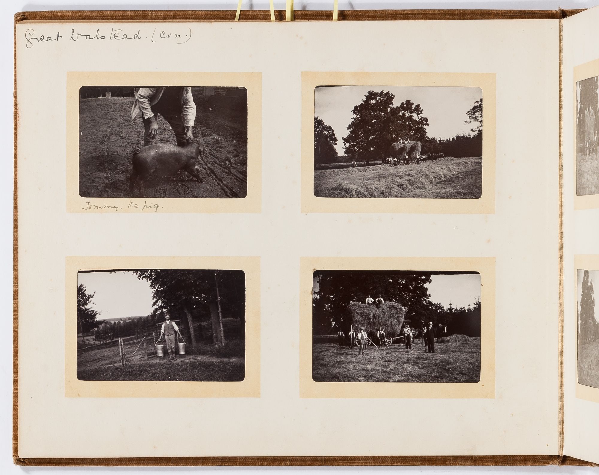 A collection of four Kodak Souvenir photo albums kept by a woman in an upper middleclass British family at the turn of the century. The albums all bear the name and address of Edythe M. Unwin who lived at Evelyn Gardens in London. The albums begin in 1900 and continue through 1903 and include Kodak snapshots of family and friends and the events and excursions they participated in. The first album takes place on a trip to Newcastle with photos of well-dressed women at a country estate, bathing in the sea, and a tea party with little girls in fashionable hats. The family also visited the 3rd Dragoon Guards and photographed the men on horseback and performing drills. One photo shows the matriarch of the family on her stomach shooting with one of the officers. The second album begins in 1902 with a trip to Lindfield, Sussex and begins with the family on horseback and later going to a horseshow. They also played a croquet tournament at an estate and posed with animals on a farm. Later in the album a trip to the continent in 1903 is depicted. They traveled by boat to Corsica and onward to Sicily where they photographed local people and landmarks. The third album is a continuation of 1903 and begins with a trip to Shepperton-on-Thames with a visit to Millbrook House. At Millbrook they are seen posed around the house as well as watching the Millbrook Polo Club match and later a cricket match. Later they visited Whitmoor cottage and went horseback riding and had dinner parties. The final album includes horseback riding and photos of the horses in their stables. Later in the album a family home is seen with photos showing the interior of the house and people posing around it.