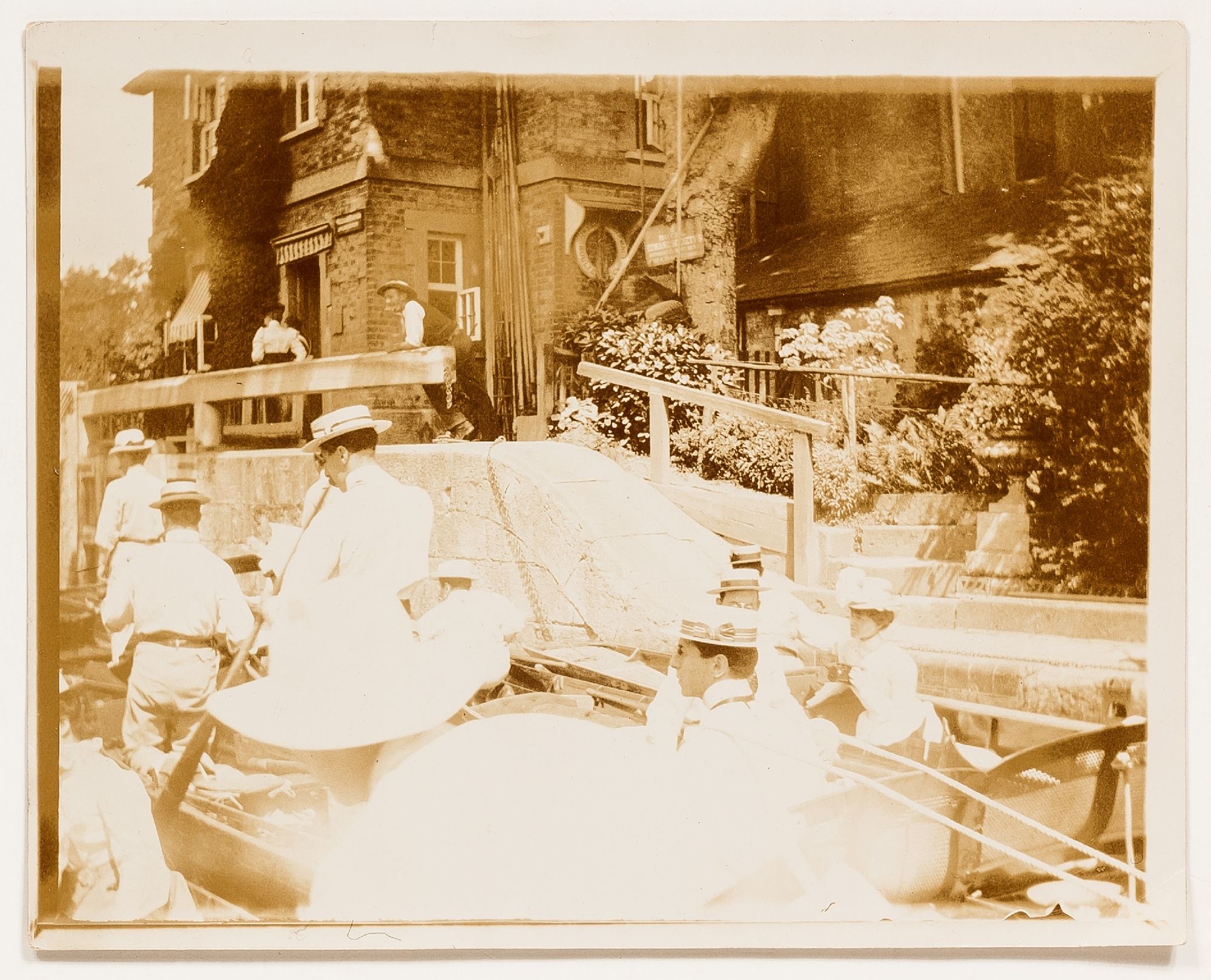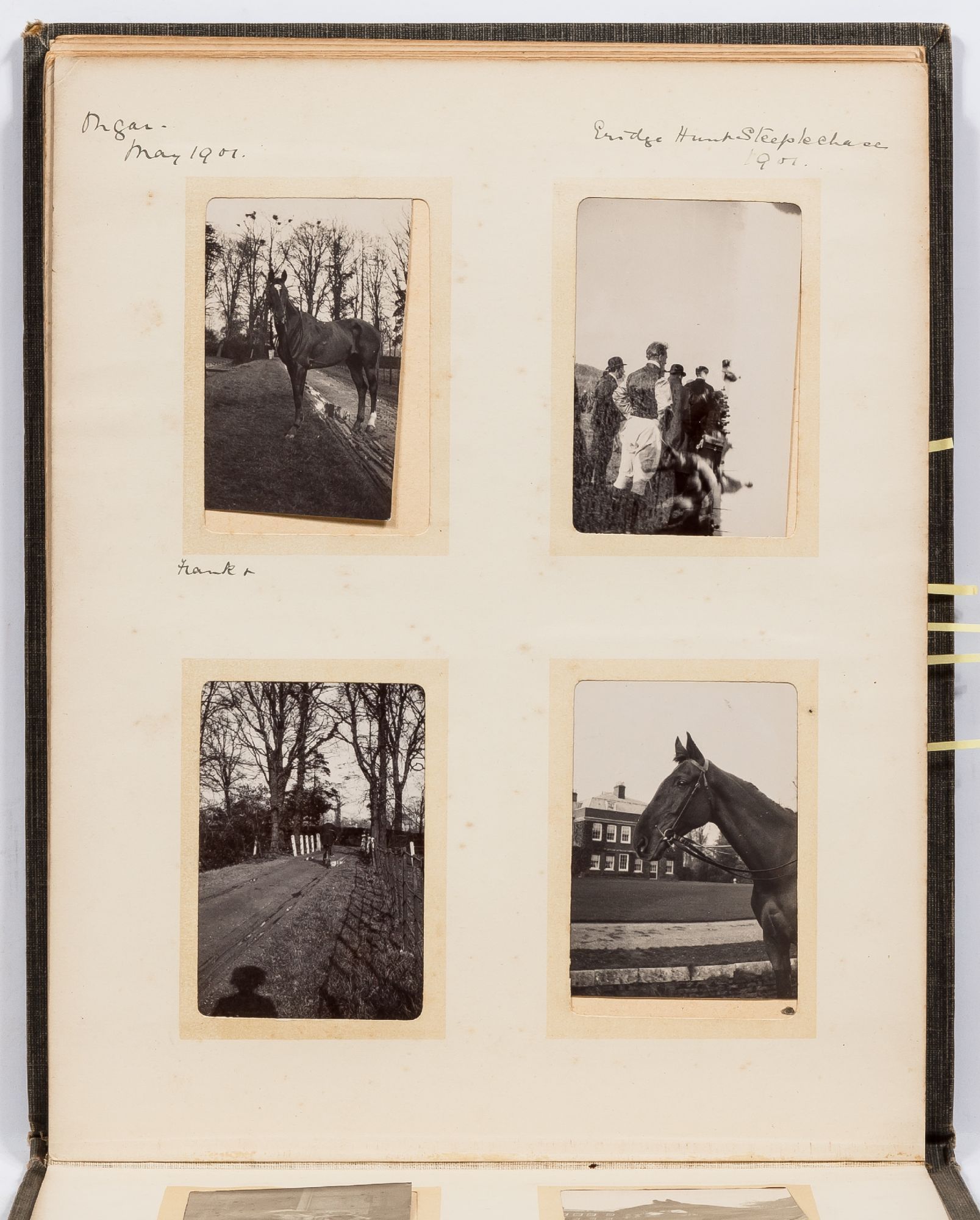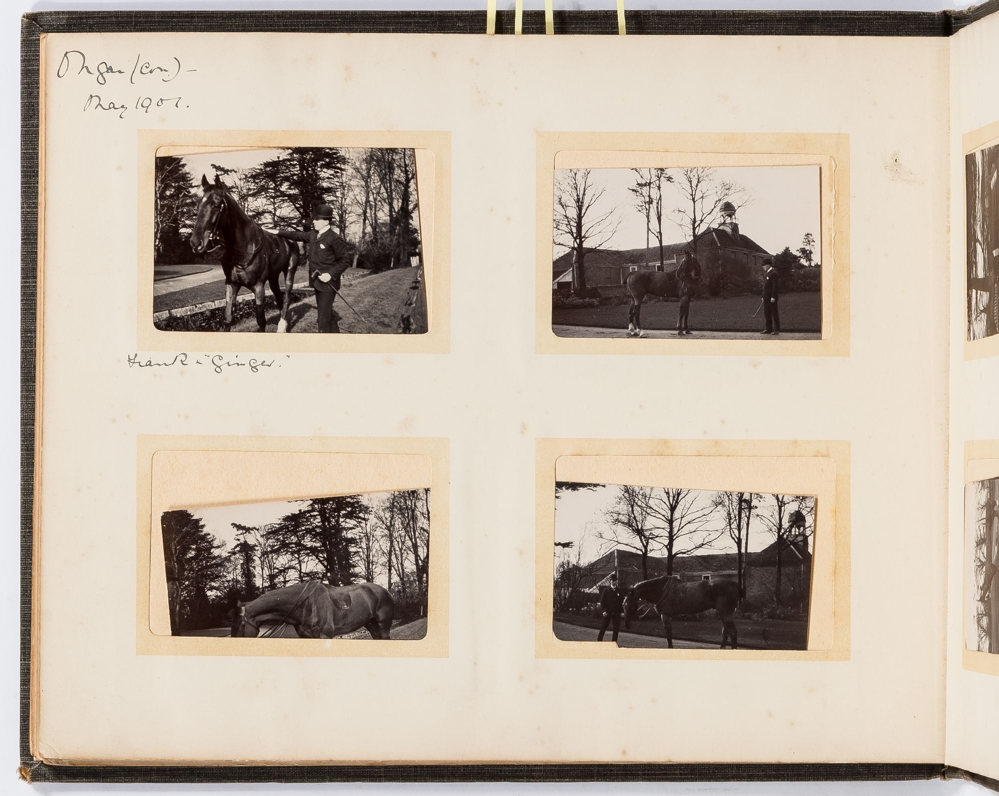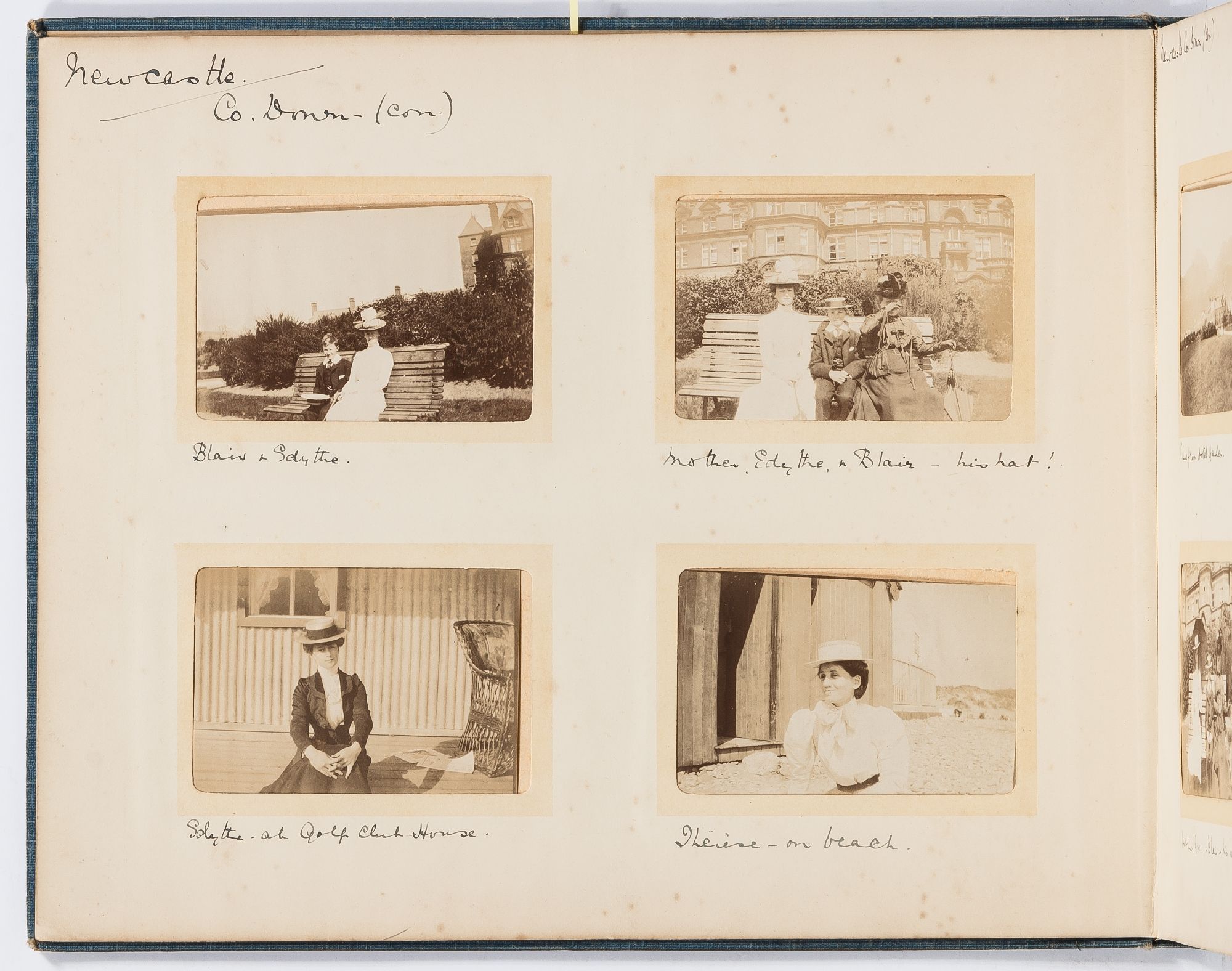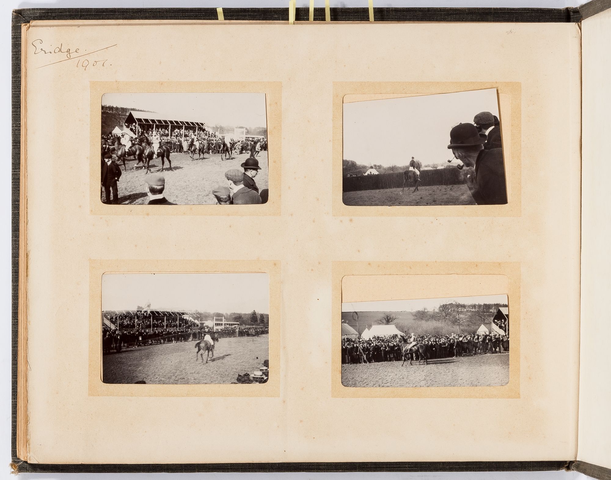 A collection of four Kodak Souvenir photo albums kept by a woman in an upper middleclass British family at the turn of the century. The albums all bear the name and address of Edythe M. Unwin who lived at Evelyn Gardens in London. The albums begin in 1900 and continue through 1903 and include Kodak snapshots of family and friends and the events and excursions they participated in. The first album takes place on a trip to Newcastle with photos of well-dressed women at a country estate, bathing in the sea, and a tea party with little girls in fashionable hats. The family also visited the 3rd Dragoon Guards and photographed the men on horseback and performing drills. One photo shows the matriarch of the family on her stomach shooting with one of the officers. The second album begins in 1902 with a trip to Lindfield, Sussex and begins with the family on horseback and later going to a horseshow. They also played a croquet tournament at an estate and posed with animals on a farm. Later in the album a trip to the continent in 1903 is depicted. They traveled by boat to Corsica and onward to Sicily where they photographed local people and landmarks. The third album is a continuation of 1903 and begins with a trip to Shepperton-on-Thames with a visit to Millbrook House. At Millbrook they are seen posed around the house as well as watching the Millbrook Polo Club match and later a cricket match. Later they visited Whitmoor cottage and went horseback riding and had dinner parties. The final album includes horseback riding and photos of the horses in their stables. Later in the album a family home is seen with photos showing the interior of the house and people posing around it.