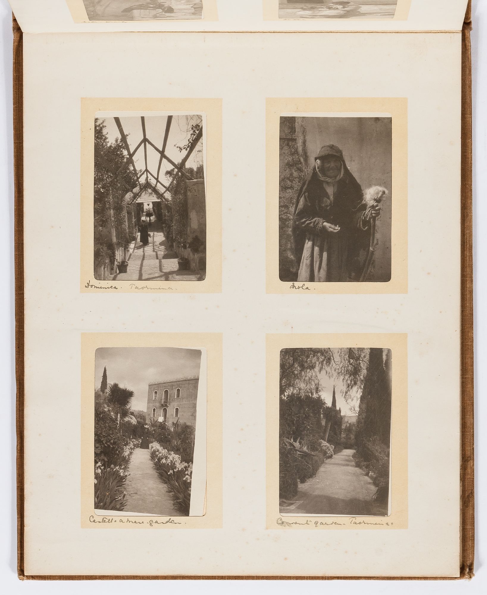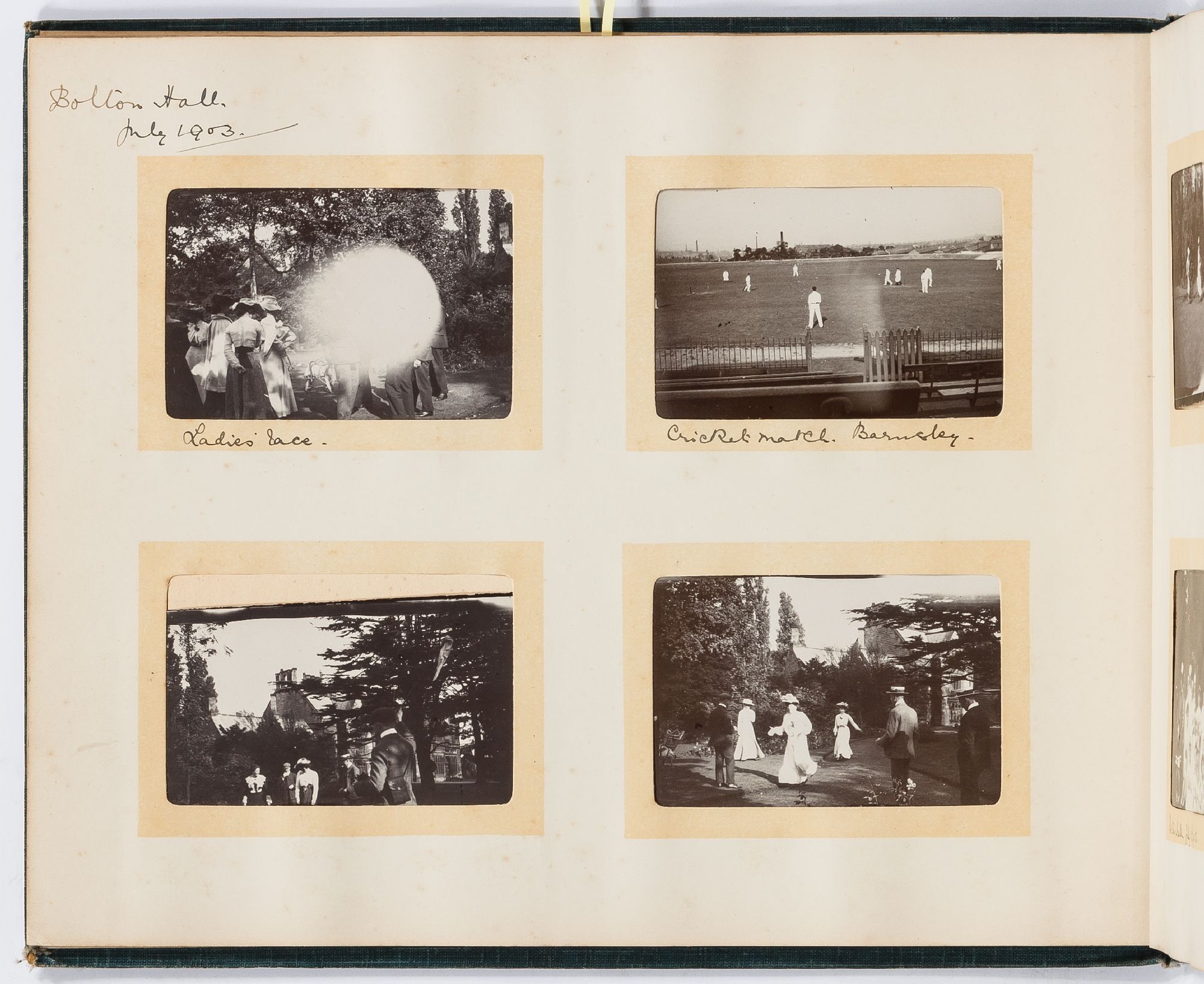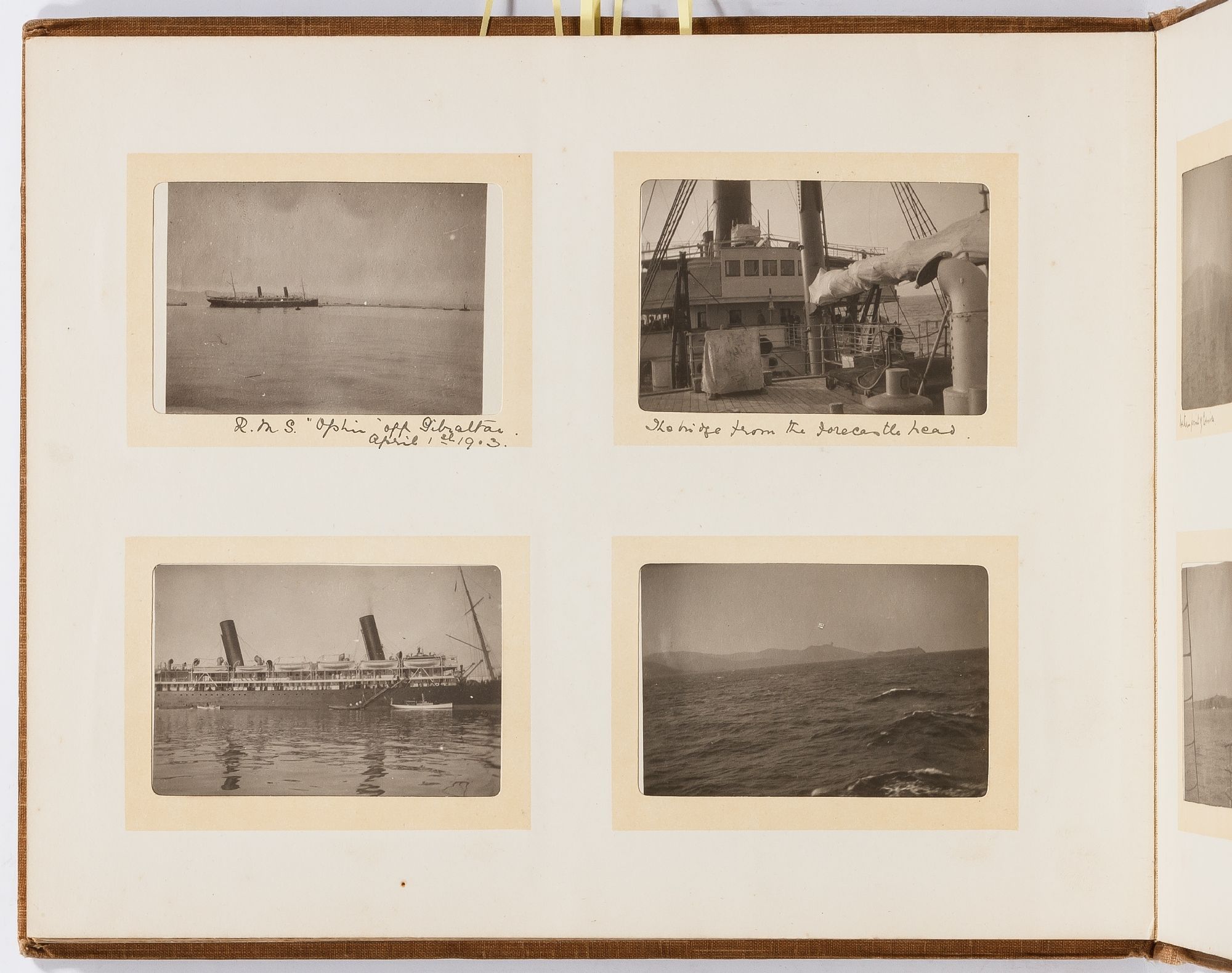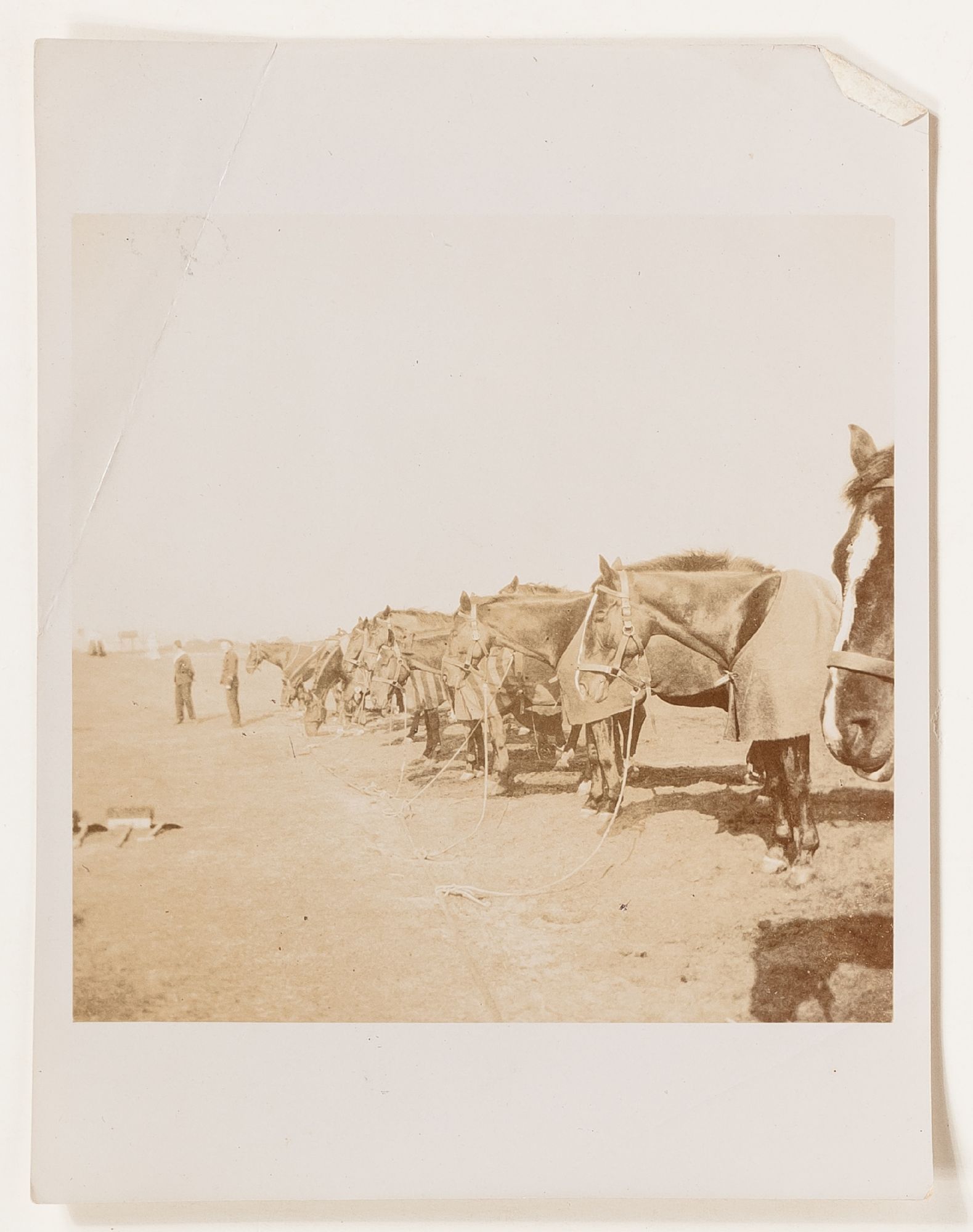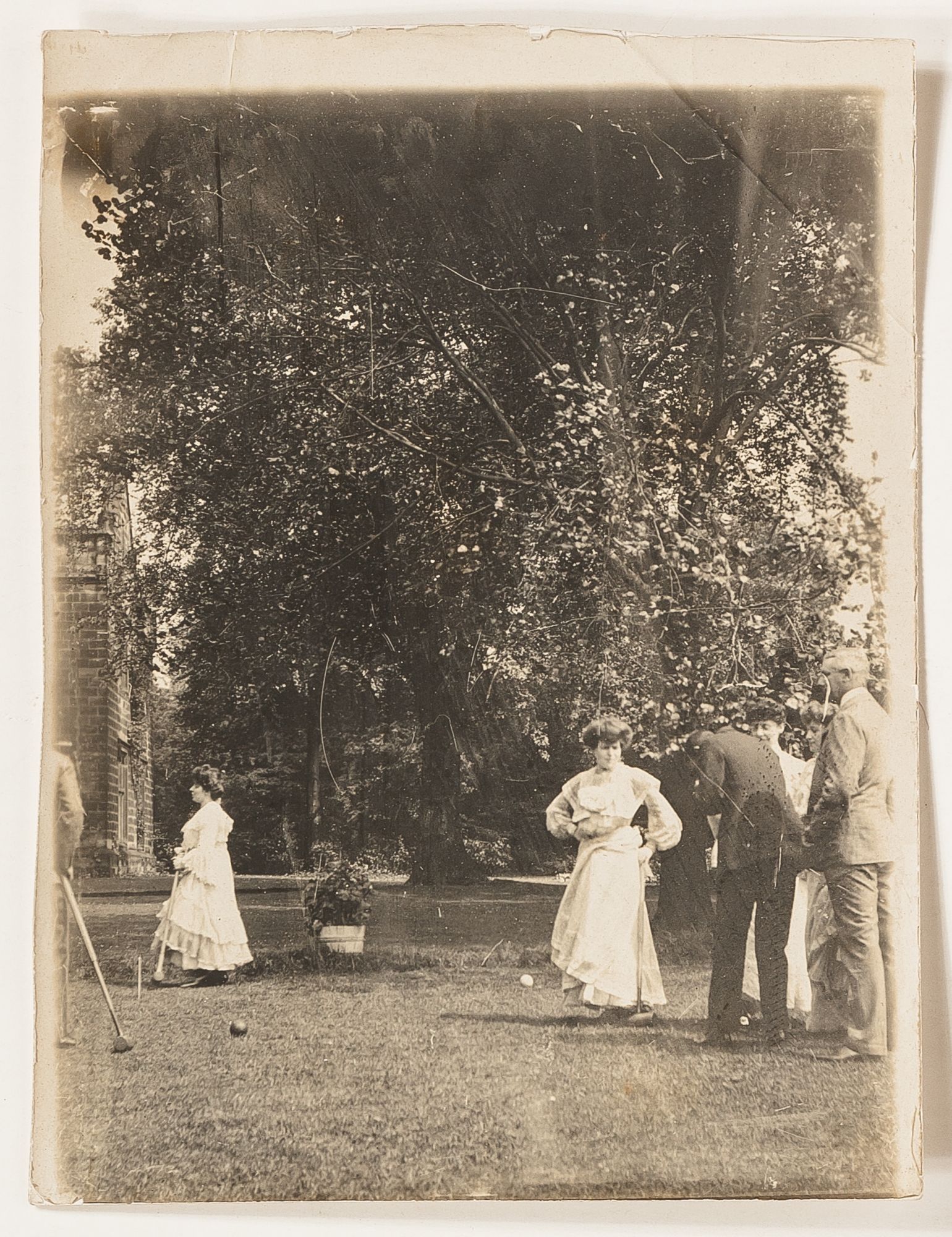 A collection of four Kodak Souvenir photo albums kept by a woman in an upper middleclass British family at the turn of the century. The albums all bear the name and address of Edythe M. Unwin who lived at Evelyn Gardens in London. The albums begin in 1900 and continue through 1903 and include Kodak snapshots of family and friends and the events and excursions they participated in. The first album takes place on a trip to Newcastle with photos of well-dressed women at a country estate, bathing in the sea, and a tea party with little girls in fashionable hats. The family also visited the 3rd Dragoon Guards and photographed the men on horseback and performing drills. One photo shows the matriarch of the family on her stomach shooting with one of the officers. The second album begins in 1902 with a trip to Lindfield, Sussex and begins with the family on horseback and later going to a horseshow. They also played a croquet tournament at an estate and posed with animals on a farm. Later in the album a trip to the continent in 1903 is depicted. They traveled by boat to Corsica and onward to Sicily where they photographed local people and landmarks. The third album is a continuation of 1903 and begins with a trip to Shepperton-on-Thames with a visit to Millbrook House. At Millbrook they are seen posed around the house as well as watching the Millbrook Polo Club match and later a cricket match. Later they visited Whitmoor cottage and went horseback riding and had dinner parties. The final album includes horseback riding and photos of the horses in their stables. Later in the album a family home is seen with photos showing the interior of the house and people posing around it.