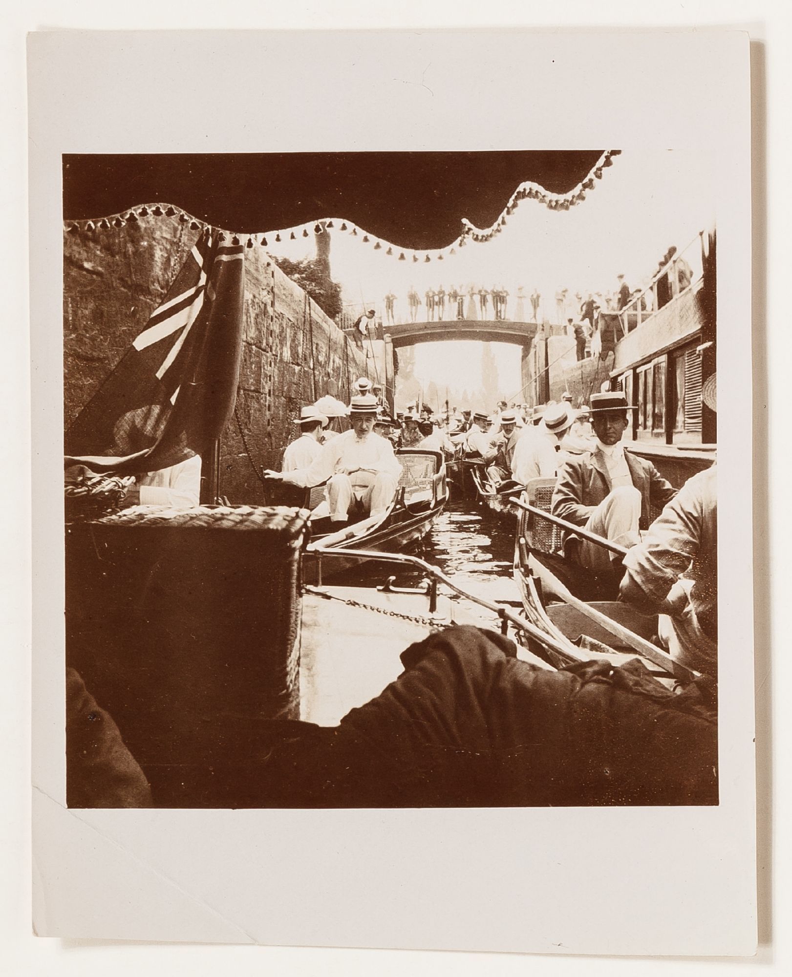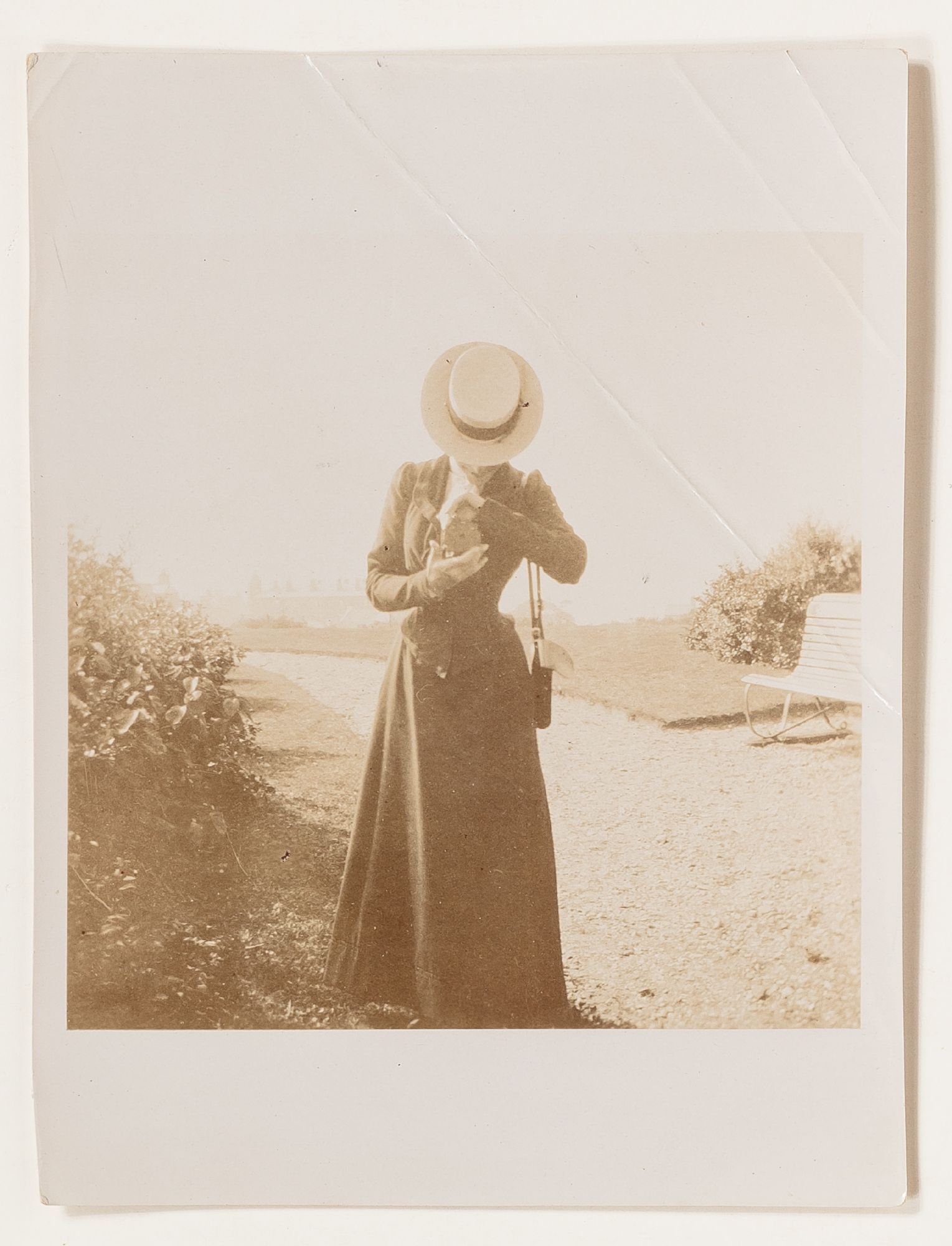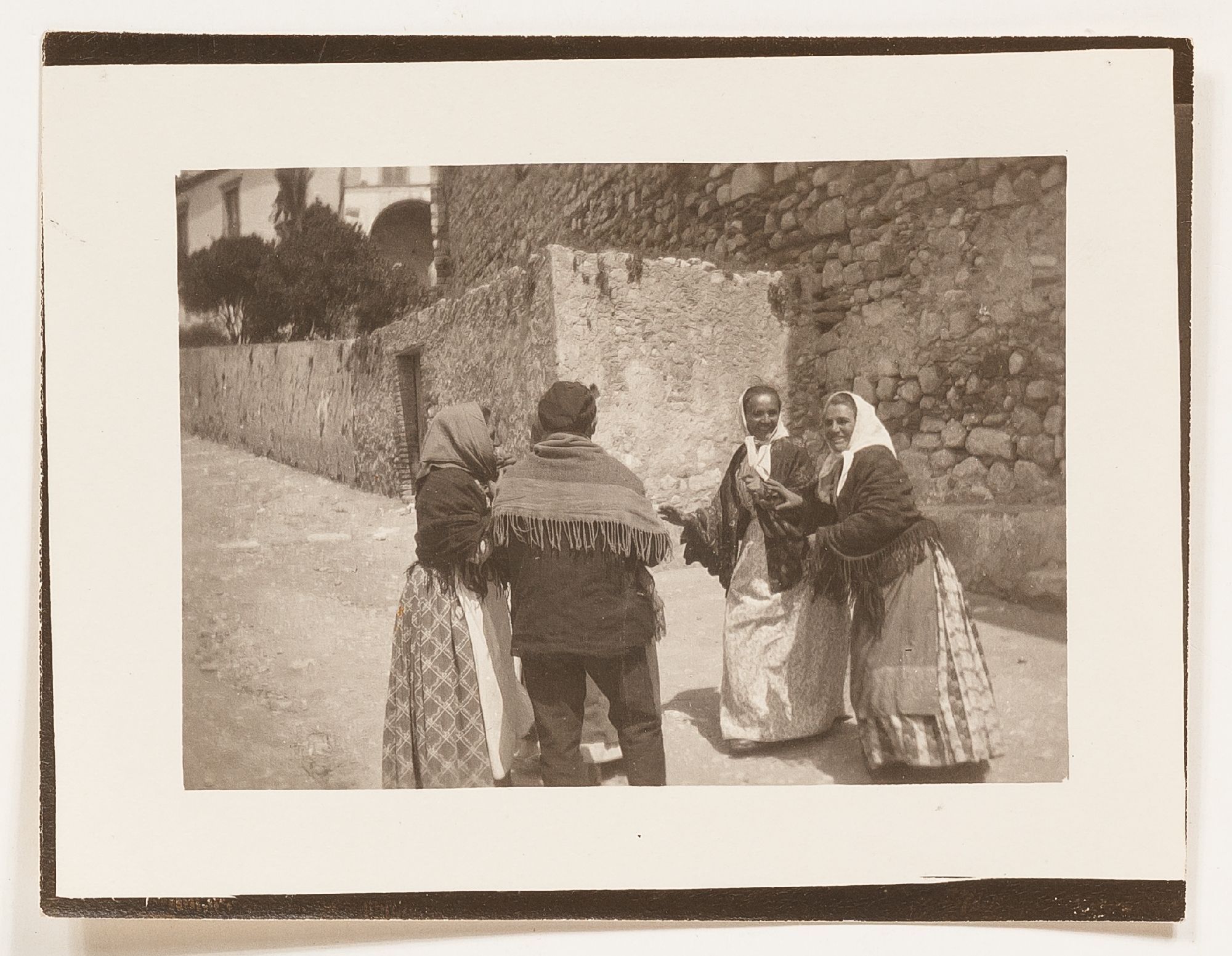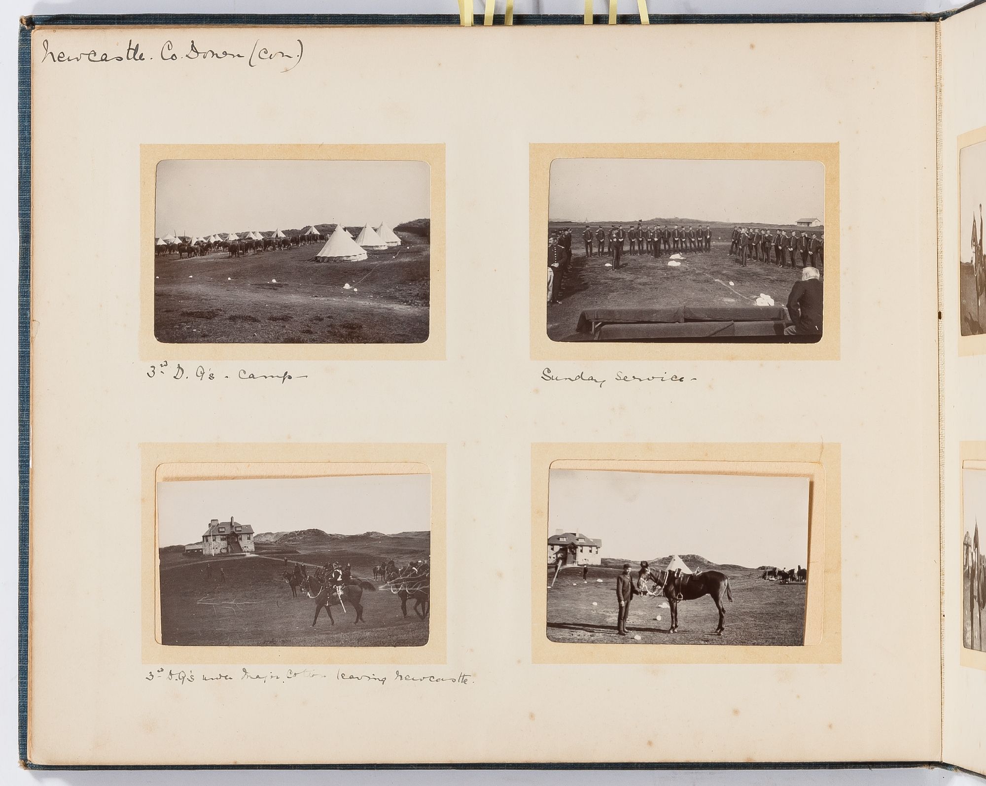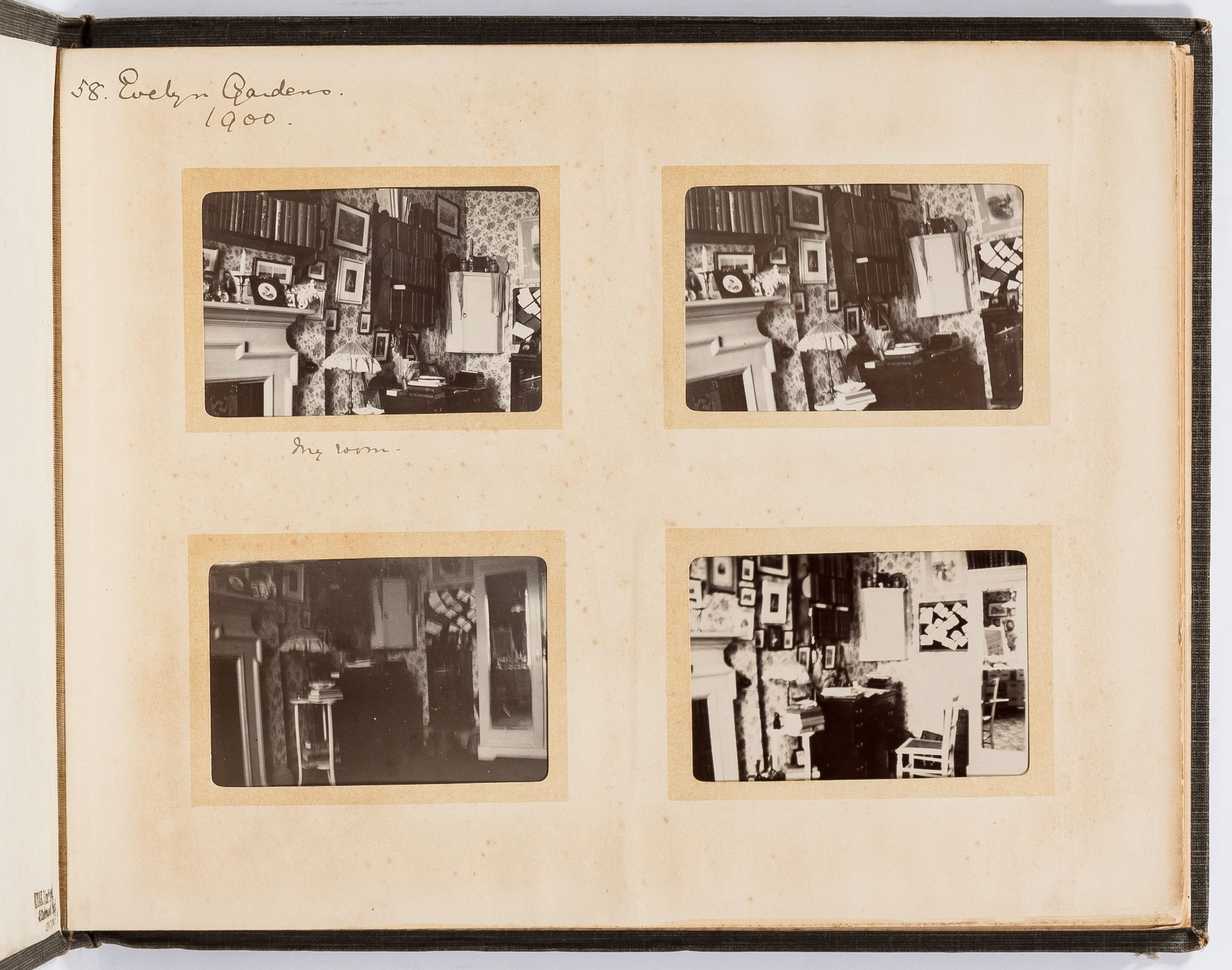 A collection of four Kodak Souvenir photo albums kept by a woman in an upper middleclass British family at the turn of the century. The albums all bear the name and address of Edythe M. Unwin who lived at Evelyn Gardens in London. The albums begin in 1900 and continue through 1903 and include Kodak snapshots of family and friends and the events and excursions they participated in. The first album takes place on a trip to Newcastle with photos of well-dressed women at a country estate, bathing in the sea, and a tea party with little girls in fashionable hats. The family also visited the 3rd Dragoon Guards and photographed the men on horseback and performing drills. One photo shows the matriarch of the family on her stomach shooting with one of the officers. The second album begins in 1902 with a trip to Lindfield, Sussex and begins with the family on horseback and later going to a horseshow. They also played a croquet tournament at an estate and posed with animals on a farm. Later in the album a trip to the continent in 1903 is depicted. They traveled by boat to Corsica and onward to Sicily where they photographed local people and landmarks. The third album is a continuation of 1903 and begins with a trip to Shepperton-on-Thames with a visit to Millbrook House. At Millbrook they are seen posed around the house as well as watching the Millbrook Polo Club match and later a cricket match. Later they visited Whitmoor cottage and went horseback riding and had dinner parties. The final album includes horseback riding and photos of the horses in their stables. Later in the album a family home is seen with photos showing the interior of the house and people posing around it.