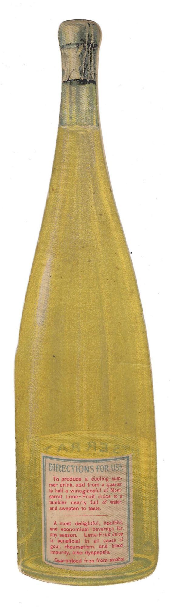 Liverpool, England: Evans, Sons & Co, 1900. Very good to near-fine. Minor toning, hinge/joint a little worn, one minor crease to neck of bottle.. Chromolithographed die-cut pamphlet in the shape of a bottle, advertising Montserrat Lime-Fruit Juice, "A most delightful, healthful, and economical beverage for any season. Lime-Fruit Juice is beneficial in all cases of gout, rheumatism, and blood impurity, also dyspepsia. Guaranteed free from alcohol" (back).