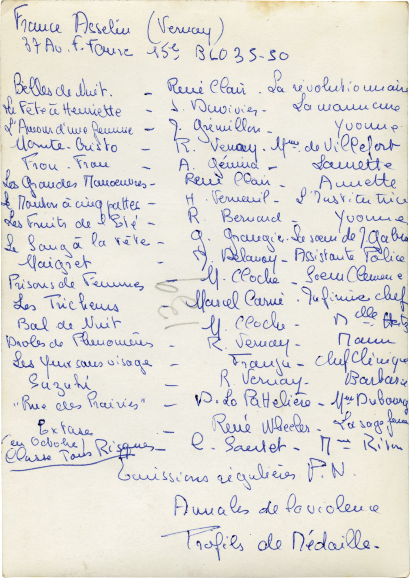 Asselin's film credits include "Cecile Is Dead" (1944), "the Love of a Woman," (1953), "Blood to the Head" (1956), "Inspector Maigret" (1958), "Youthful Sinners" (1958), "Eyes Without a Face" (1960), and "Les Bonnes Femmes" (1960), and she was married to director Robert Vernay.