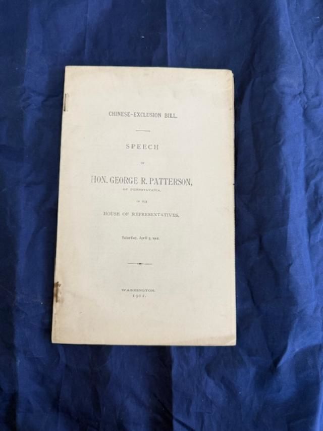 Pamphlet, 8vo, 7 pp. Some soiling to outer pages, staples rusted, miniscule chip to edge, normal aging; very good. This pamphlet could be taken from today's headlines concerning immigration. Patterson argues in favor of excluding Chinese immigrants to protect American labor. The Chinese had been coming to America from the 1840s, and continued to do so until the Chinese Exclusion Act of 1882. That ran its course, and Patterson tried again in 1902. This appears to be a rather scarce pamphlet; no copies listed in auction records and only 2 copies located at OCLC.