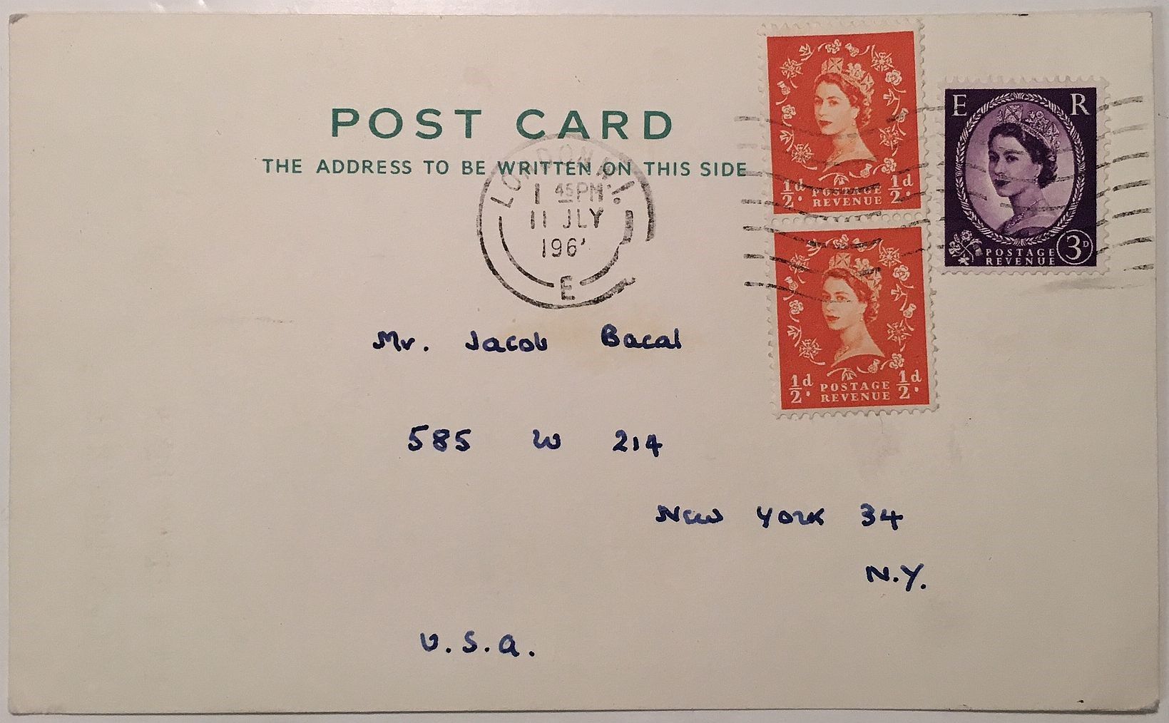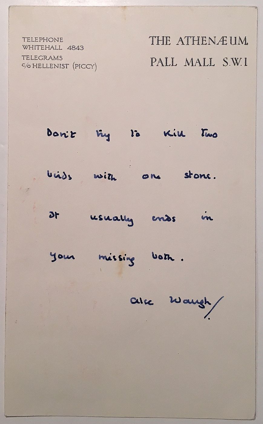 Pall Mall, 1961. unbound. Written on the back of a postcard, Pall Mall S.W.I, England, postmarked on July 11, 1961, in full: "Don't try to kill two birds with one stone. It usually ends in your missing both." Very good(+) condition.