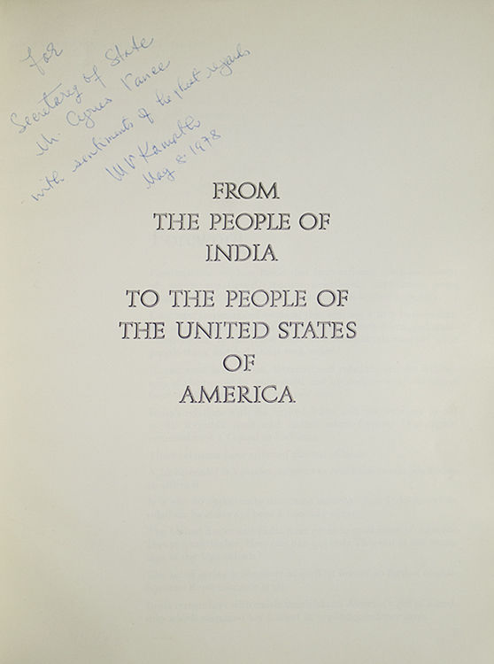 Washington, D.C.: Embassy of India, 1976. First edition. 222 pp. 4to. Original blue silk-covered boards, dust jacket. Front hinge over-opened, some minor edgewear to jacket. First edition. 222 pp. 4to. INSCRIBED by the author to then Secretary of State Cyrus Vance (1917-2002). Vance occupied the post 1977-1980, succeeding Henry Kissinger. He accompanied President Carter on his historic visit to India in January 1978 (a few months before this inscription) which culminated in the Delhi Declaration, in which the two nations made a strong commitment to global diplomacy and human rights. The visit was crucial in restoring good relations with India following Nixon's tilt toward Pakistan in 1971. Kamath was Washington correspondent for the Times of India from 1969 to 1978.