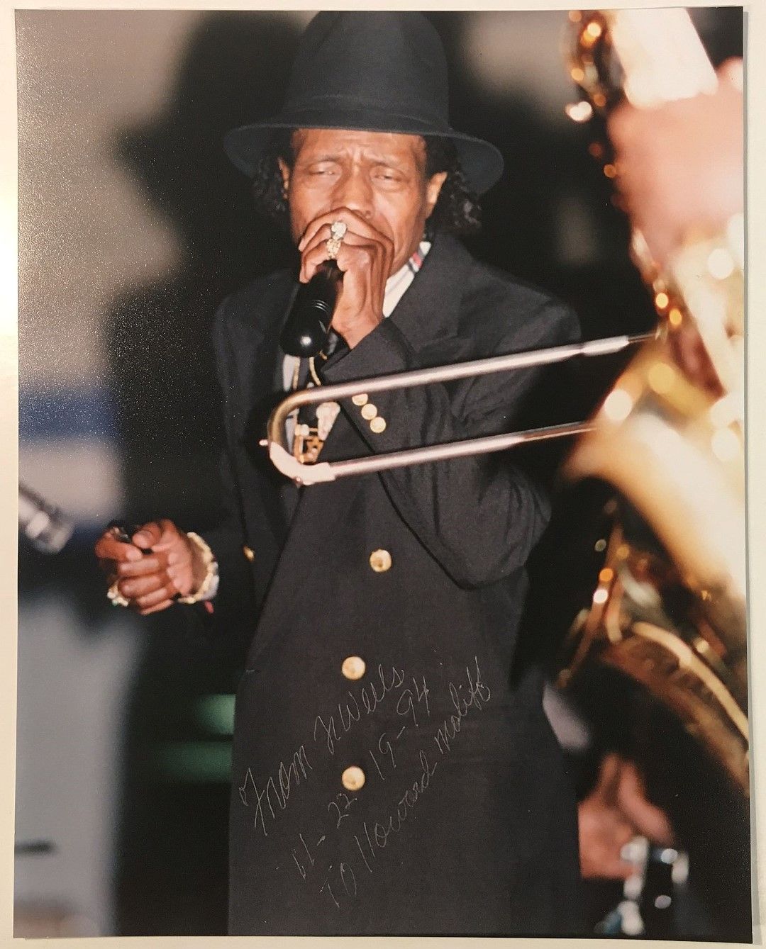1994. unbound. Outstanding matte-finish 10 x 8-inch color photo of Wells performing on stage, most likely in the 1980. Inscribed in silver ink with exceptional contrast "From Jr. Wells 11-22-94 To Howard Moliff." Fine condition.