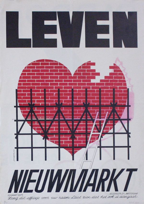 Amsterdam, 1975. Original color pictorial silkscreen poster (61x43cm.) printed in red and black on white stock; faint previous folds, minor wear from handling, else Very Good or better. Protest poster responding to the forceful clearing by riot police of the Amsterdam neighborhood of Nieuwmarkt in the process of building an underground railway. Printed along the bottom edge: "Hang dit affiesje voor uw raam. Lat zien dat het ook u aangaat" (Hang this poster from your window. Show that this concerns you too).