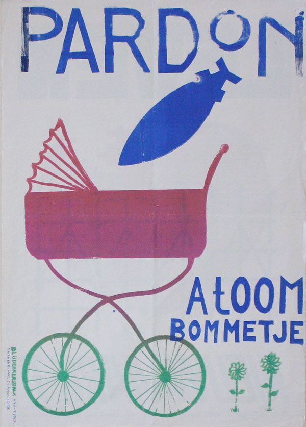 Printed silkscreen on verso, another, unrelated, pro-nuclear disarmament poster: "Pardon, Atoombommetje" ("Pardon, just a small atom bomb," attributed to Joost Ranzijn, ca. 1980). Image is printed in pastel colors and shows a small bomb heading directly for a stroller. Artist attribution from OCLC no. 943997000.