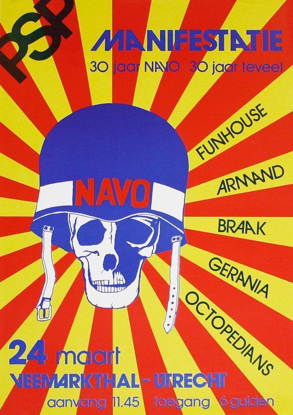 Poster: PSP Manifestatie: 30 Jaar NAVO, 30 Jaar Teveel. 24 Maart Veermarkthal, Utrecht [PSP Manifesto: 30 Years with NATO, 30 Years Too Many. March 24, Veermarkthal, Utrecht]