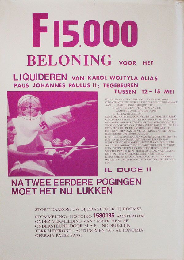 Poster: F 15.000 Beloning voor het Liquideren van Karol Wojtyla, alias Paus Johannes Paulus II, te gebeuren tussen 12-15 mei ... Na twee erd ere pogingen moet het nu lukken [Reward of 15,000 Dutch Guilders for the Liquidation of Karol Wojtyla, alias Pope Paul II, between May 12 and 15 ... After two earlier attempts it should now succeed]