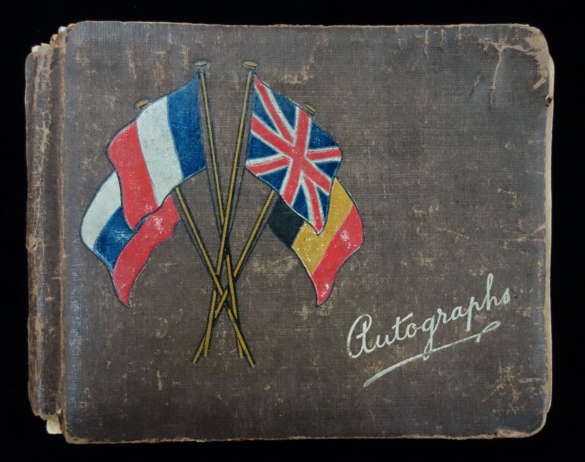 The front cover of the album is stamped with the flags of Russia, France, Britain, and Belgium. Entries consist of drawings and sketches as well as verses. The first page is a hand drawn British flag and the inscription "12th Dec 1917, Q.M.A.A.C. April 1918". An example of a verse is: