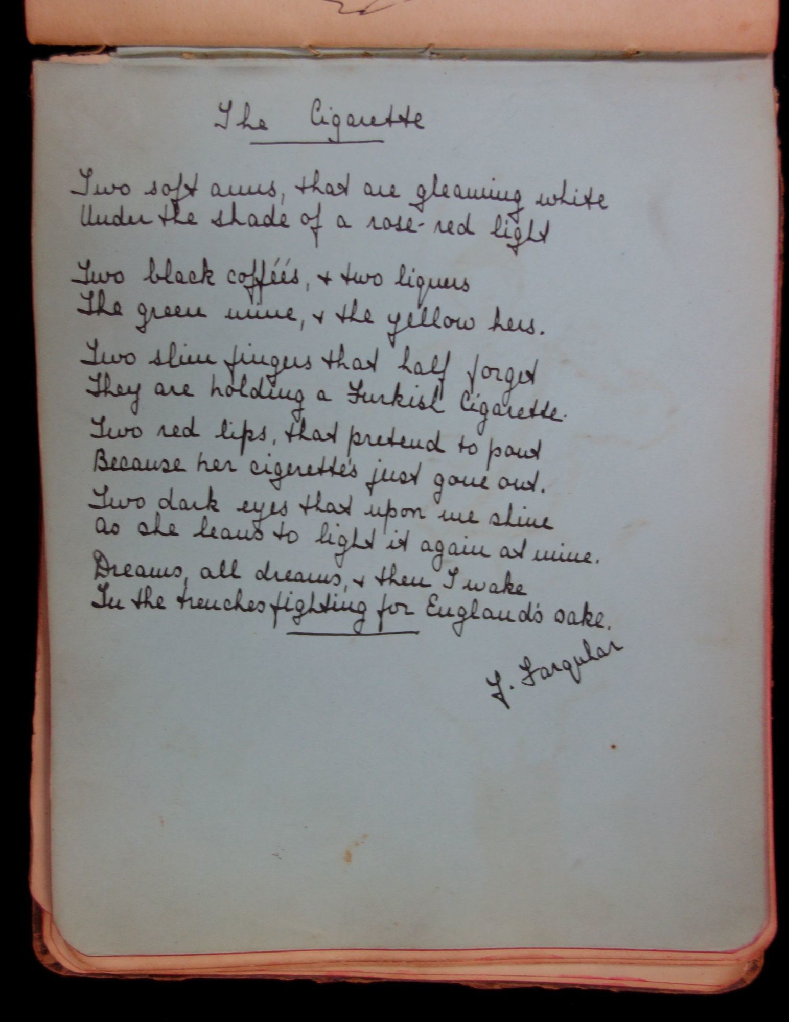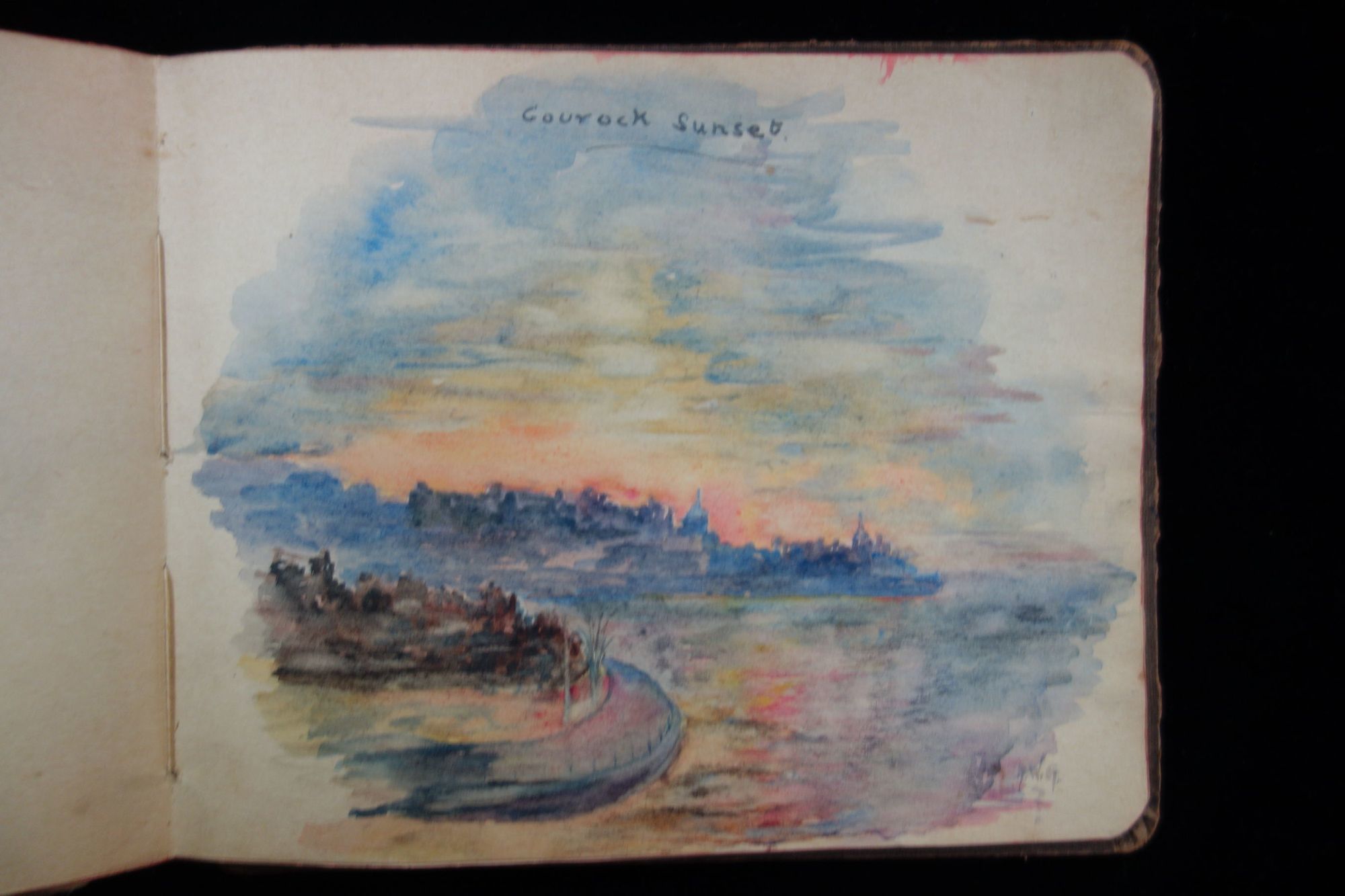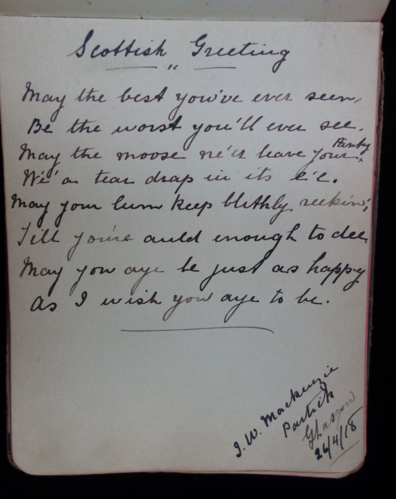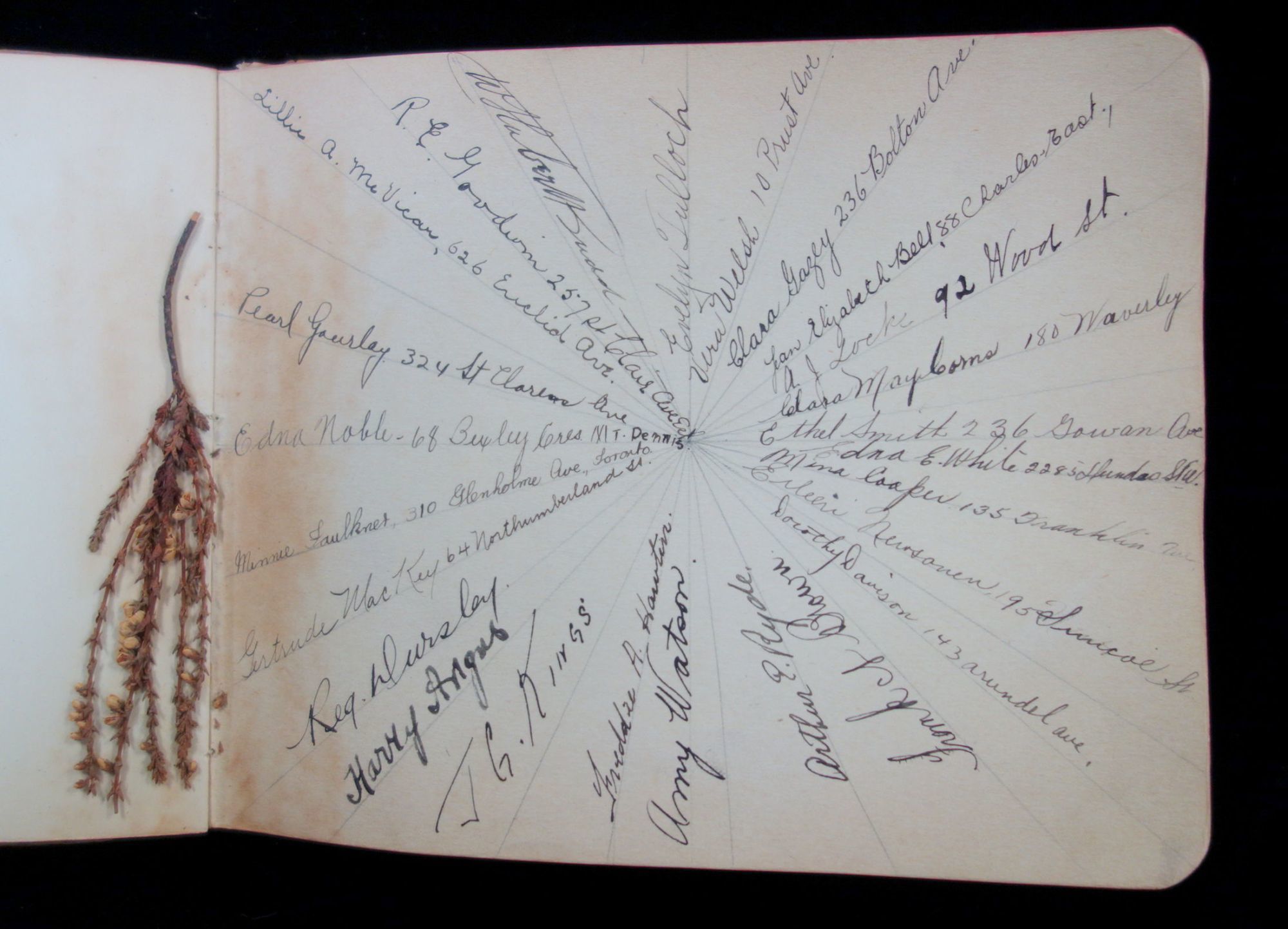 Among the verses are several drawings. For example a wonderful water color of a sunset in Gourock, Scotland, and a whimsical drawing of a kitten playing with a glove. One page has a unique listing of names written from a central point and a sprig of flowers pressed in. Dates of the signatures range 1915-1918.