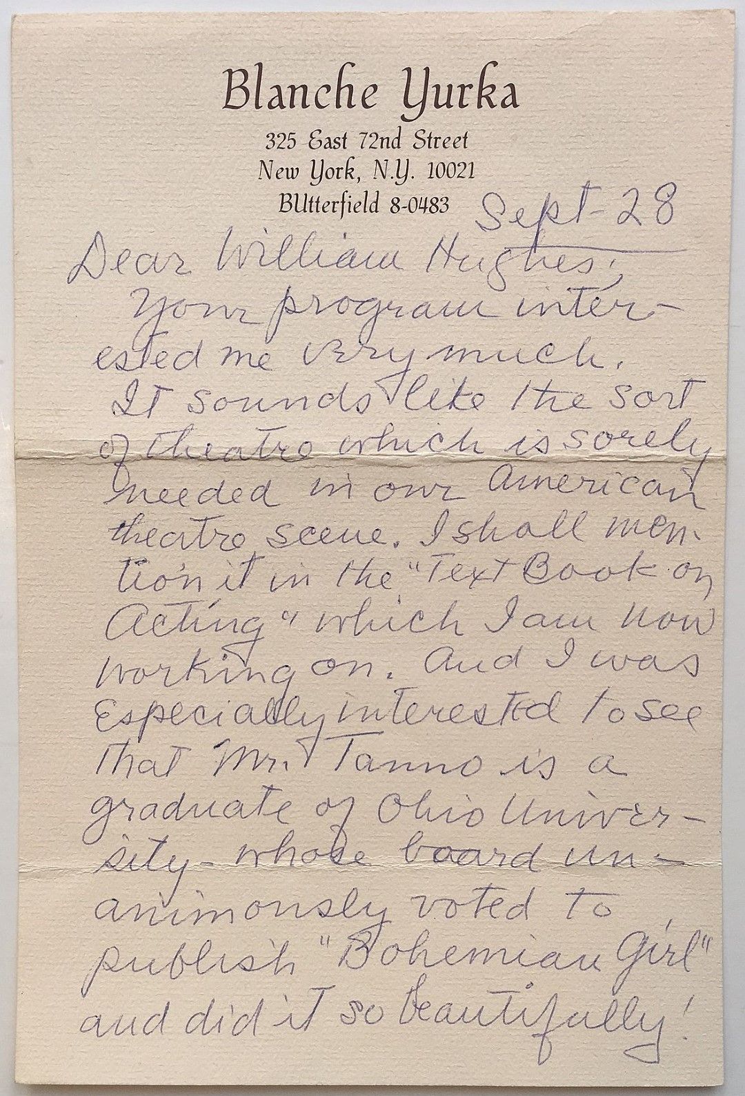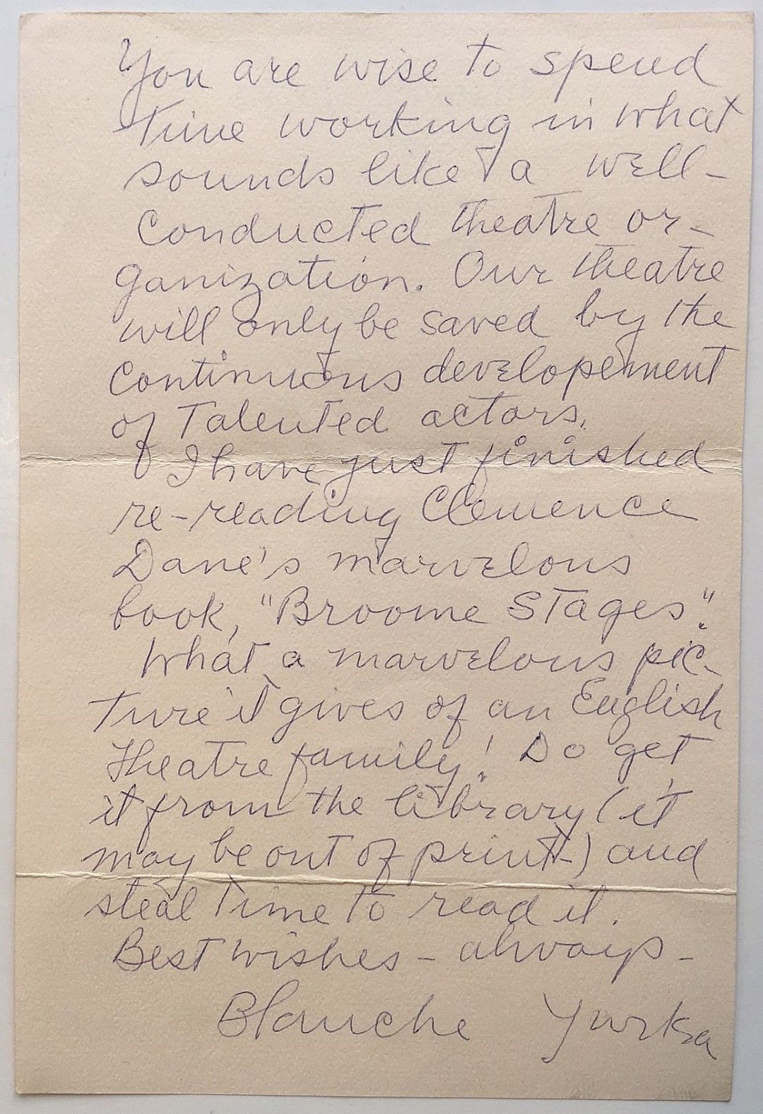 New York, 1965. unbound. 2 pages (front and back) on personal letterhead, 9 x 6 inches, New York City, no date, circa 1965, to William Hughes, theatre historian and writer, in part: "Your program interested me very much. It sounds like the sort of theatre which is sorely needed in our American theatre scene. I shall mention it in the 'Text Book on Acting' which I am now working on...Our theatre will only be saved by the continuous development of Talented Actors..." Horizontal folds; very good(+) condition.