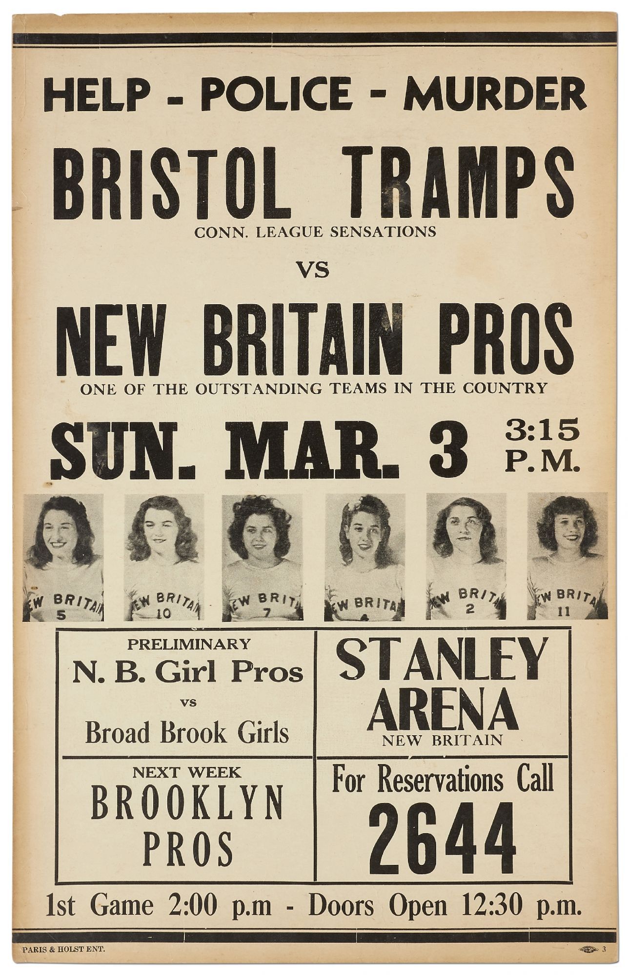 New Britain, Connecticut: [George] Paris & Holst Ent, 1946. Unbound. Near Fine. Photographically illustrated broadside on thin cardstock. Approximately 14" x 22". Modest age-toning at the extremities, else near fine. While we are unaware of the meaning of the headline "Help - Police - Murder," the poster advertises a basketball game between two fairly prominent semi-pro men's basketball teams. What is curious is that the poster is illustrated only with photographic portraits of six members of the New Britain Girl Pros, who were featured in the preliminary game. Little can be found relating to the women's teams involved other than they were likely member of the Connecticut Girls Basketball League, which we date back to at least 1901.