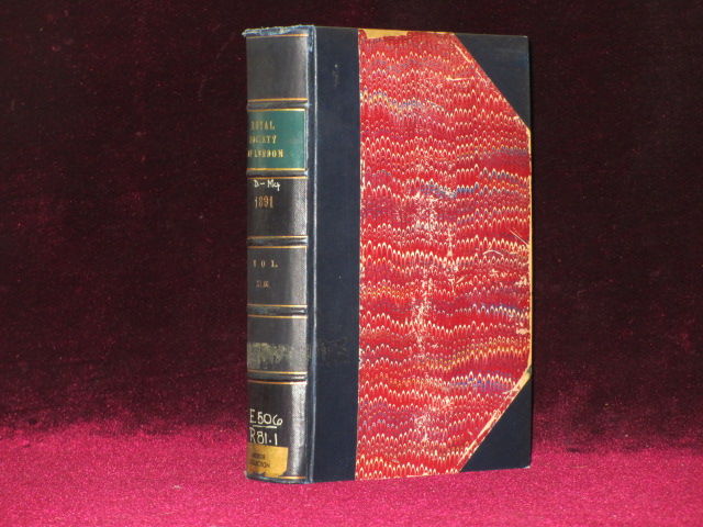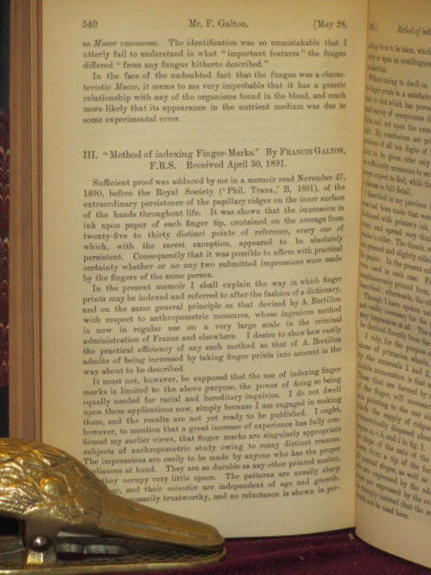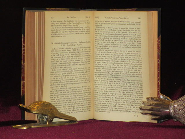 London: Harrison and Sons, 1891. First Edition. Hardcover. Very Good+/No Dust Jacket. Octavo. In volume XLIX, pages 540 - 548, of Proceedings of the Royal Soceity of London. Galton, a cousin of Charles Darwin, was much interested in anthropometric classification. On 27 November 1890, he read a paper to the Royal Society, which was printed in its Transactions, on "The Patterns of Thumb and Finger Marks." In May 1891 Galton contributed to the Proceedings of the Royal Society, "A Method of indexing Finger-Marks" In these papers, his discovery of anthropometric classification of fingerprints were announced in print for the first time. In August of that year he wrote for The Nineteenth Century a popular account of the subject under the title "Identification by Finger-Tips." In 1892, in his book "Finger Prints" Galton gathered together all these earlier studies and recorded other experiments, illustrated from photographs and drawings. The outcome of this was the appointment in 1899 of a Royal Commission which came out in favor of the adoption of the system by the British police forces. (Printing and the Mind of Man, 376). Bound in contemporary 3/4 black cloth over marbled boards, bookplate and University of PA stamped on title page; location number on spine. Internally clean and bright.