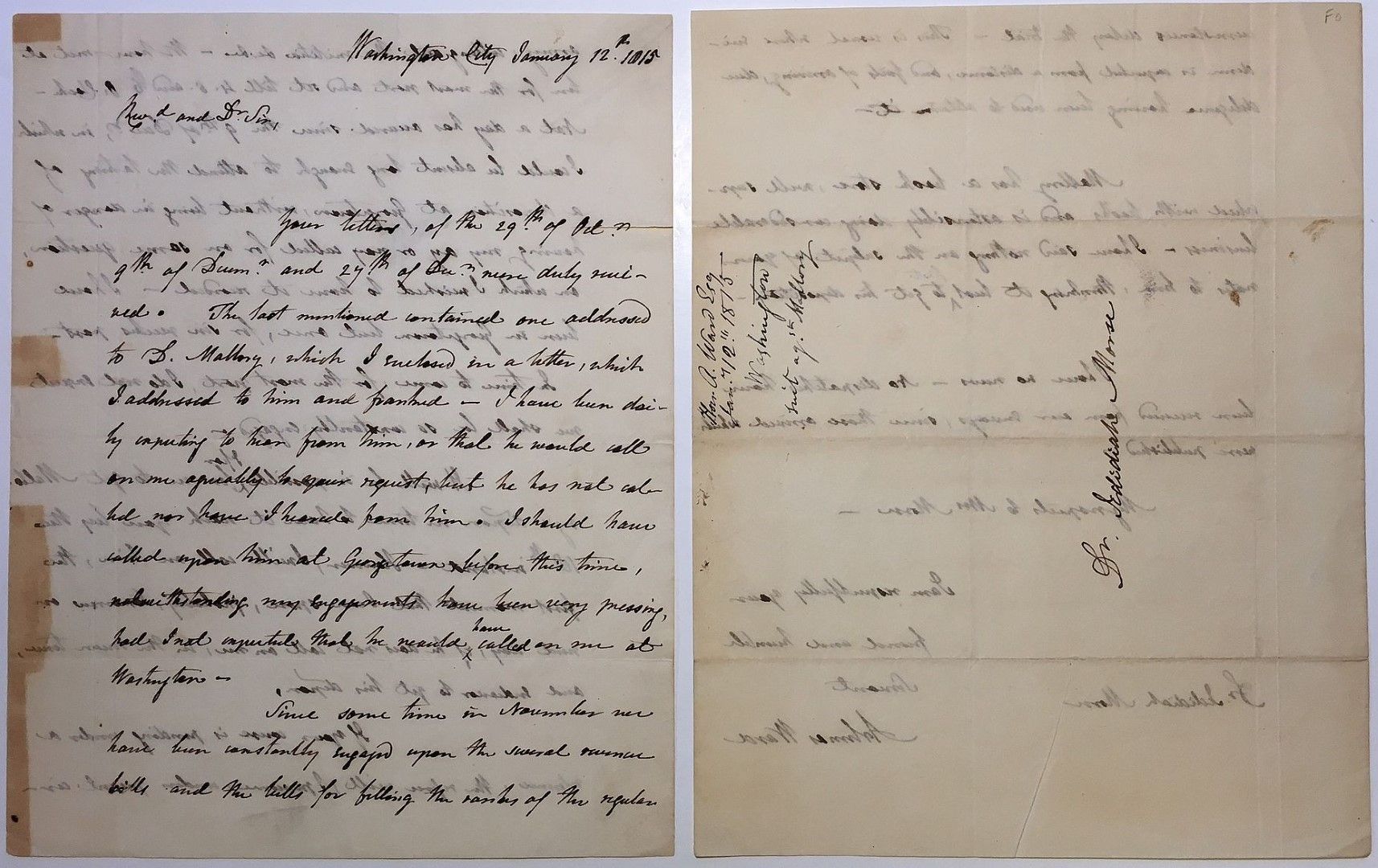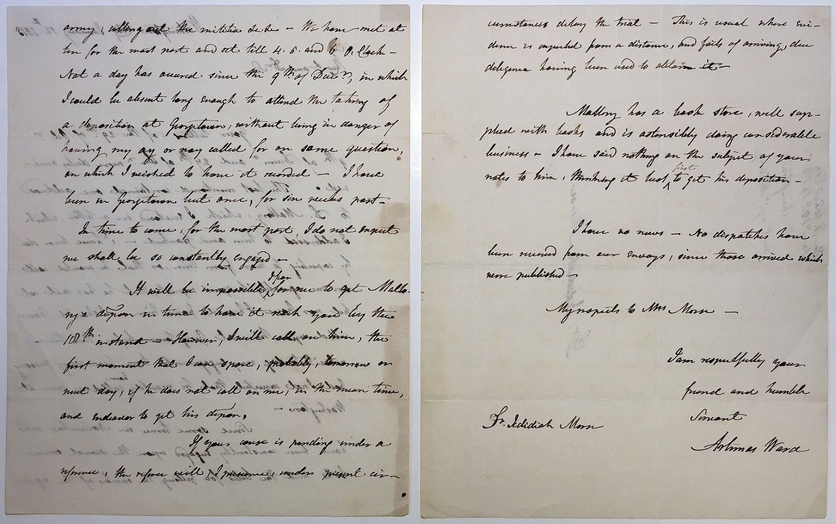 Washington, 1815. unbound. 3 pages (front and back), 9.75 x 7.75 inches, Washington, January 12, 1815, to Jedediah Morse, the father of American geography, explaining that he has taken to secure from a Mr. Mallory, the owner of a book store in Georgetown, a deposition which Morse needs for a pending lawsuit in Boston. Ward also comments on the affairs of Congress: "Since some time in November we have been constantly engaged upon the several revenue bills for filling the ranks of the regular army, calling out the militia. We have met at ten for the most part and sit till 4, 5, and 6 o'clock. No dispatches have been received from our envoys, since those arrived which were published." Note: The Treaty of Ghent ending the War of 1812 was signed in Belgium on December 24, 1814. Foxing prevalent at the left margin of the first sheet (due to previous mounting) but does not affect the text. Very good condition overall.