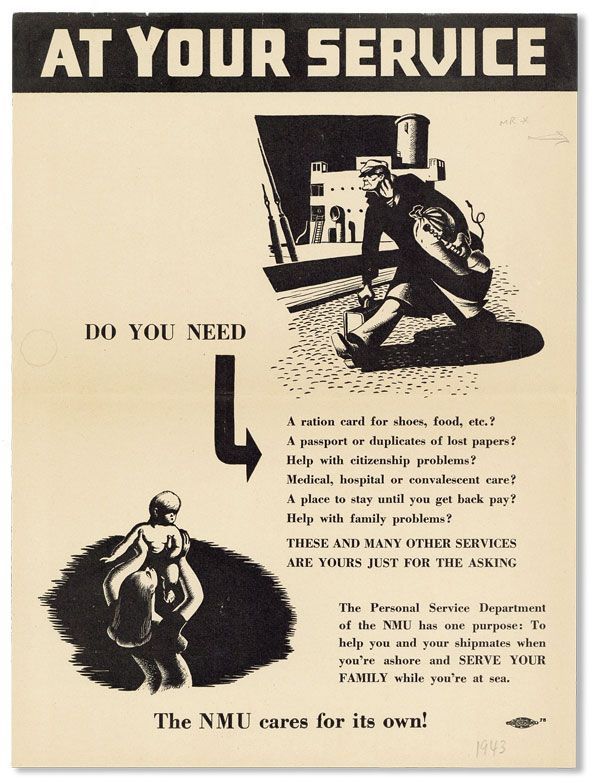 New York: NMU, n.d., ca. 1943. First Edition. Broadside (27.5x20.75cm.); two woodcut illustrations. Previous mail fold, very minor chipping along top edge, tiny dampstain at left-hand edge, else Very Good or better. Beautifully illustrated promotional broadside issued by the National Maritime Union: "Do You Need / A ration card for shoes, food, etc.? / A passport or duplicates of lost papers? ... These And Many Other Services Are Yours Just For the Asking ... The NMU cares for its own!" No copies catalogued in OCLC as of January, 2019.