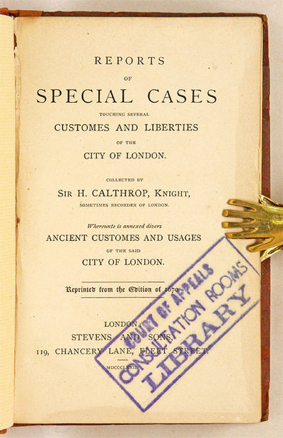 1872. Customs and Liberties of London Calthrop, Sir H[enry] [1686-1637]. Reports of Special Cases Touching Several Customes and Liberties of the City of London. Reprinted from the Edition of 1670. London: Stevens and Sons, 1872. viii, 244 pp. 12mo. (6-1/4" x 4"). Contemporary calf, rebacked in period style, blind rules to boards, raised bands, blind ornaments and lettering piece to spine, endpapers renewed. Light rubbing and a bit of gatoring to boards, moderate rubbing to extremities, corners bumped and lightly worn. Light toning to text, minor tears to margins of a few leaves. Ex-library. Inkstamp to title. A nice copy in a handsome binding. $150. * Reprint of the only edition, 1670. Calthrop was the recorder of the City of London, later an attorney of the court of wards.