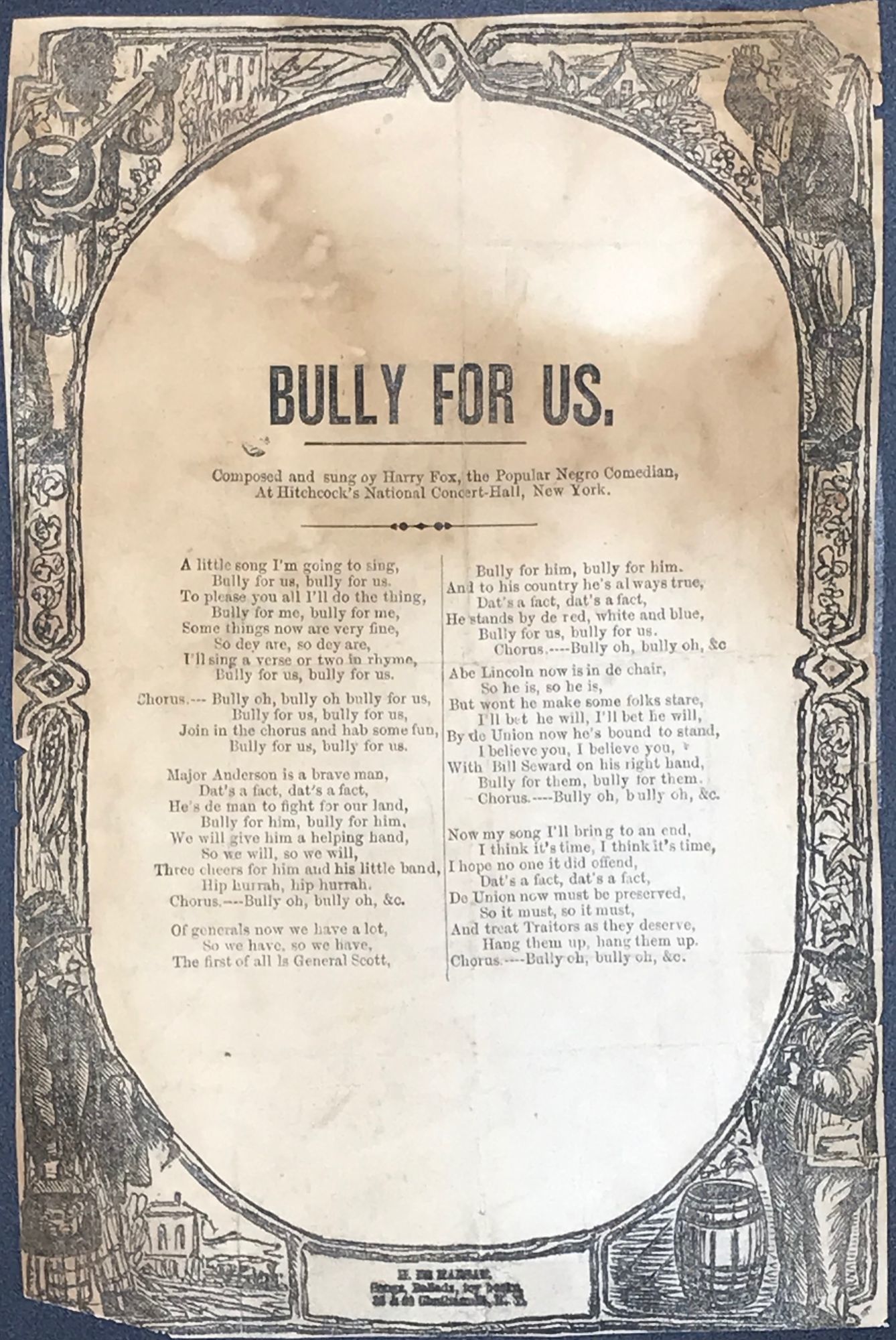 New York: H. de Marsan, 1861. First edition. Broadside song sheet, 8 3/4 x 5 3/4 inches (trimmed to edge of ornamental border), printing five verses and a chorus in two columns separated by a thin rule, and enclosed within a wide ornamental and illustrated border, with pictorial scenes in each corner, one featuring an African American playing a banjo. Abraham Lincoln ("now is in de chair"), General Winfield Scott, and Major Anderson (the defender of Fort Sumter) are featured in the lyrics. "De Union now must be preserved, … And treat Traitors as they deserve, Hang them up, hang them up." What little information we could find about Harry Fox seems to indicate that he was a Caucasian performing in blackface rather than an African American. OCLC locates two copies (Emory, New York Historical Society). Folded (browned, one archival tape repair on verso, some edgewear); still a good copy of an early Civil War song composed by an African American. (8599).
