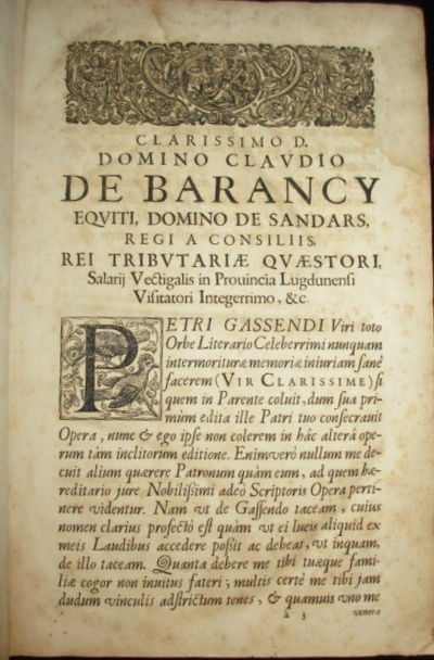 Lyon: Barbier, 1675. Full-Leather. Very Good. Folio. (9 1/2" x 14 3/4") Editio Tertia. Two volumes in one, volume I, i-xxvi[611] plus 1 blank; volume II,1-308[311-458 appendix] 24 (Index), [1] Privilege du Roy (lacks blank before appendix). Full sheep, gilt title on spine; Gassendi (1592-1655) is known as the "father of modern atomic theory" and in this work he uses the ideas of Epicurus as a starting point to explore and demonstrate the atomic nature of matter. The work concludes with appendices including the Syntagma, essays on money, the motion of planets and falling objects and the diet of animals. Endpapers with offsetting from an old cloth jacket, a few leaves with small wormholes, some light marginal dampstains, occasional browning and foxing to text; 2" loss of leather at spine ends, corners worn. Only one copy shows in the auction record. Very good.
