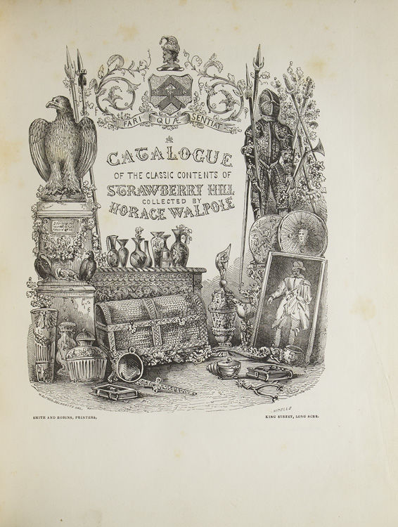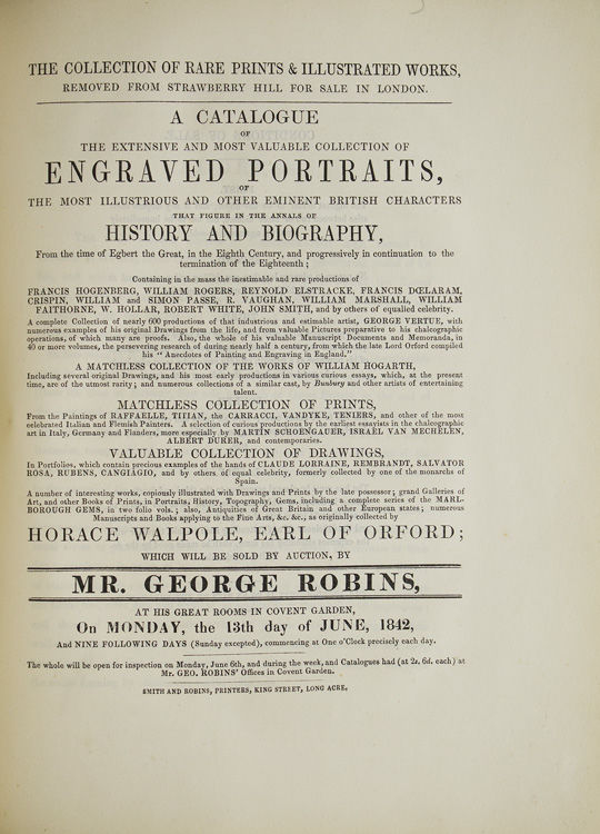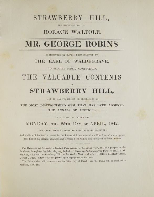 A Catalogue of the Classic Contents of Strawberry Hill Collected by Horace Walpole [woodcut title] ... Mr. George Robins is honoured ... to sell the valuable contents of Strawberry Hill … fixed for Monday, the 25th day of April, 1842 [And:] Aedes Strawberrianae [And:] The Collection of Rare Prints & Illustrated Works, Removed from Strawberry Hill for Sale in London … in Covent Garden, On Monday, the 13th day of June, 1842