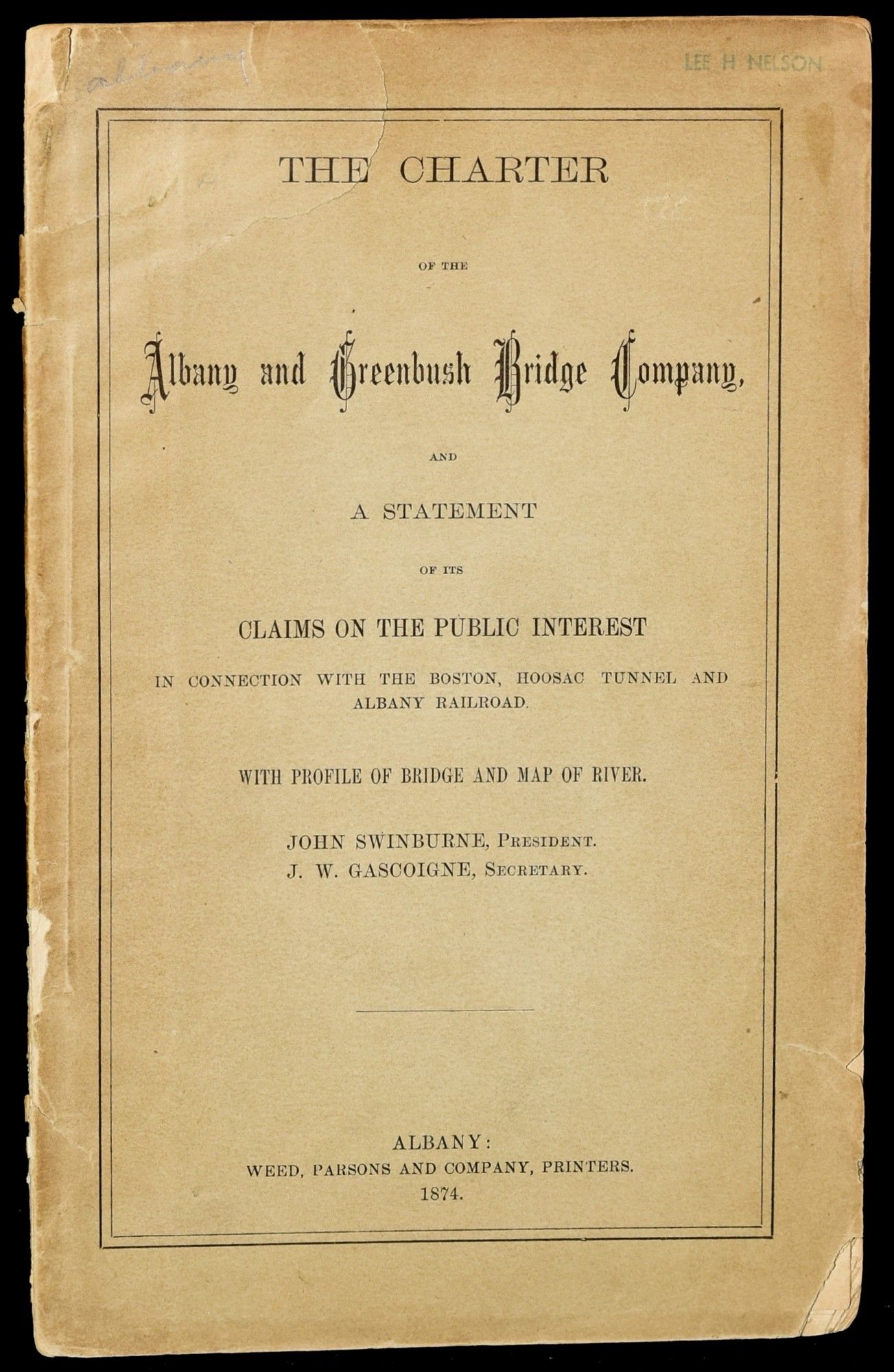 THE CHARTER OF THE ALBANY AND GREENBUSH BRIDGE COMPANY, AND A STATEMENT OF ITS CLAIMS ON THE PUBLIC INTEREST IN CONNECTION WITH THE BOSTON, HOOSAC TUNNEL AND ALBANY RAILROAD. WITH PROFILE OF BRIDGE AND MAP OF RIVER
