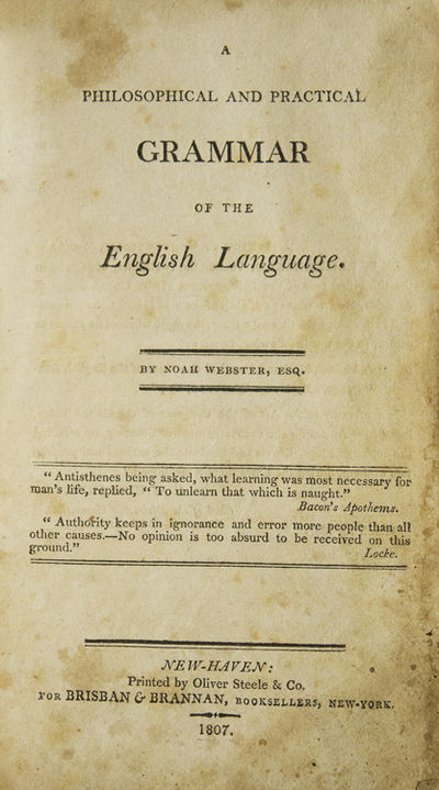 New Haven, CT: printed by Oliver Steele & Co for Brisban & Brannan, booksellers, New York, 1807. First edition. 250 pp. 1 vols. Small 8vo. Contemporary sheep. Rubbed, worn, stained but sound (front flyleaf with old tear, pen starts). Very good. First edition. 250 pp. 1 vols. Small 8vo. First edition of this scarce grammar by Webster, which he would later consider to be one of his two most important works. A second edition appeared in 1822, and the text was reused in the introductory matter of his famed American Dictionary (1828). Webster wrote to a friend in 1829, "My 'Philosophical and Practical Grammar" ... has been but little used: but, except for my quarto Dictionary, I consider it as altogether the most valuable work I have ever published..." Skeel 433; Sabin 102375