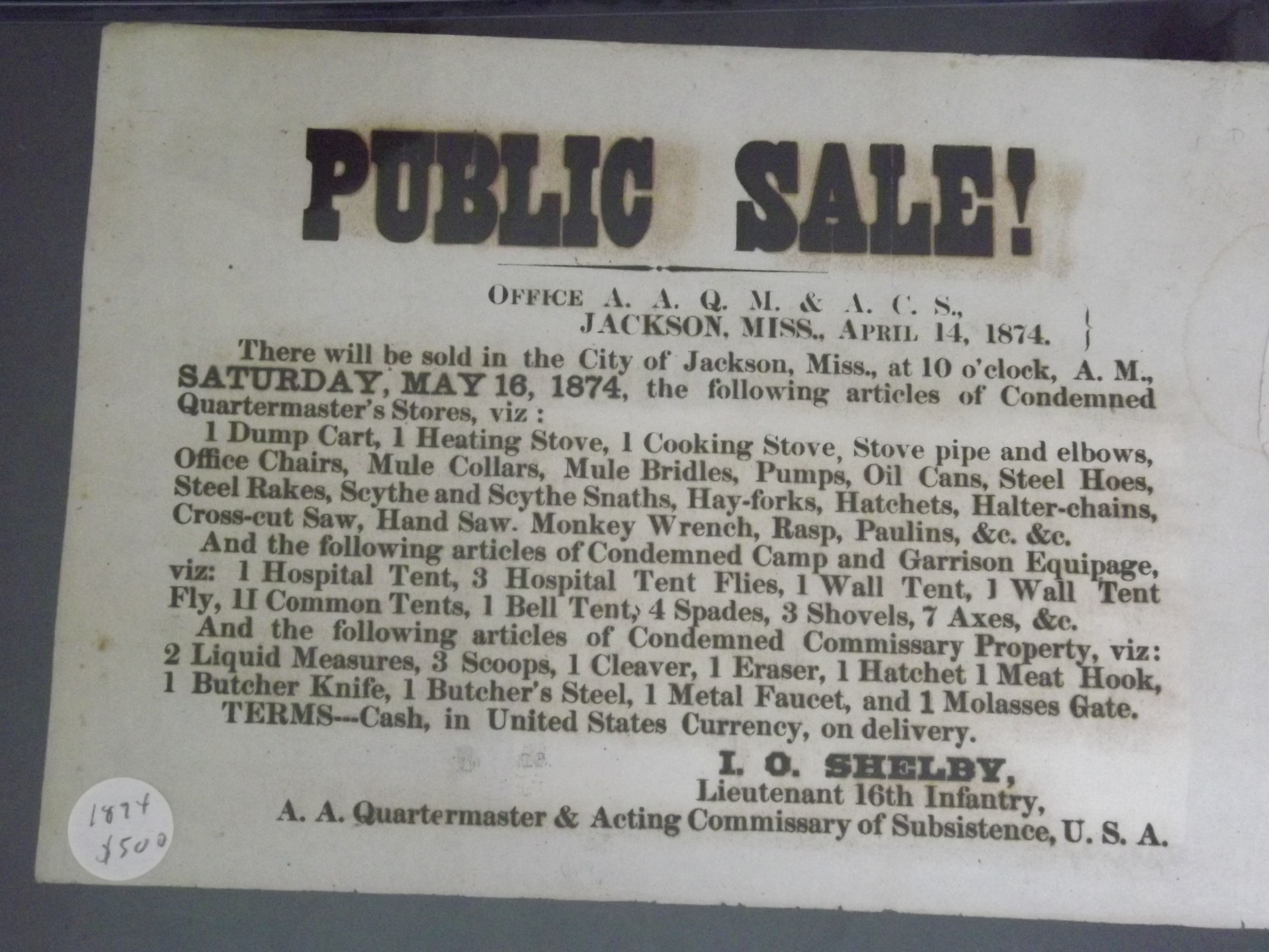 Broadside, folio sheet 12" x 8 1/2", body of text is 14 lines, excluding bold print title, and identifying description. One side slightly uneven, minor margin fold or tear, no impact on text, a little foxing, slight margin stain; otherwise very good. This broadside advertises the sale of "condemned quartermaster's stores," including "1 Dump Cart, 1 Heating Stove, 1 Cooking Stove, Stove pipe and elbows, Mule Collars, Mule Bridles, Pumps, Oil-Cans, Steel Hoes, Steel Rakes, Scythe and Scythe Snaths, Hay-forks, Hatchets, Halter-chains, Cross-cut Saw, Hand saw, Monkey Wrench, Rasp, Paulins. Additional stuff includes camp and garrison equipment. Terms are for cash on delivery. The sale was to be held under the purview of Lieutenant L. O. Shelby of the 16 Infantry, which is sign by him in print.