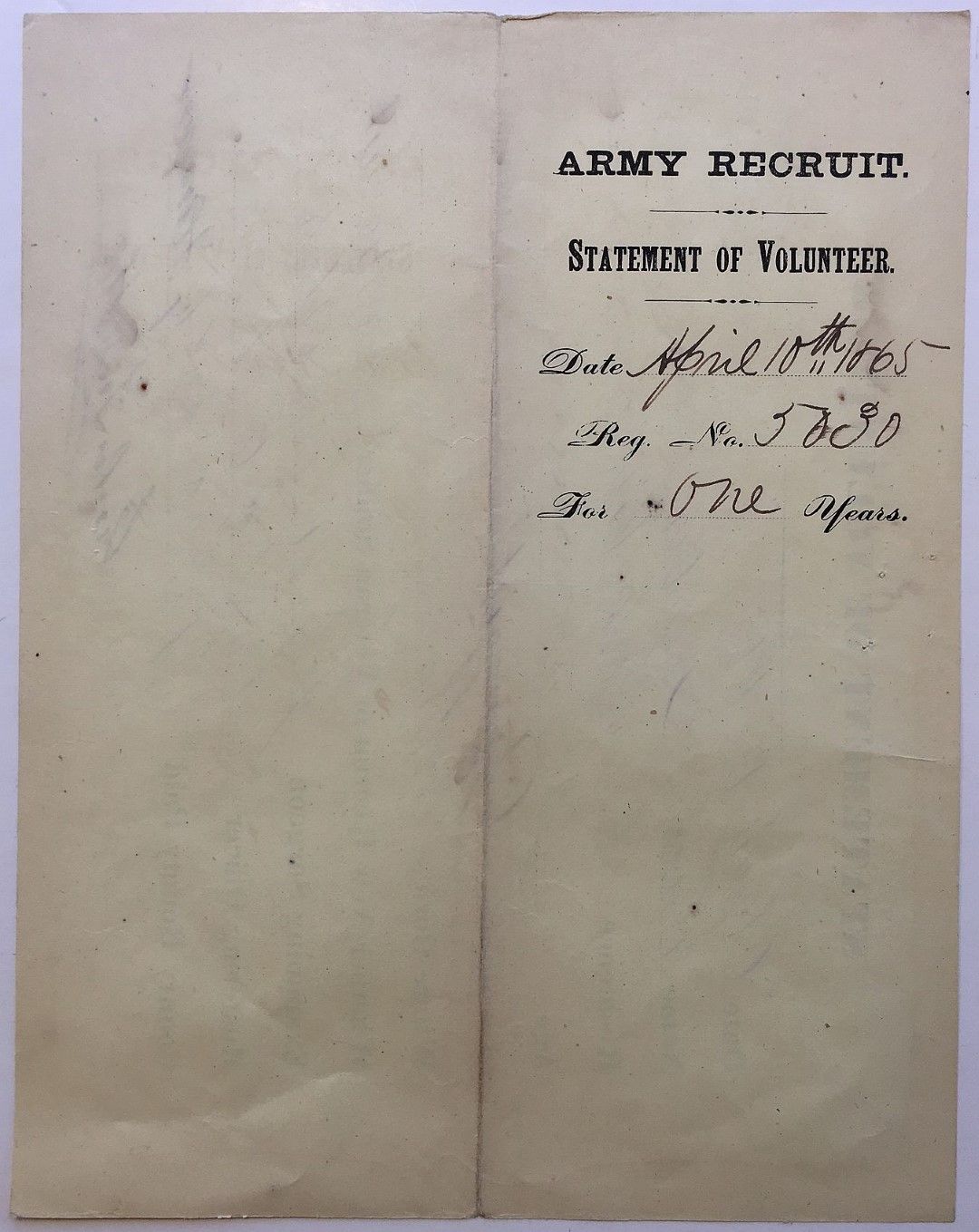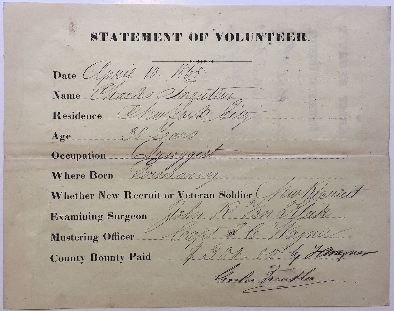 1865. unbound. On the day the war ends, a volunteer enlists in the Union Army and collects his $300 bounty! 1 page, 6.75 x 8.5 inches -- a Statement of Recruitment, whereby Freuter, a New York City druggist, age 30, is allowed to join the Union Army and receive his $300 bounty, on the very day the war has ended, April 10, 1865. Also signed by the Mustering Officer, Captain S. C. Wagner. Note: in the very last days of the war it was not uncommon for deceitful Mustering Officers to allow a bounty to be paid and then splitting the money with the Recruit. Very good(+) condition.