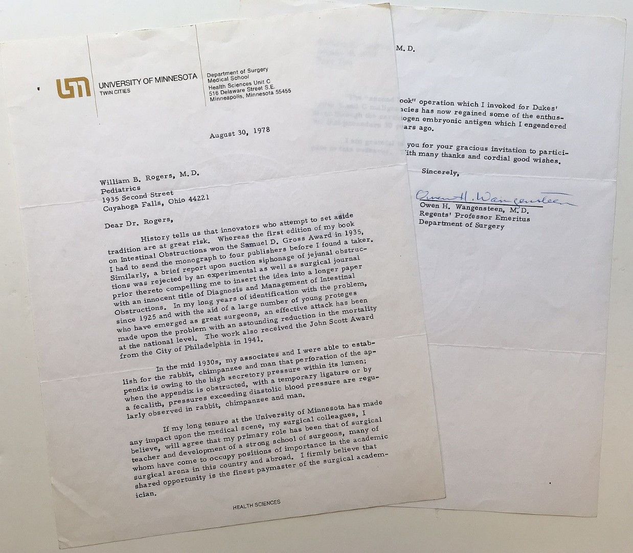 Minneapolis, 1978. unbound. 2 pages, 11 x 8.5 inches, Minneapolis, August 30, 1978, providing Dr. William B. Rogers with biographical information for an article, in small part: "...History tells us that innovators who attempt to set aside tradition are at great risk. Whereas the first edition of my book on Intestinal Obstructions won the Samuel D. Gross Award in 1935, I had to send the monograph to four publishers before I found a taker. Similarly, a brief report upon suction siphonage of jejunal obstructions was rejected by an experimental as well as surgical journal...In my long years of identification with the problem, since 1925 and with the aid of a large number of proteges who have emerged as great surgeons, an effective attack has been made upon the problem with an astounding reduction in the mortality at the national level...In the mid 1930s, my associates and I were able to establish for the rabbit, chimpanzee, and man that perforation of the appendix is owing to the high secretory pressure within its lumen; when the appendix is obstructed, with a temporary ligature or by a fecalith, pressures exceeding diastolic blood pressure are regularly observed..." Note: a postage stamp and commemorative coin have been proposed to honor career of Dr. Wangensteen. Near fine condition.
