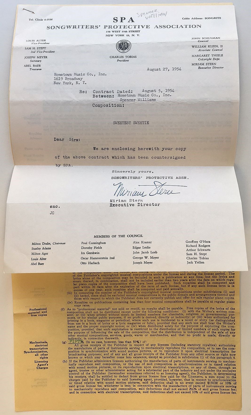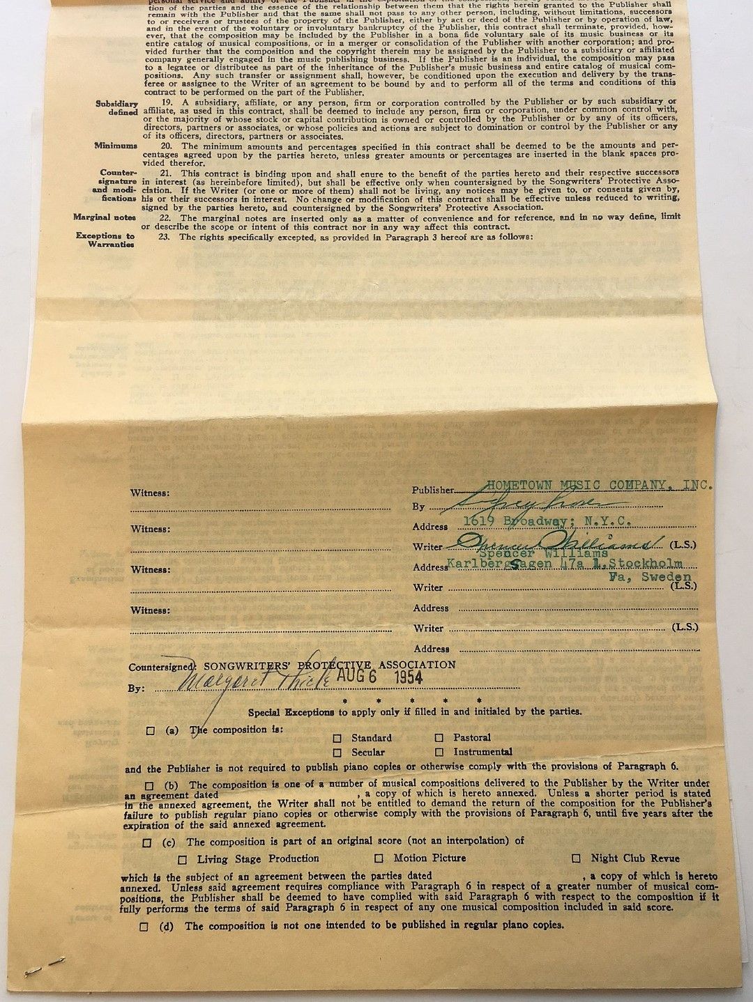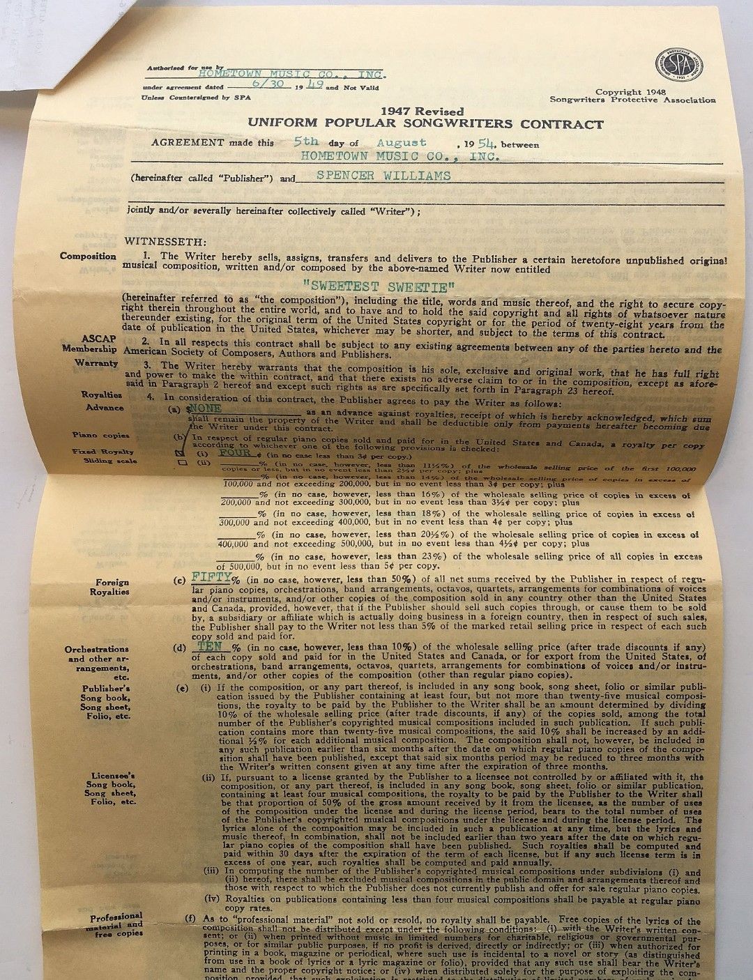 Village Music, 1954. unbound. 4 pages, 32.5 inches (when unfolded fully) x 8.5 inches, August 6, 1954, whereby Spencer Williams agrees to assign the copyright to his song "Sweetest Sweetie" to Sid Prosen at Hometown-Village Music in consideration of 50% of the collected royalties. Note: Williams died in 1965 and there is virtually nothing of his on the market. The Schomberg Library, arguably the largest repository of Black historical material in the United States, does not possess a single item in its permanent collection. He is much harder to obtain in autographic material than Bix Beiderbecke, Charlie Parker, and Theolonious Monk. Near fine condition.