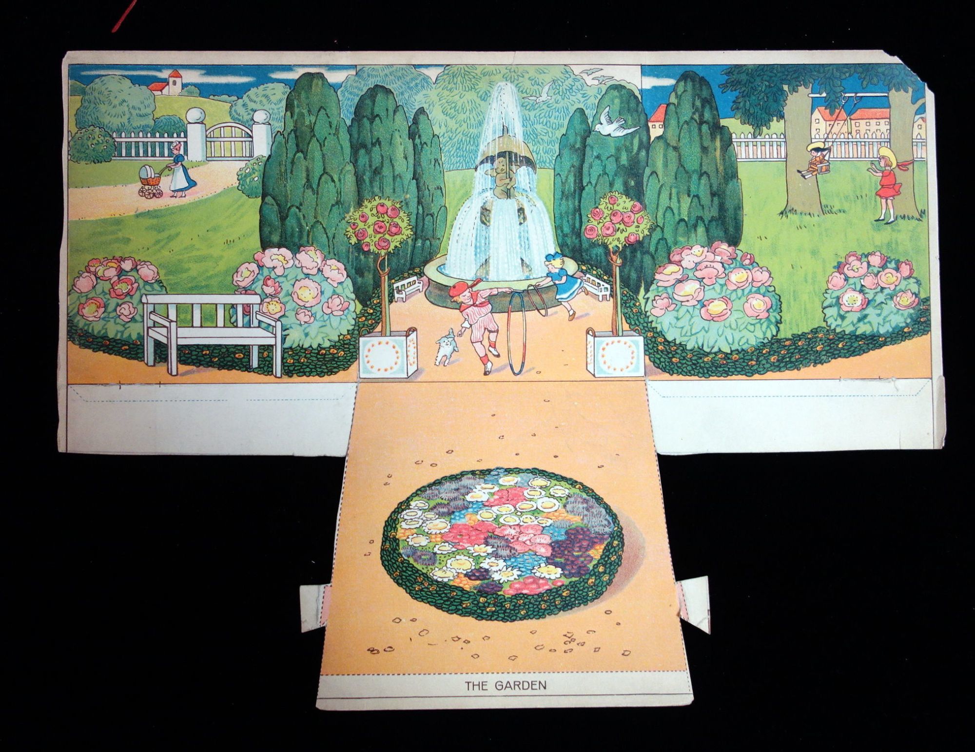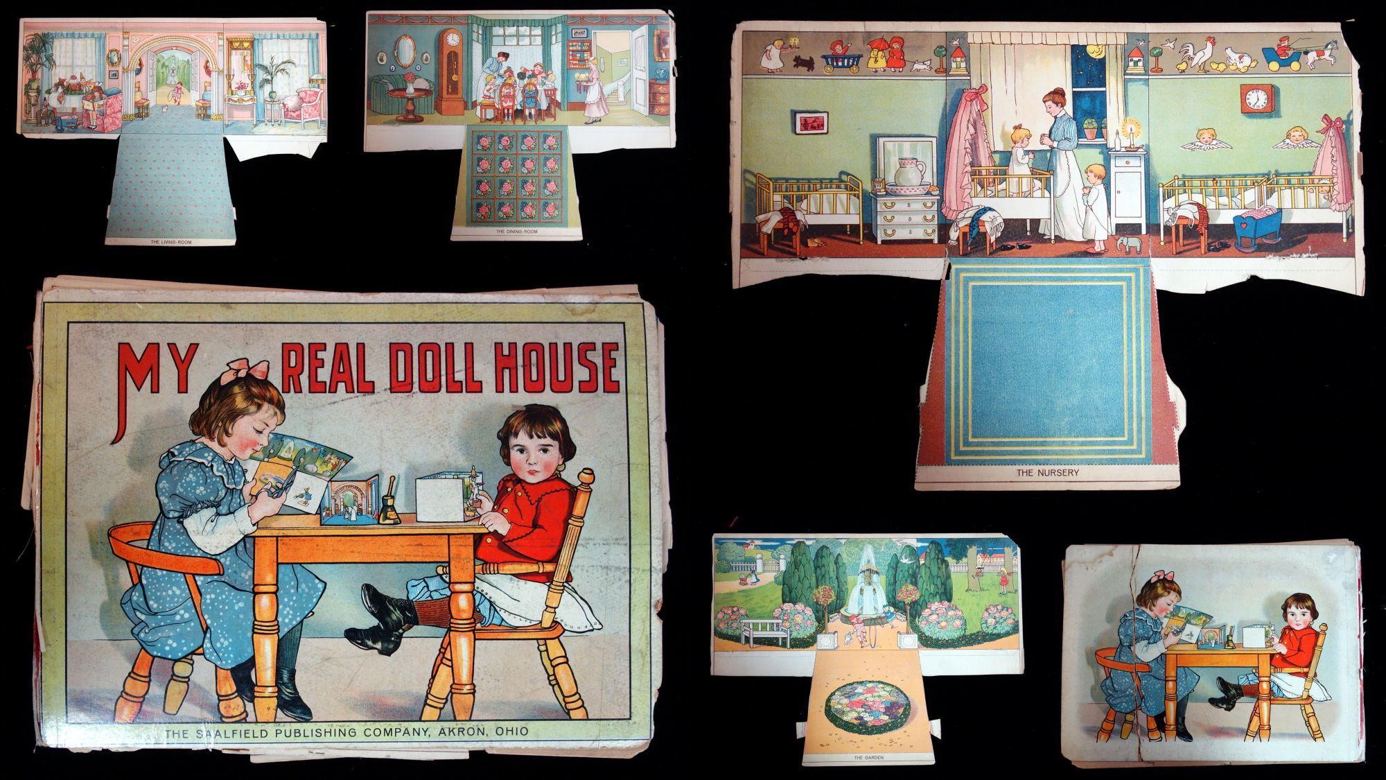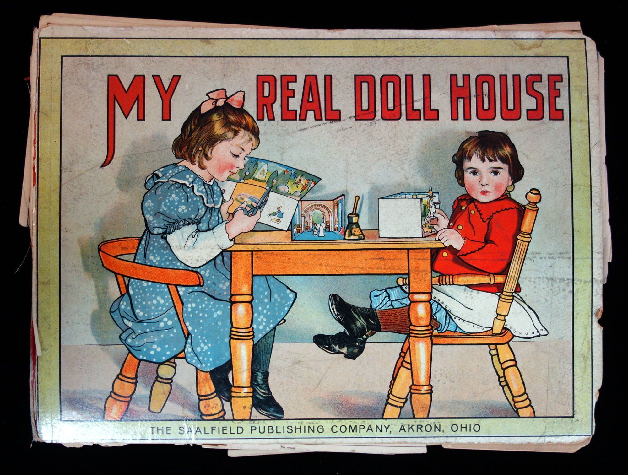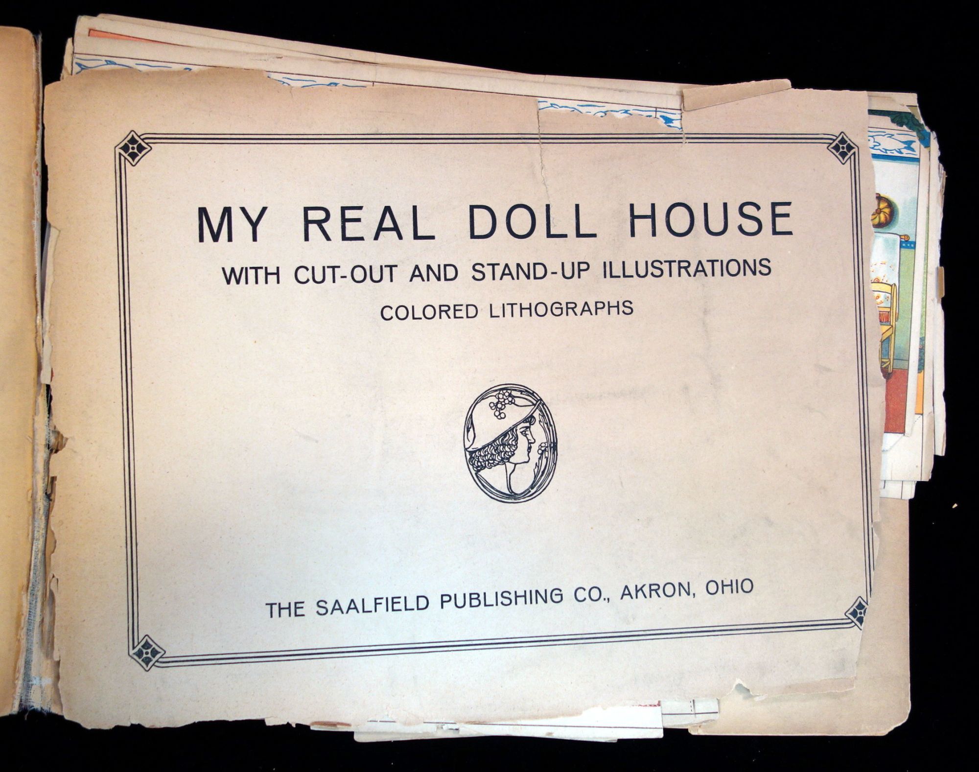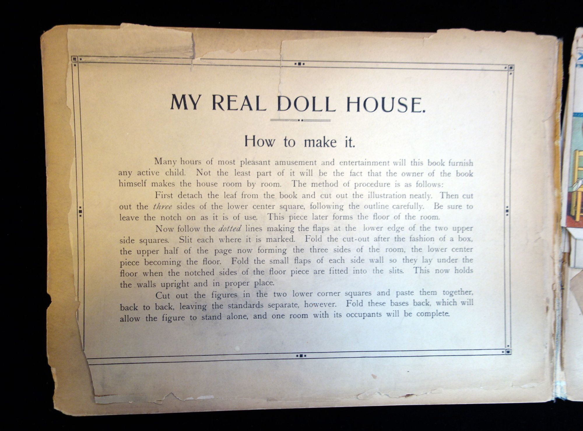Akron, Ohio: Saalfield Publishing Company, 1910. My Real Dollhouse is an activity book where each page when cut out and properly folded makes one room of the doll house. Along with the directions the following rooms are included the Kitchen, the Garden, the Play-Room Circus, the Living-Room, the Nursery, the Dining Room. The rooms are wonderfully charming colored lithographs depicting scenes in each room. The covers