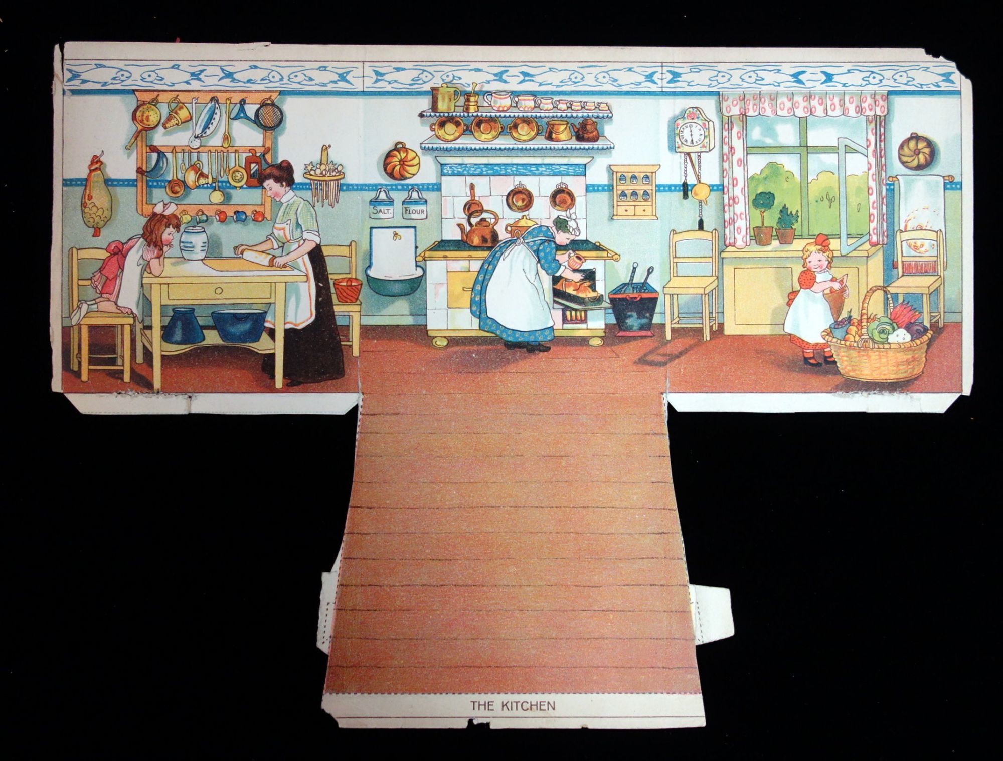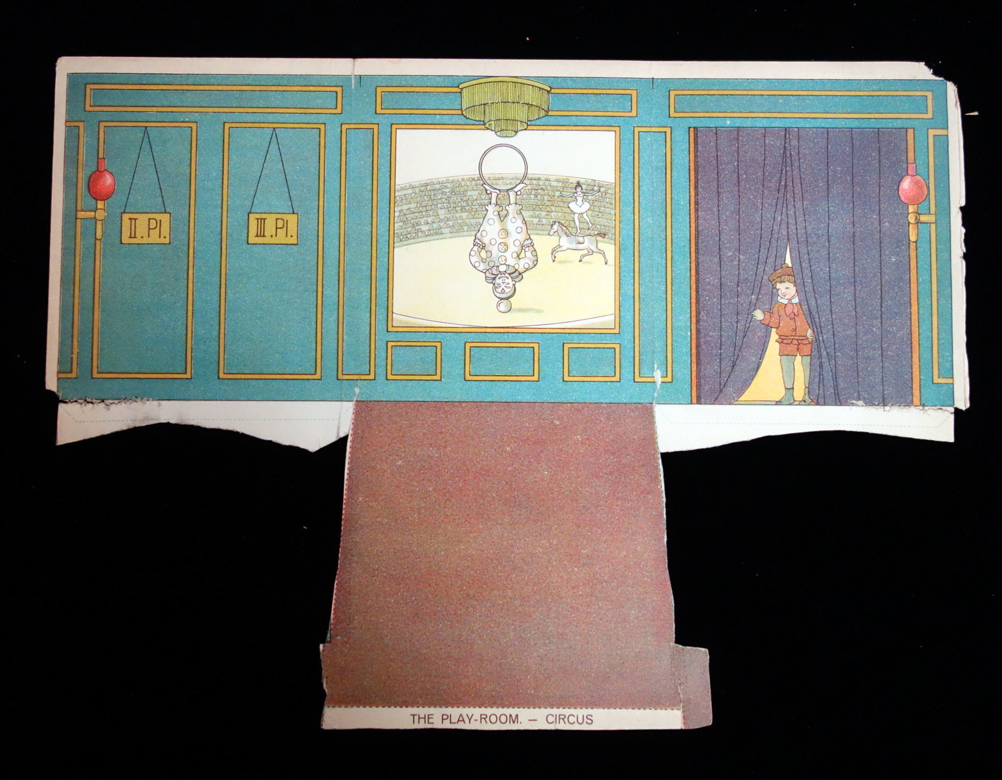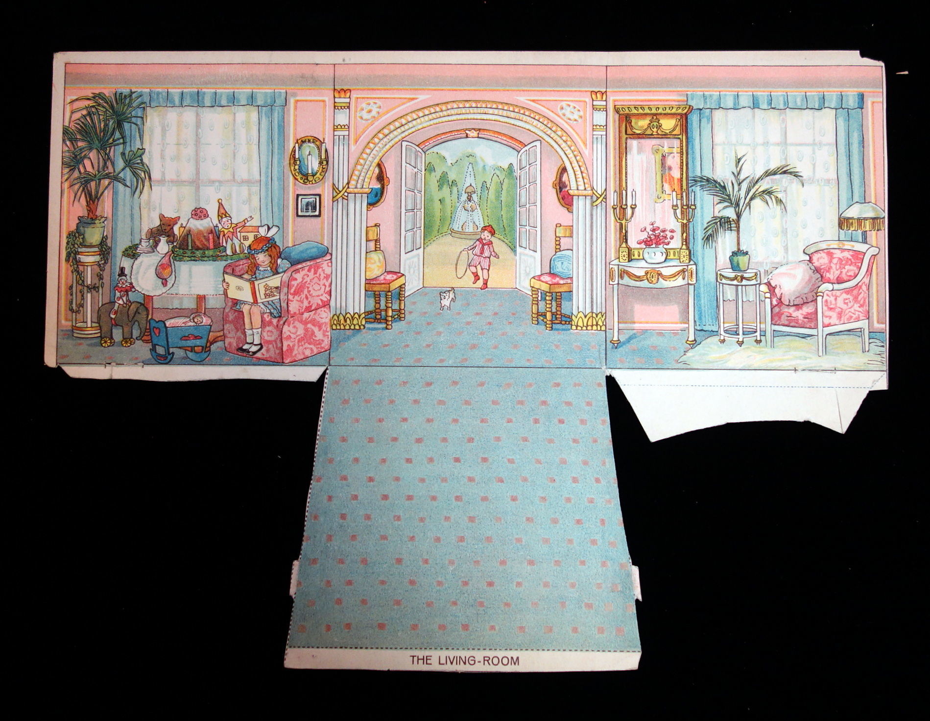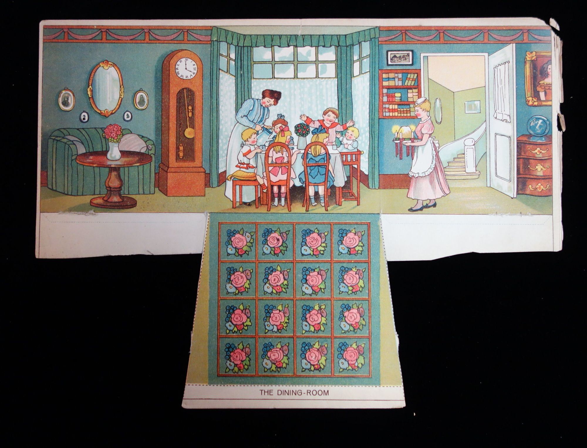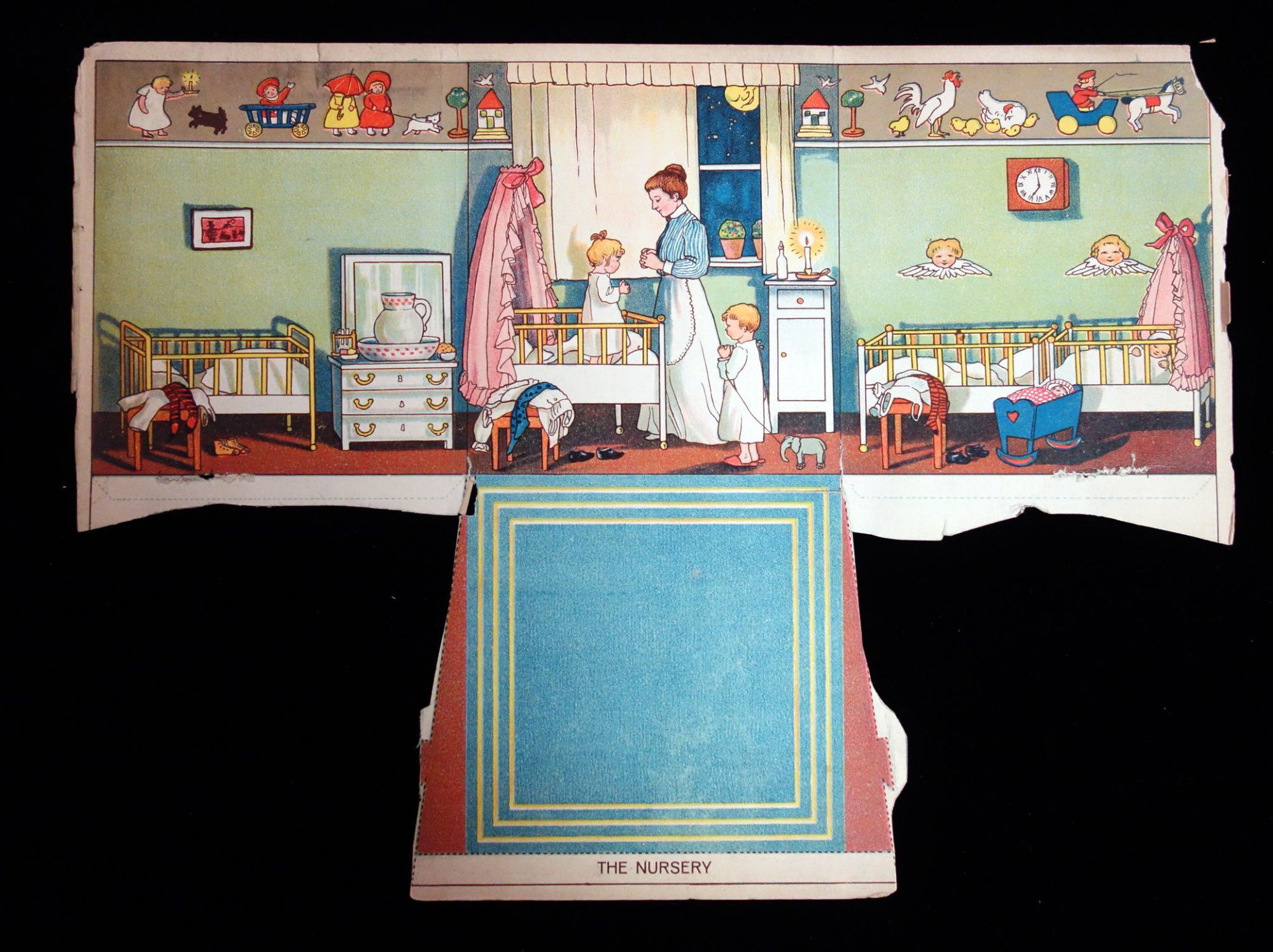 Measures 13" x 10" Heavy edge wear. The covers themselves are soiled and partially detached and the back cover has a section that is fully detached. The interior pages are fully detached, and the direction sheet is toned and brittle due to age. The rooms themselves have some edge wear and are tone, and cut out. There are crease marks where they were folded in order to make them stand, and in some cases there are slight tears along these folds.