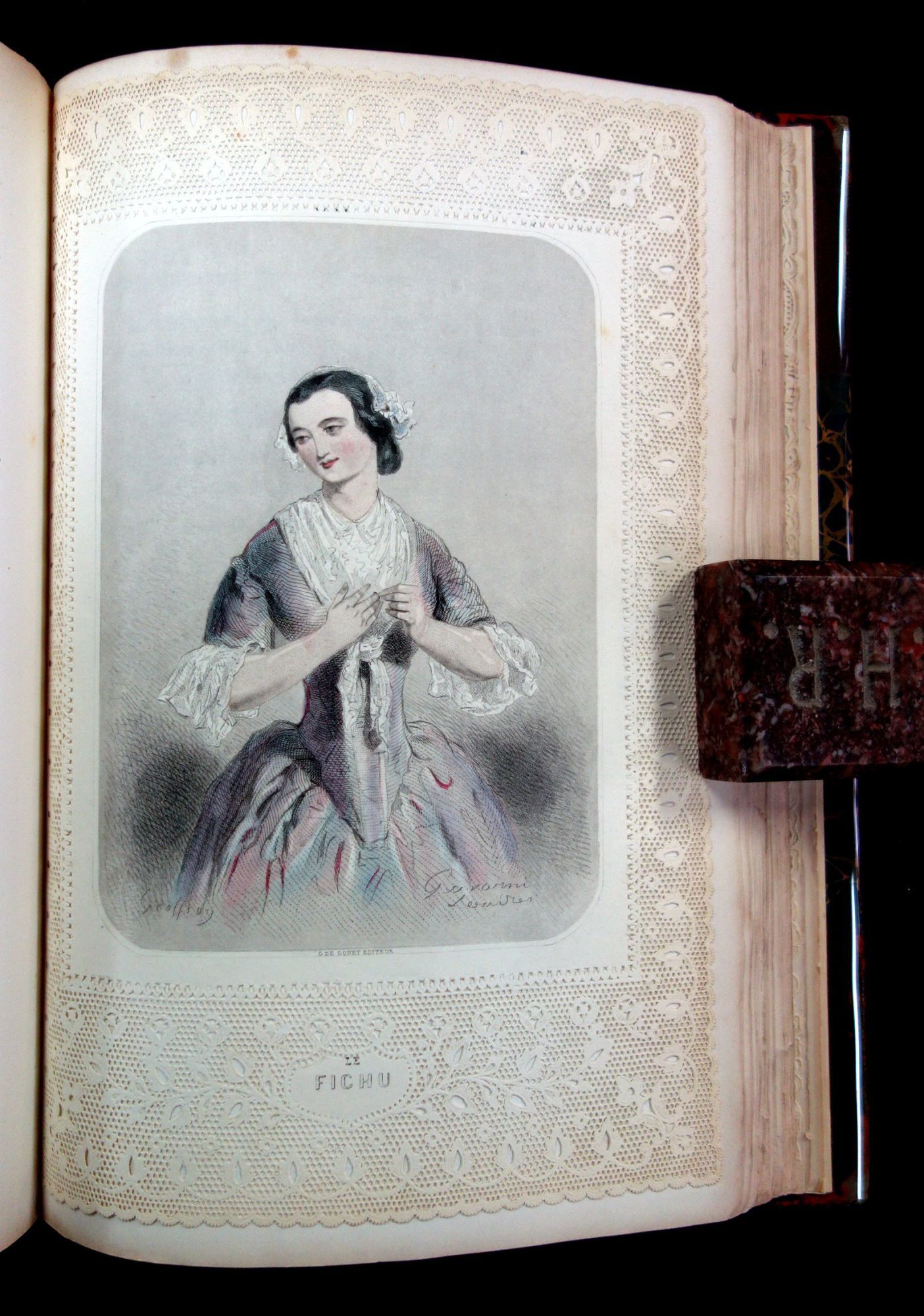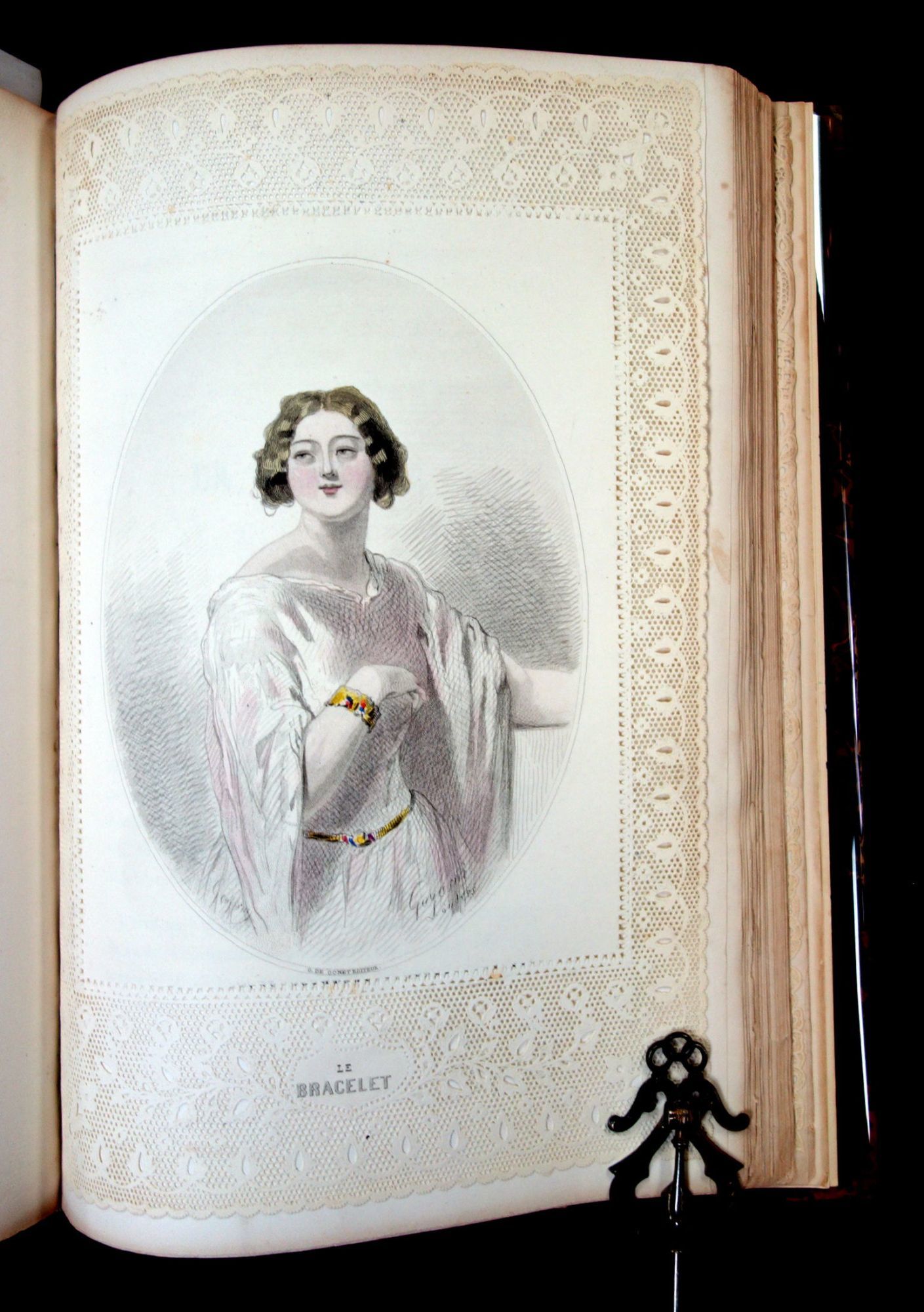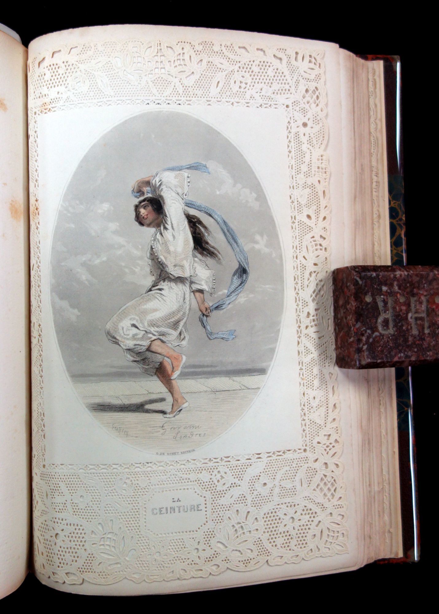 Volume two of two with frontispiece and 15 plates engraved by Geoffroy after Gavarni, all in two states, on chine monté, and on elegantly coloured and printed papier vélin with borders cut to lace patterns. 8vo. Steel engravings are printed and delicately coloured on paper with borders cut to various lace patterns, or "decoupées en dentelles". Ex. Library Metropolitan Museum of Art, New York.